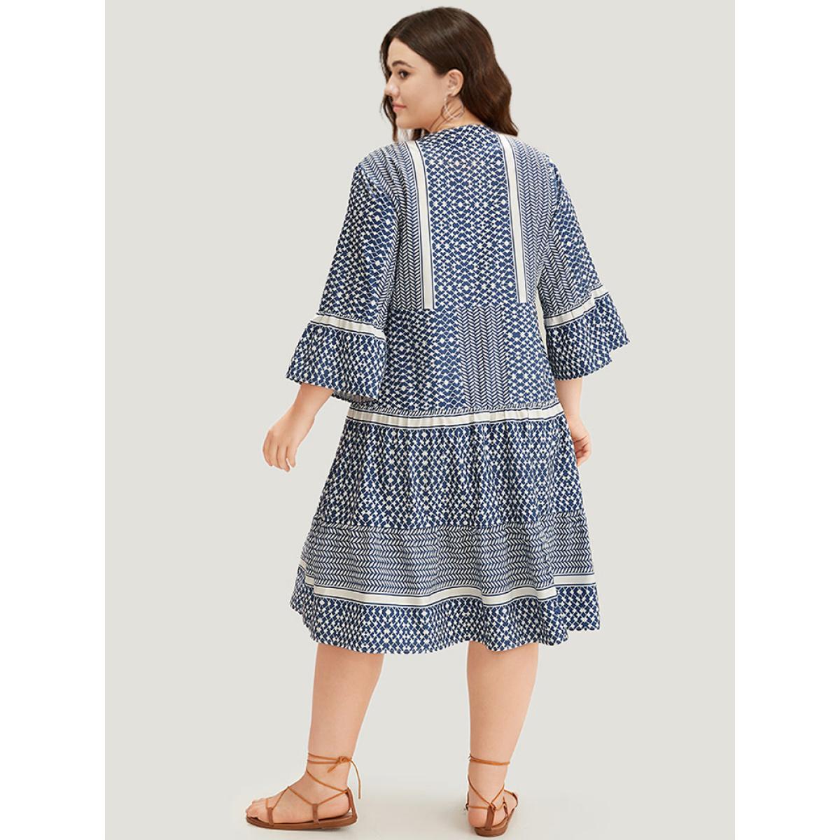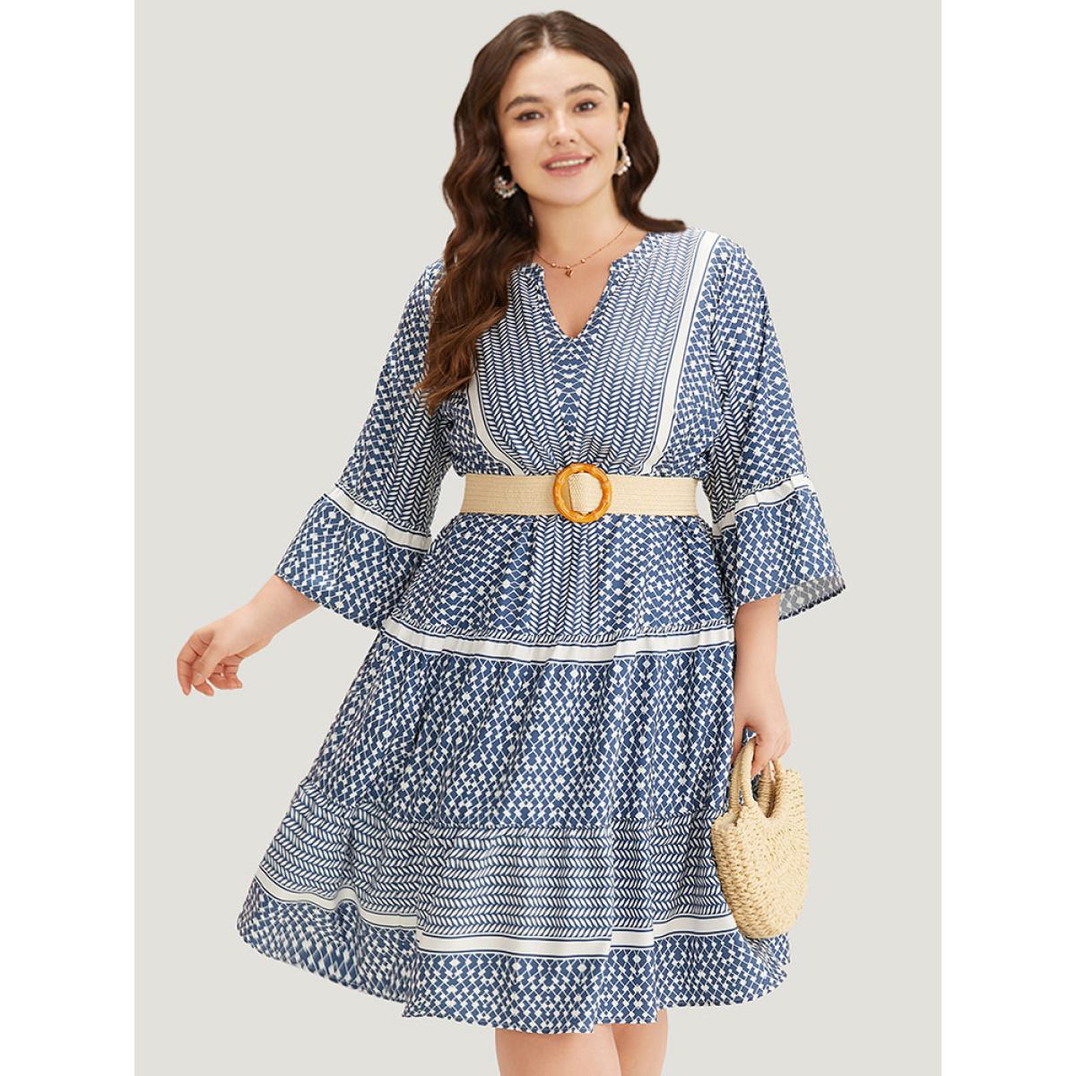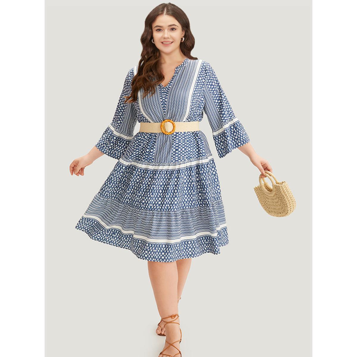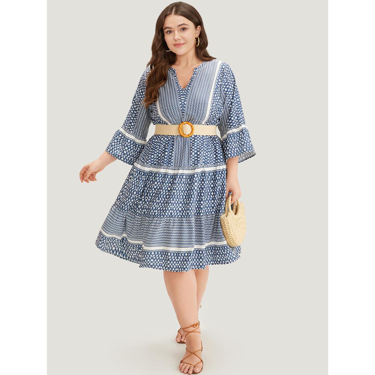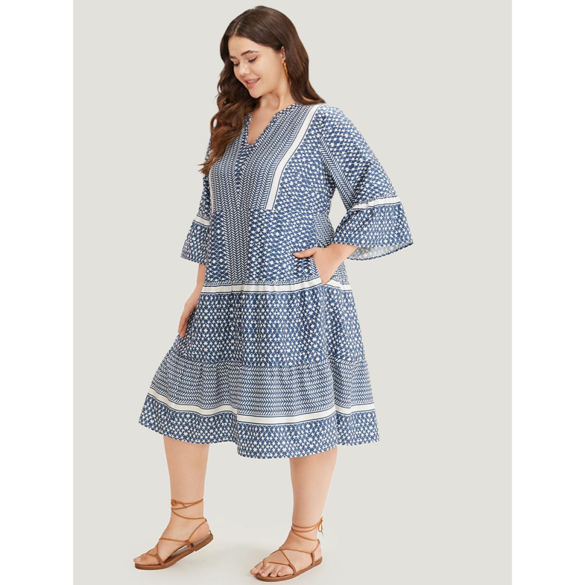 Plus Size Bandana Print Notched Pocket Patchwork Dress Stone Women Vacation Gathered Notched collar Elbow-length sleeve Curvy Midi Dress BloomChic 22-24/3X