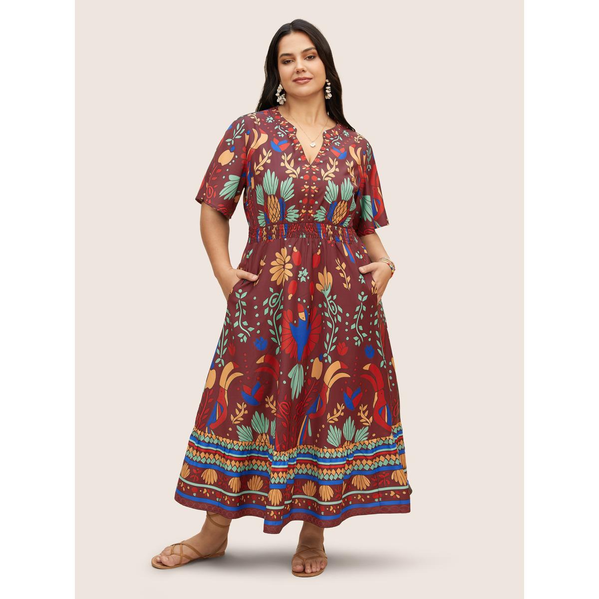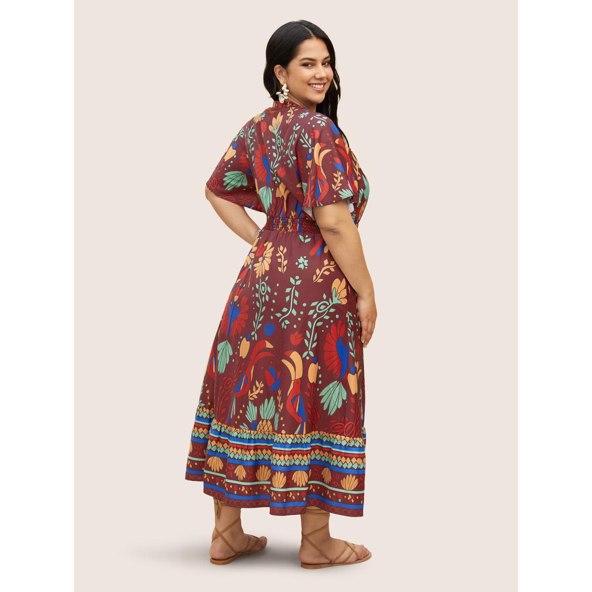 Plus Size Bandana Print Shirred Elastic Waist Flutter Sleeve Dress Burgundy Women Resort Shirred Flat collar with V-notch Short sleeve Curvy BloomChic 14-16/1X