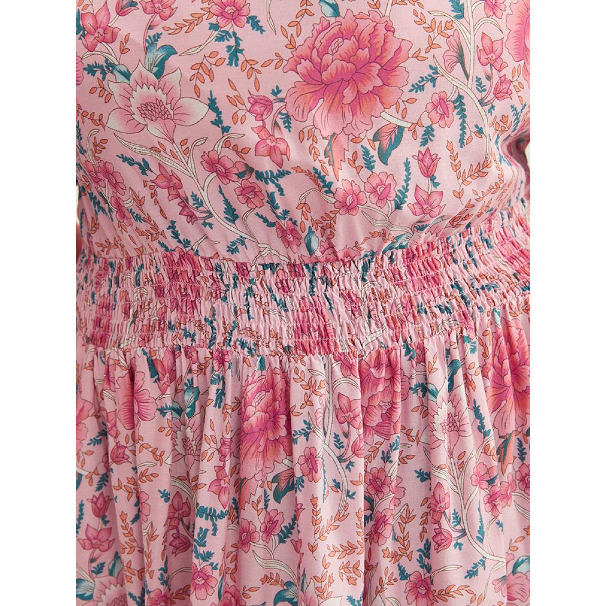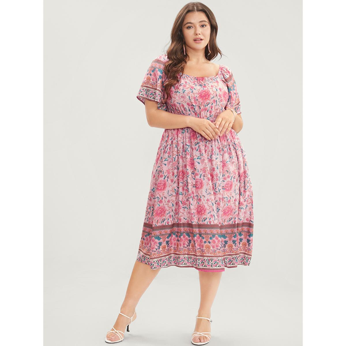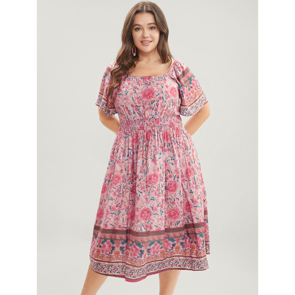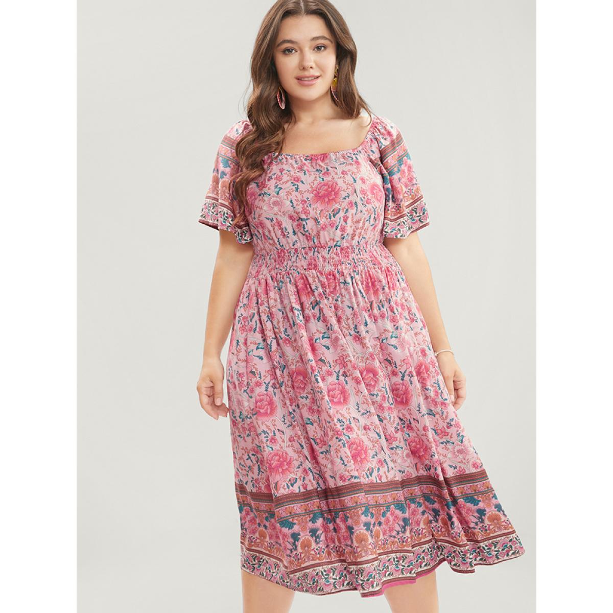 Plus Size Bandana Print Square Neck Pocket Ruffles Shirred Dress Pink Women Vacation Pocket Square Neck Short sleeve Curvy Knee Dress BloomChic 28/5X