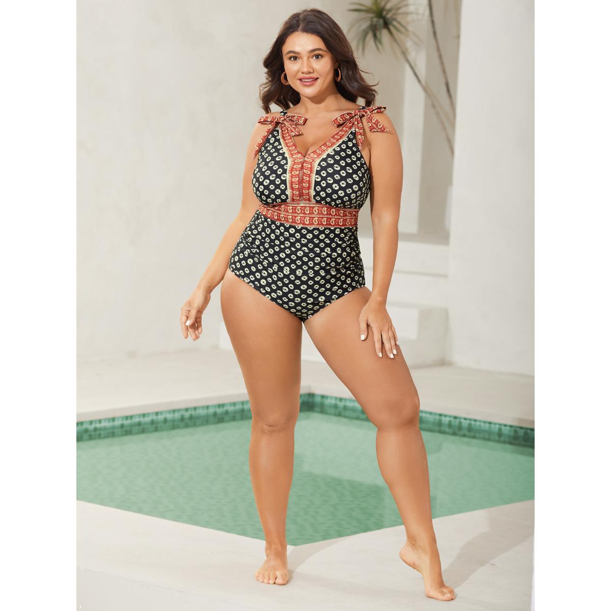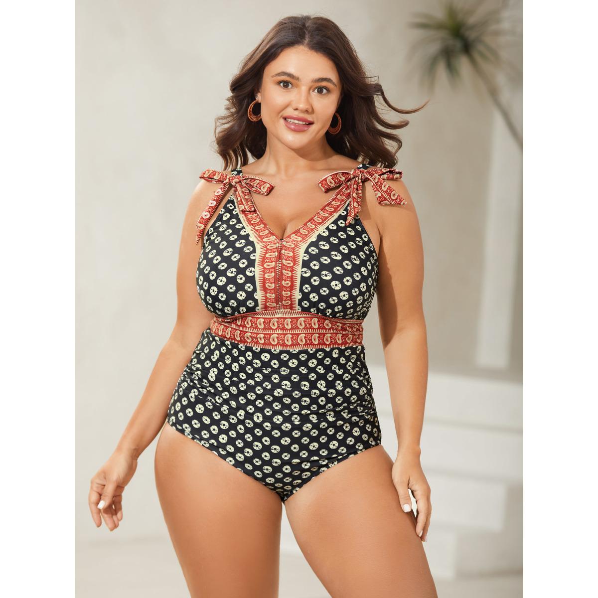Plus Size Bandana Print Two Tone Knotted One Piece Swimsuit Women's Swimwear Black Beach Non Curve Bathing Suits No stretch One Pieces BloomChic 10/M