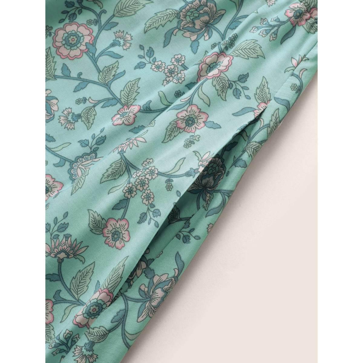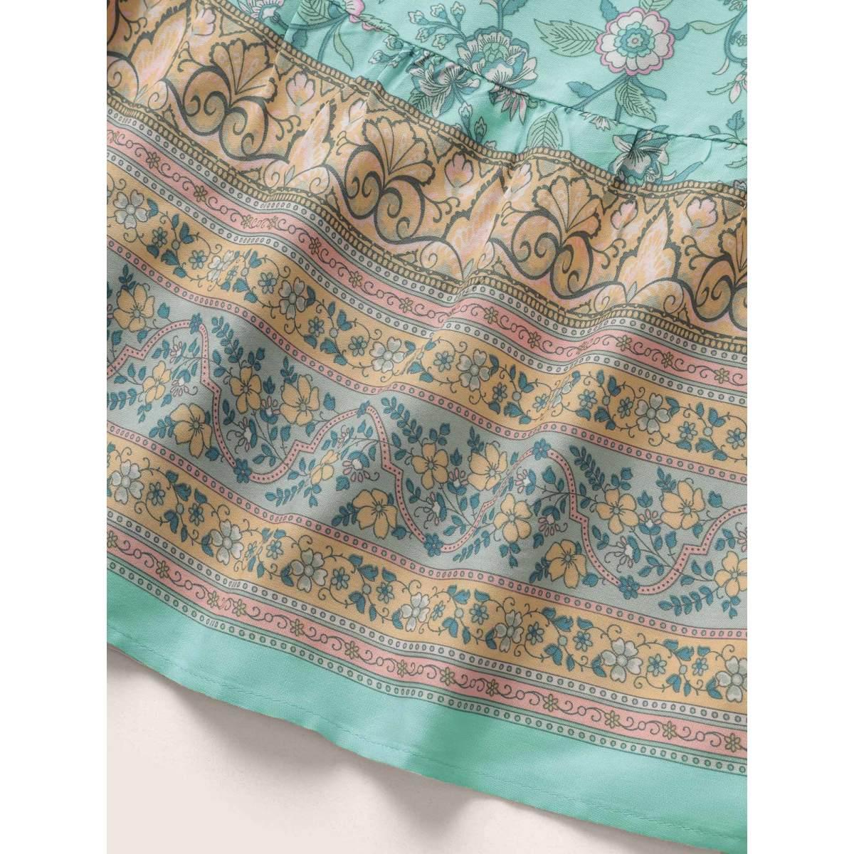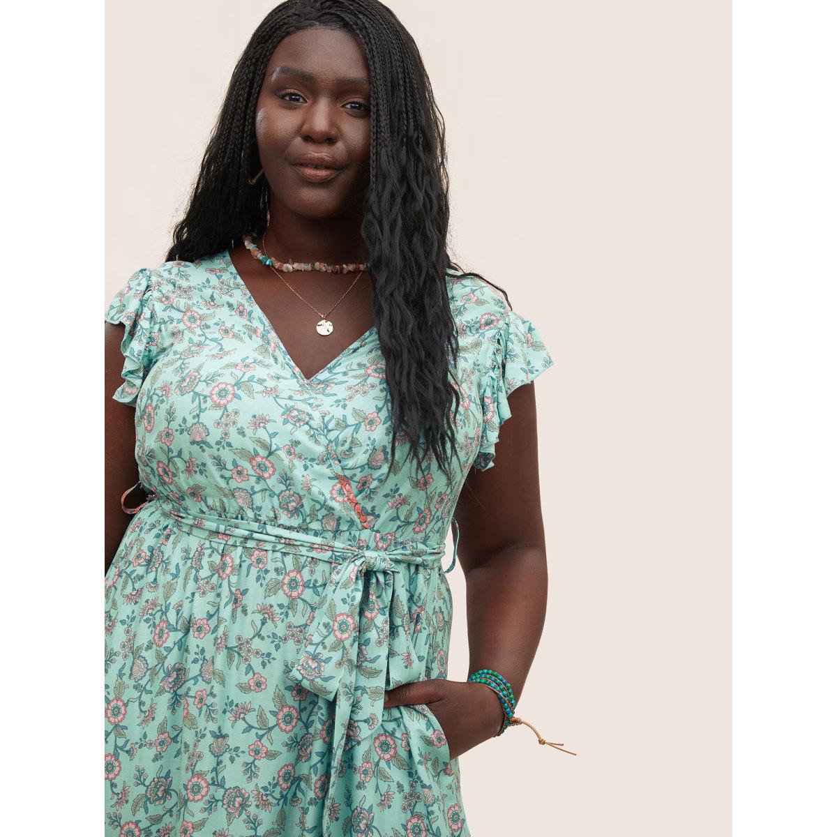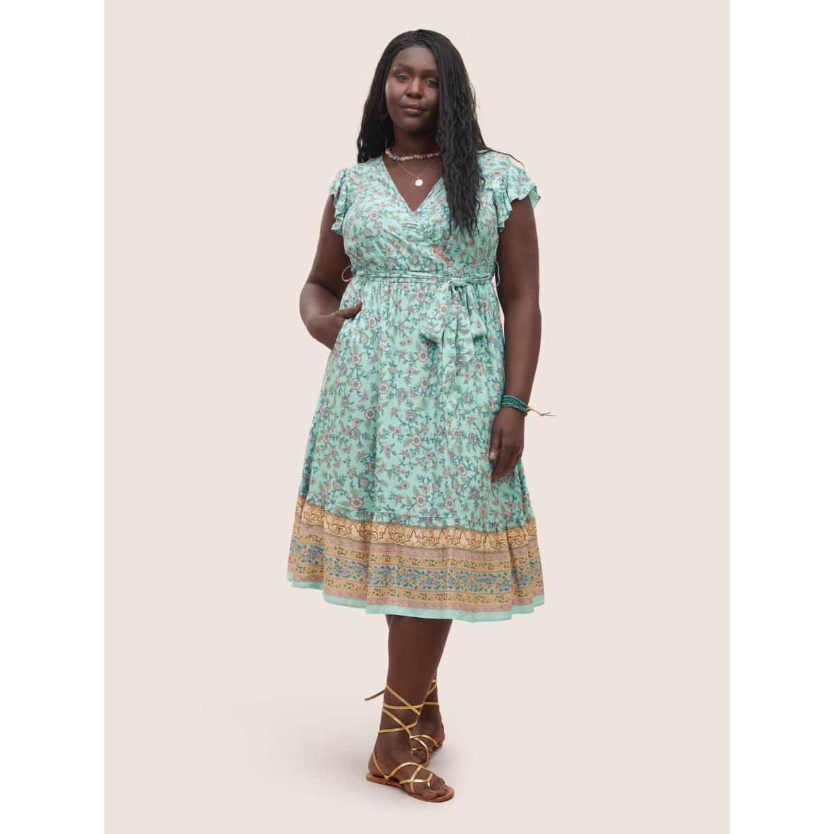 Plus Size Bandana Ruffles Wrap Elastic Waist Belted Dress Turquoise Women Resort Non Overlap Collar Sleeveless Curvy Midi Dress BloomChic 18-20/2X