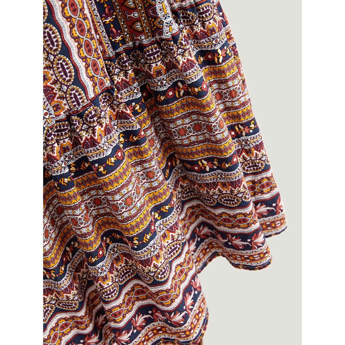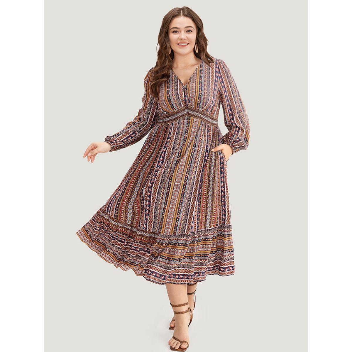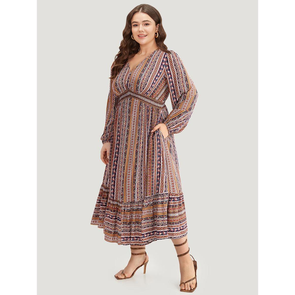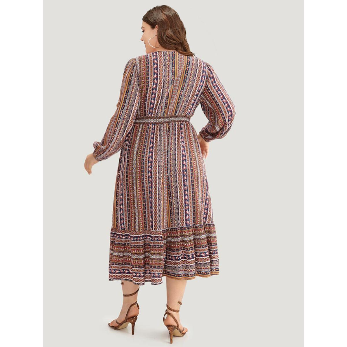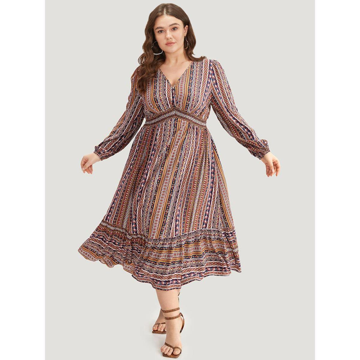Plus Size Bandana Striped Lantern Sleeve Patchwork Dress DarkBlue Women Vacation Elastic cuffs V-neck Long Sleeve Curvy Midi Dress BloomChic 30/6X