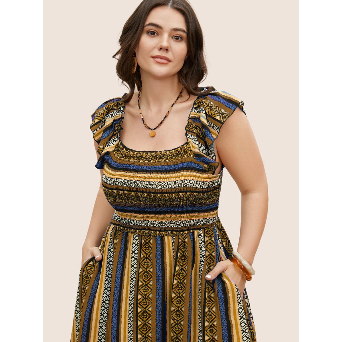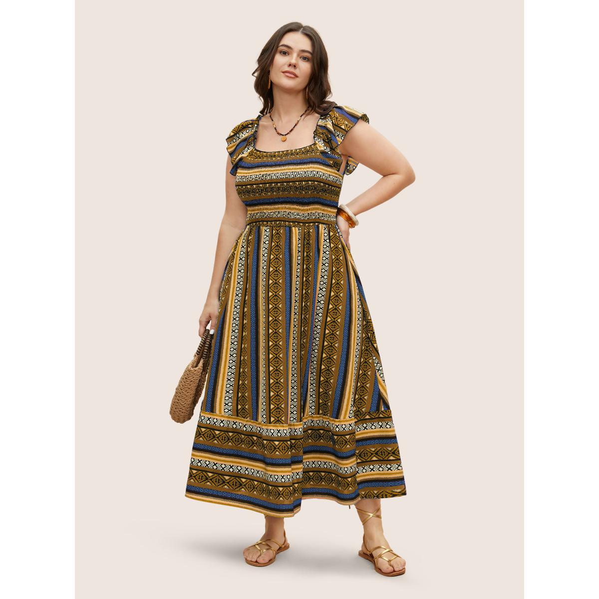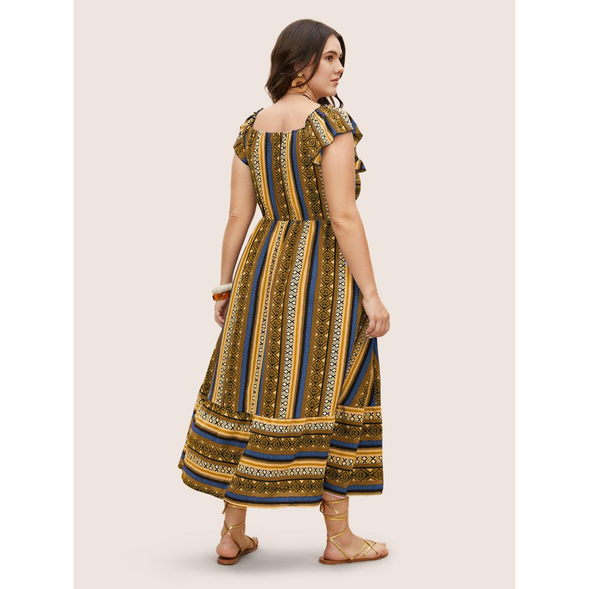 Plus Size Notched Bandana Geometric Ruffle Sleeve Dress Yellowishbrown Women Resort Ruffles Flat collar with V-notch Elbow-length sleeve Curvy BloomChic 28/5X
