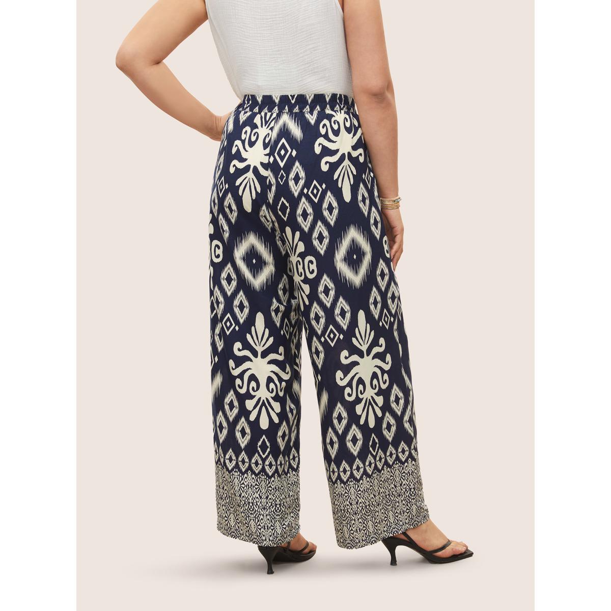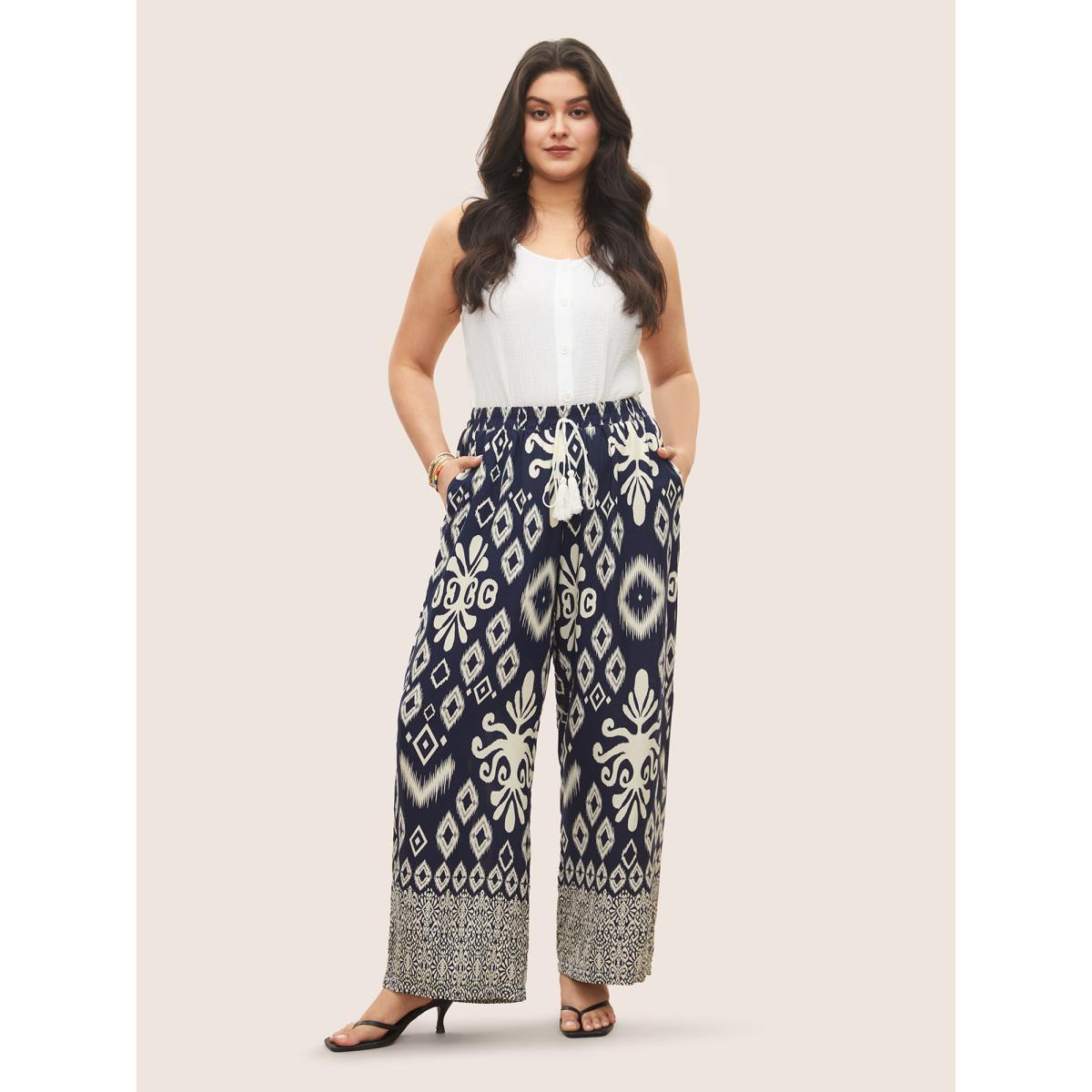 Plus Size Damask Print Tassel Straight-Leg Pants Women DarkBlue Boho Wide Leg Mid Rise Vacation Pants BloomChic 14-16/1X
