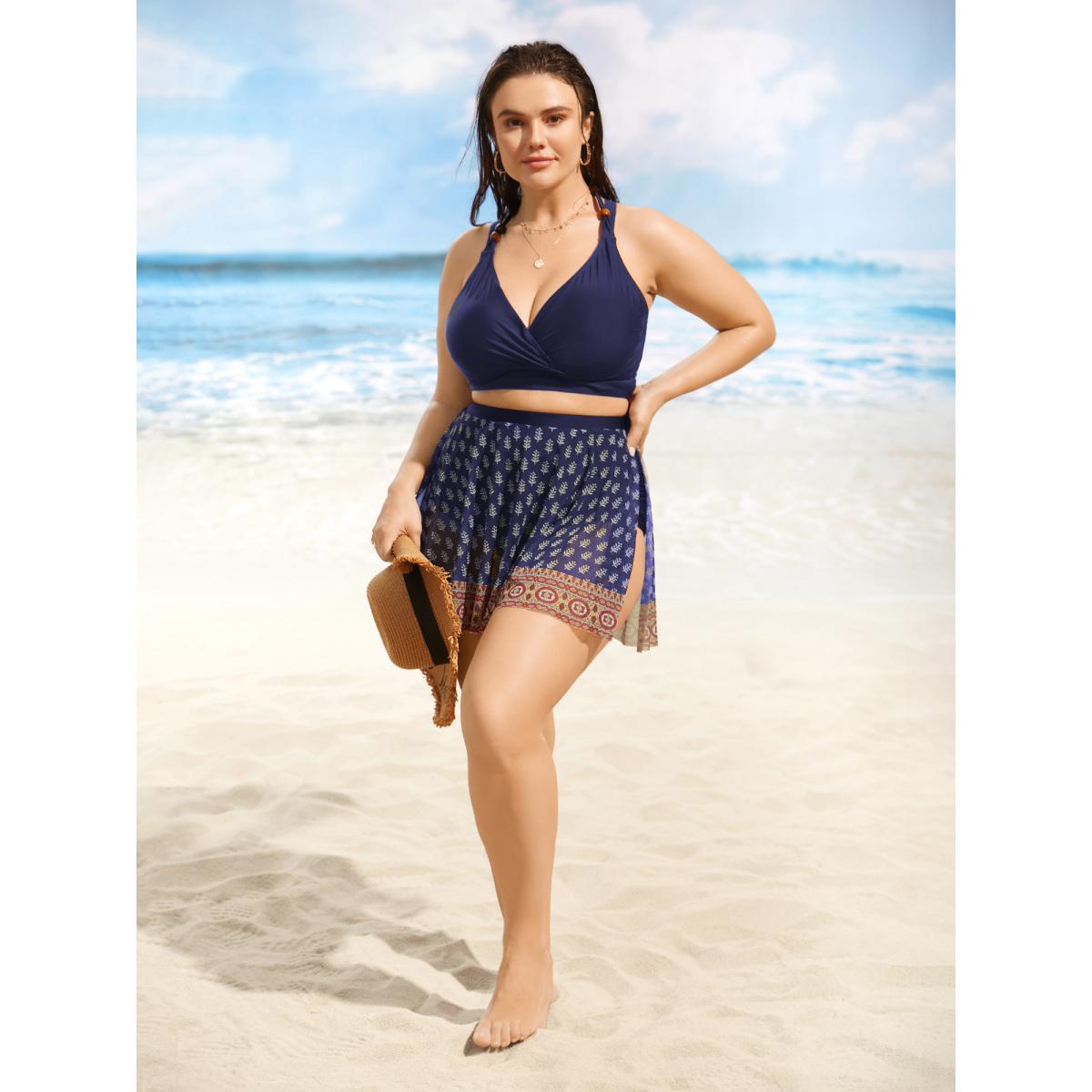 Plus Size Bandana Tie Knot Slit Hem Swim Bottom Women's Swimwear Indigo Beach Tie knot High stretch Bodycon High Rise Curve Swim Bottoms BloomChic 14-16/1X