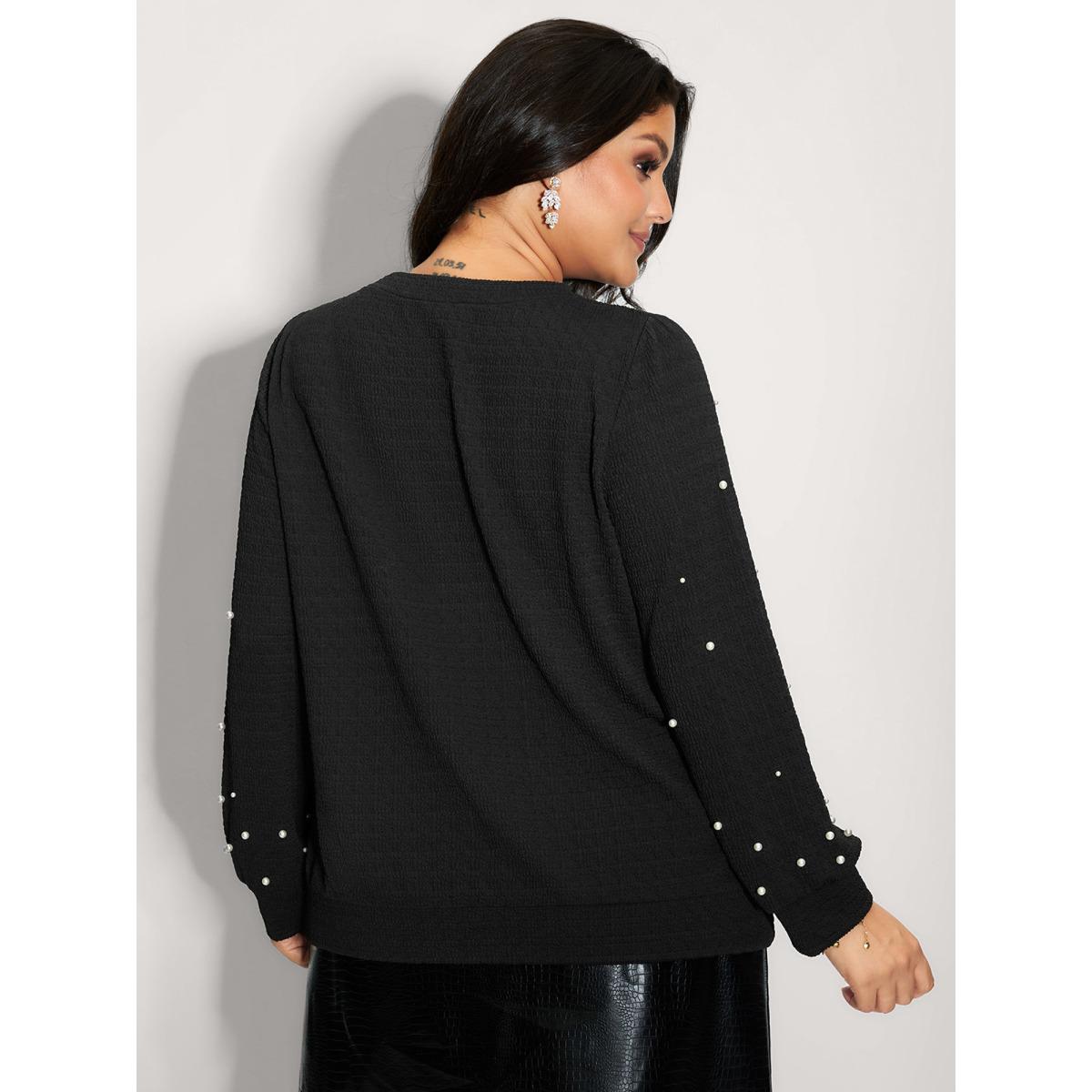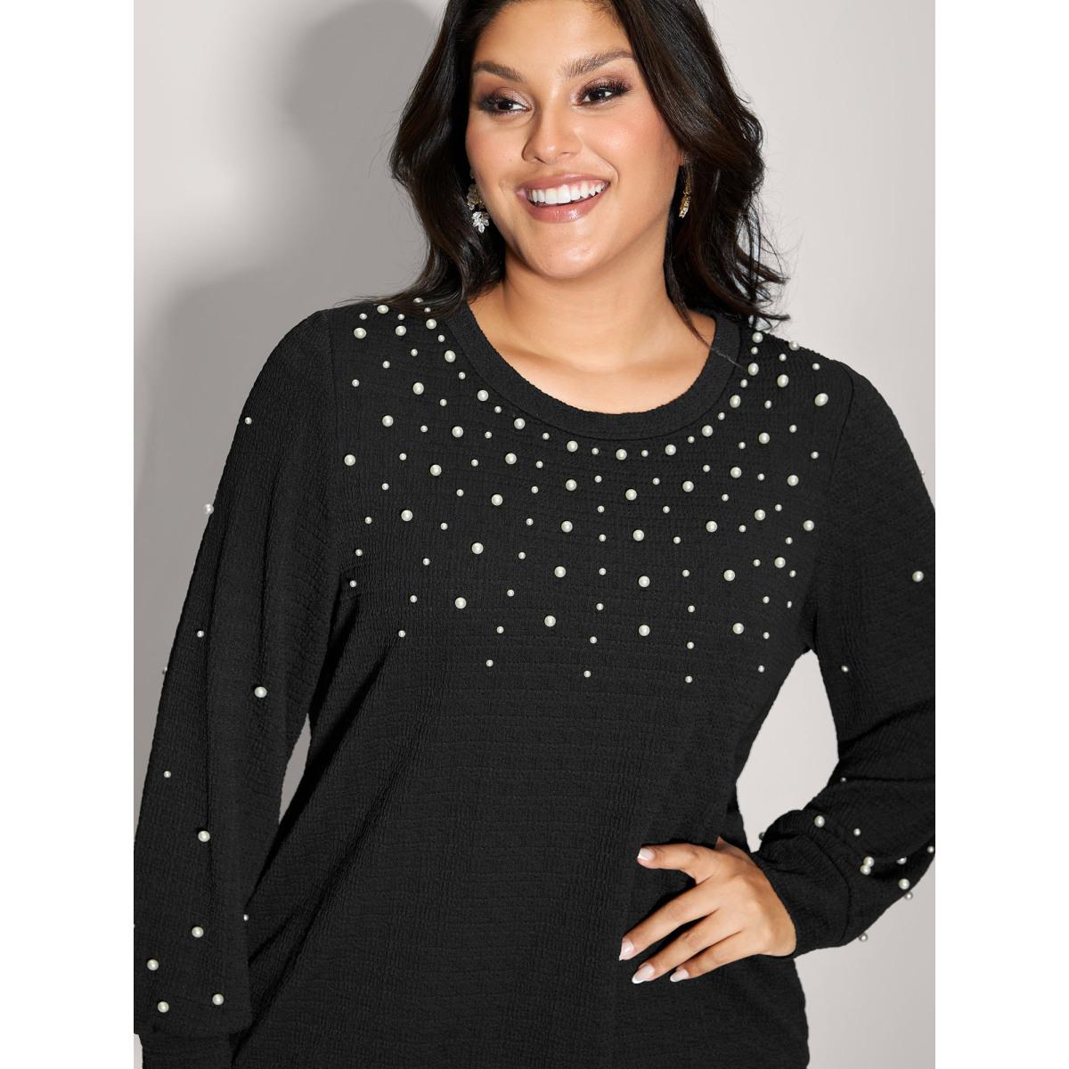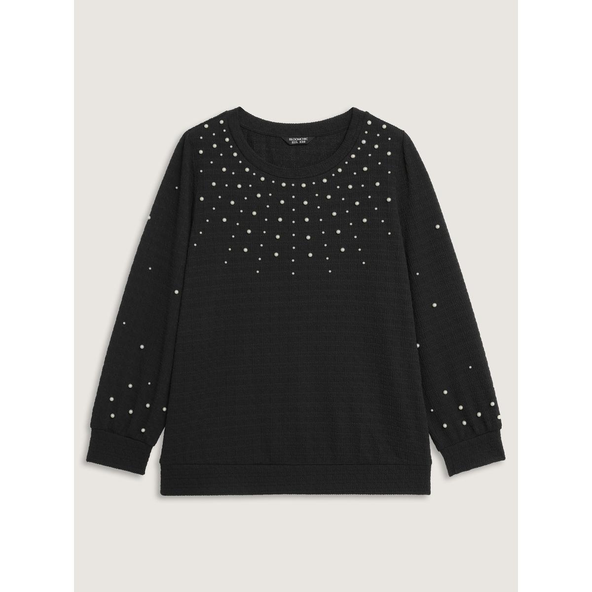 Plus Size Solid Texture Pearls Beaded Sweatshirt Women Black Party Beaded Round Neck Going out Sweatshirts BloomChic 14-16/1X