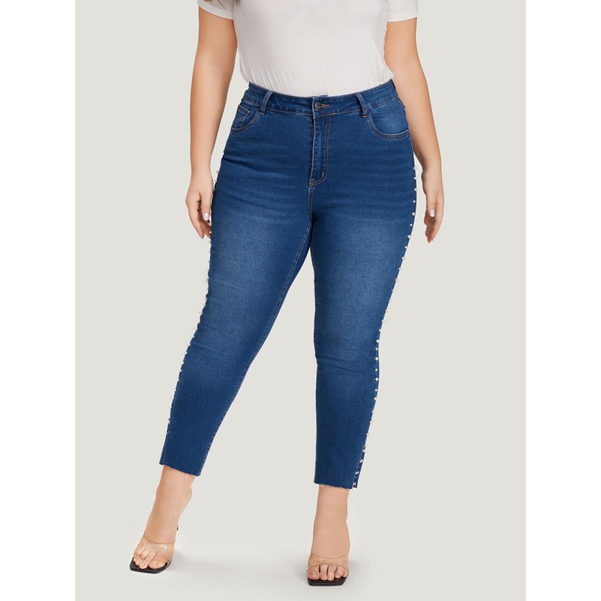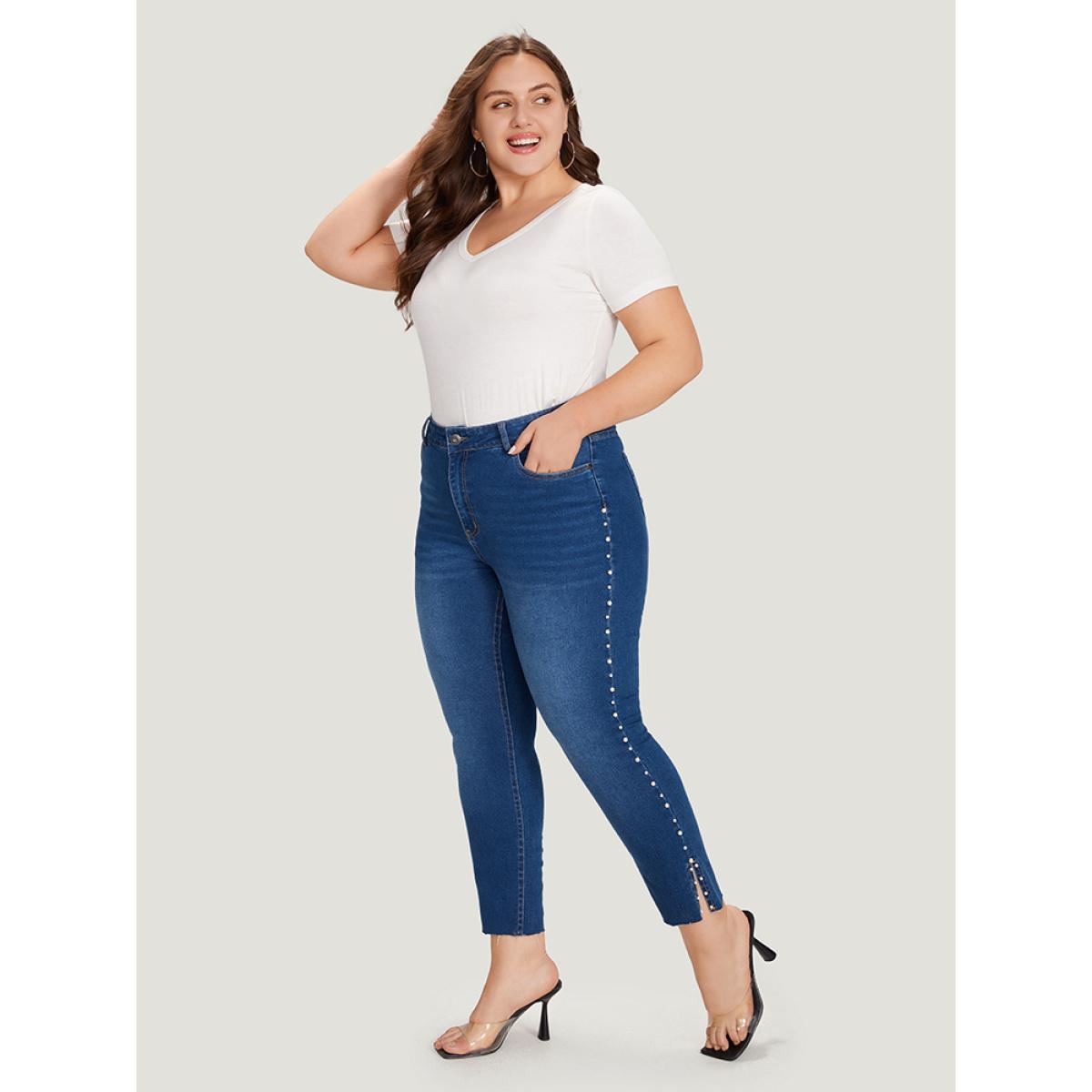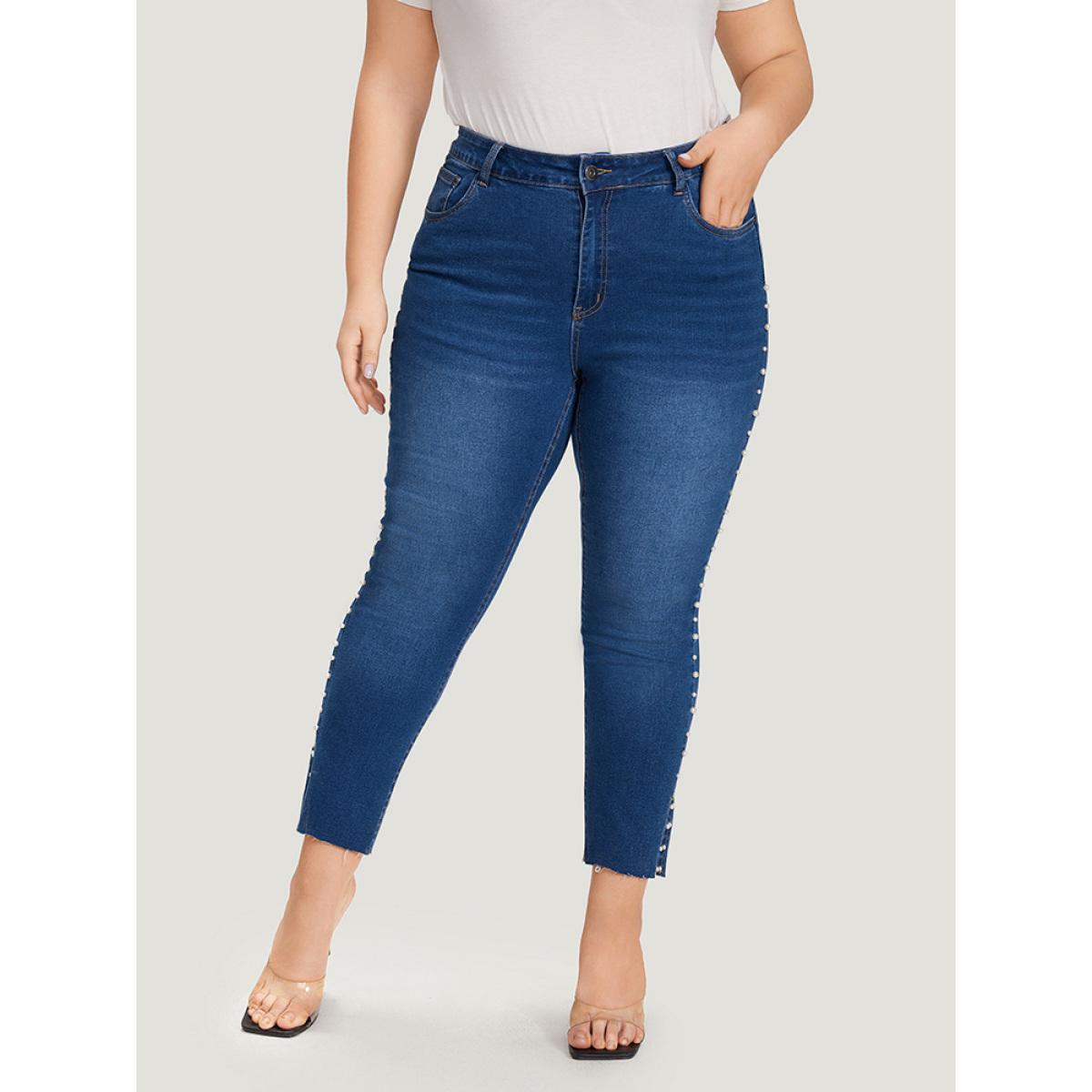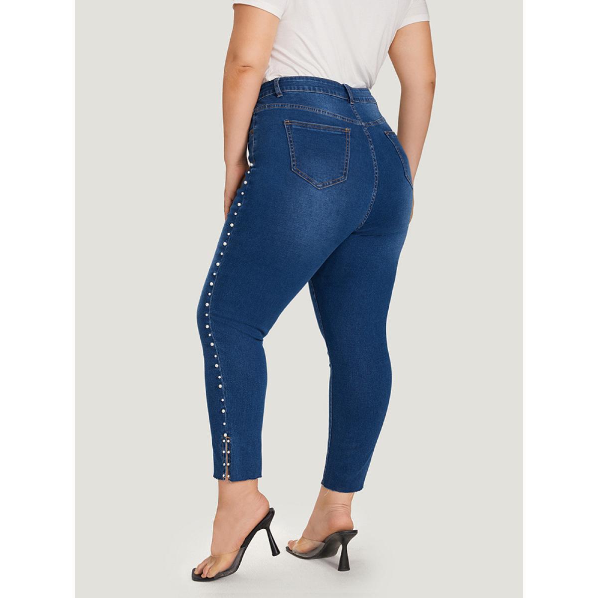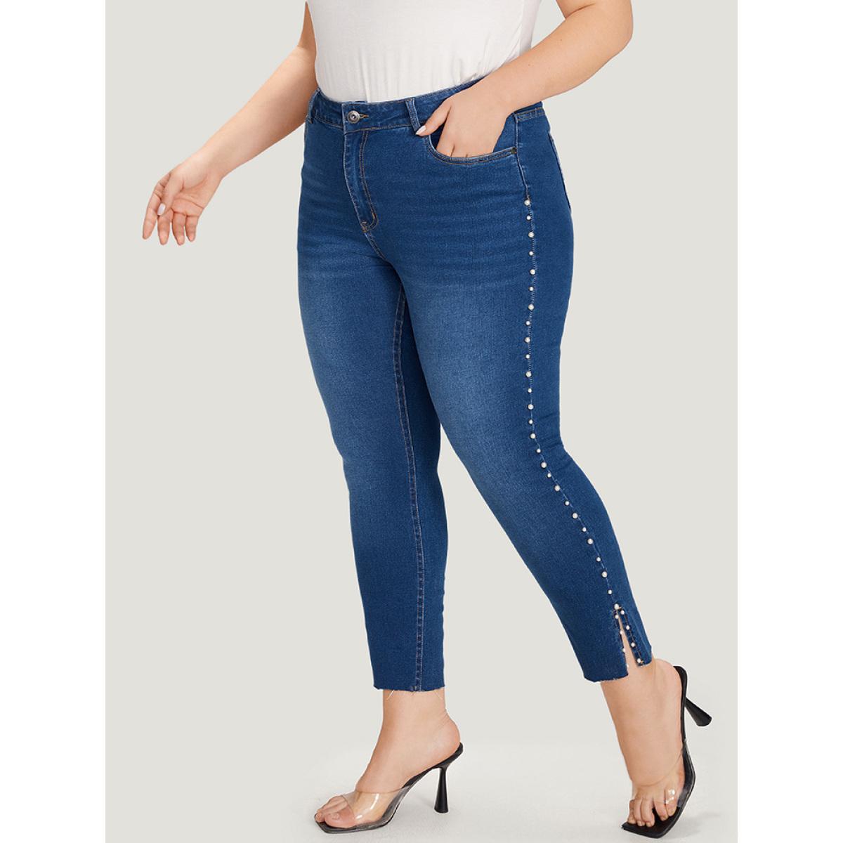 Plus Size Plain Split Side Beaded Detail Dark Wash Jeans Women DarkBlue Casual Plain Beaded High stretch Pocket Jeans BloomChic 10/M