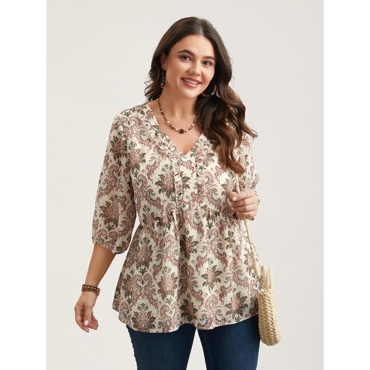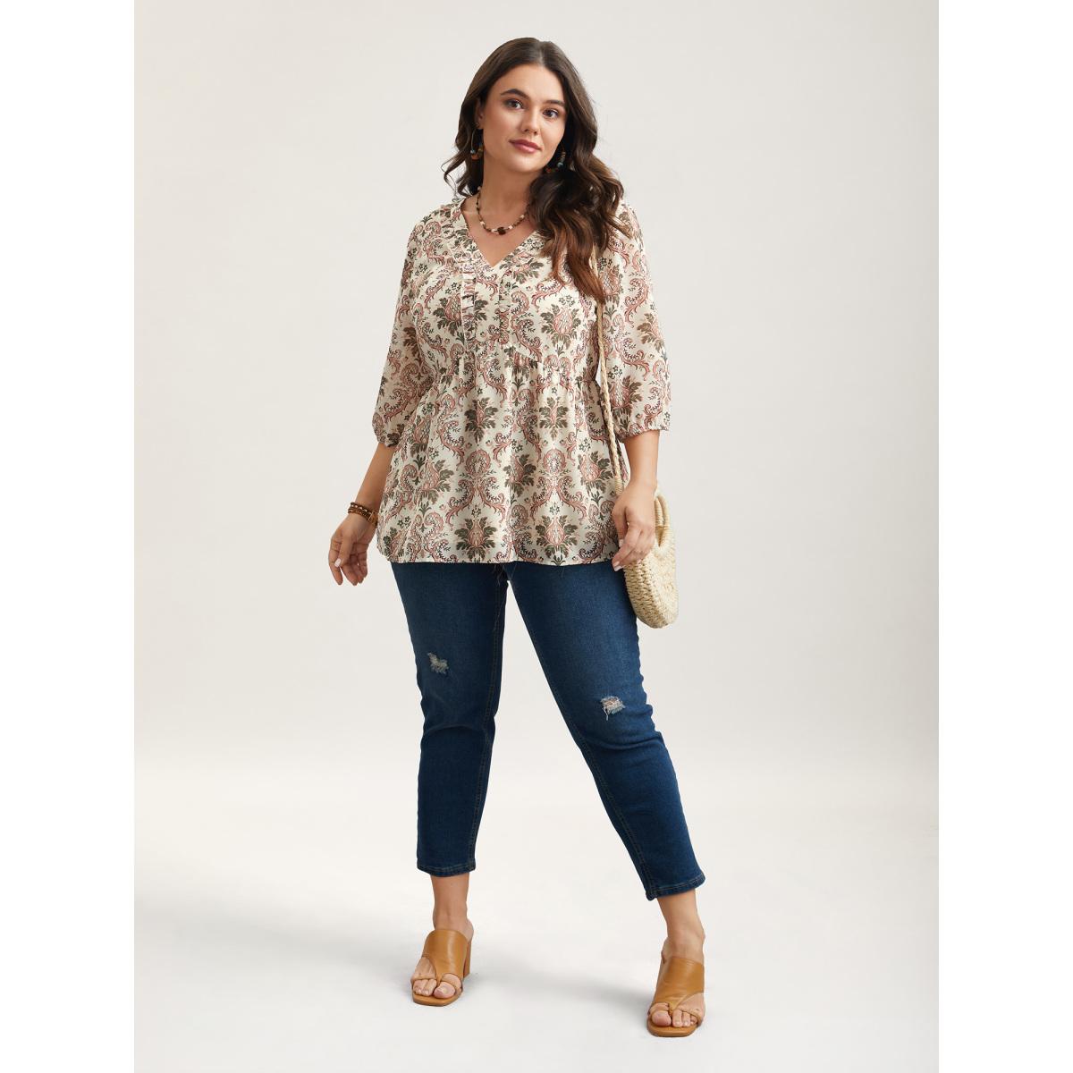 Plus Size Beige Ornate Print Stretchy Waist Lined Shirt Women Boho Elbow-length sleeve Deep V-neck Vacation Blouses BloomChic 12/L