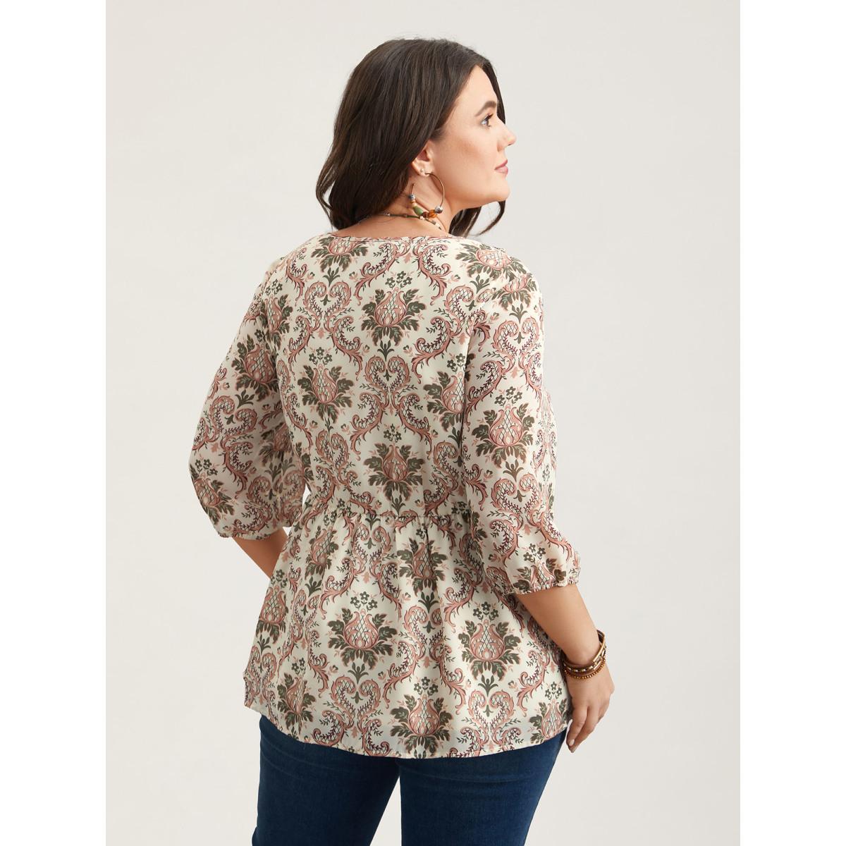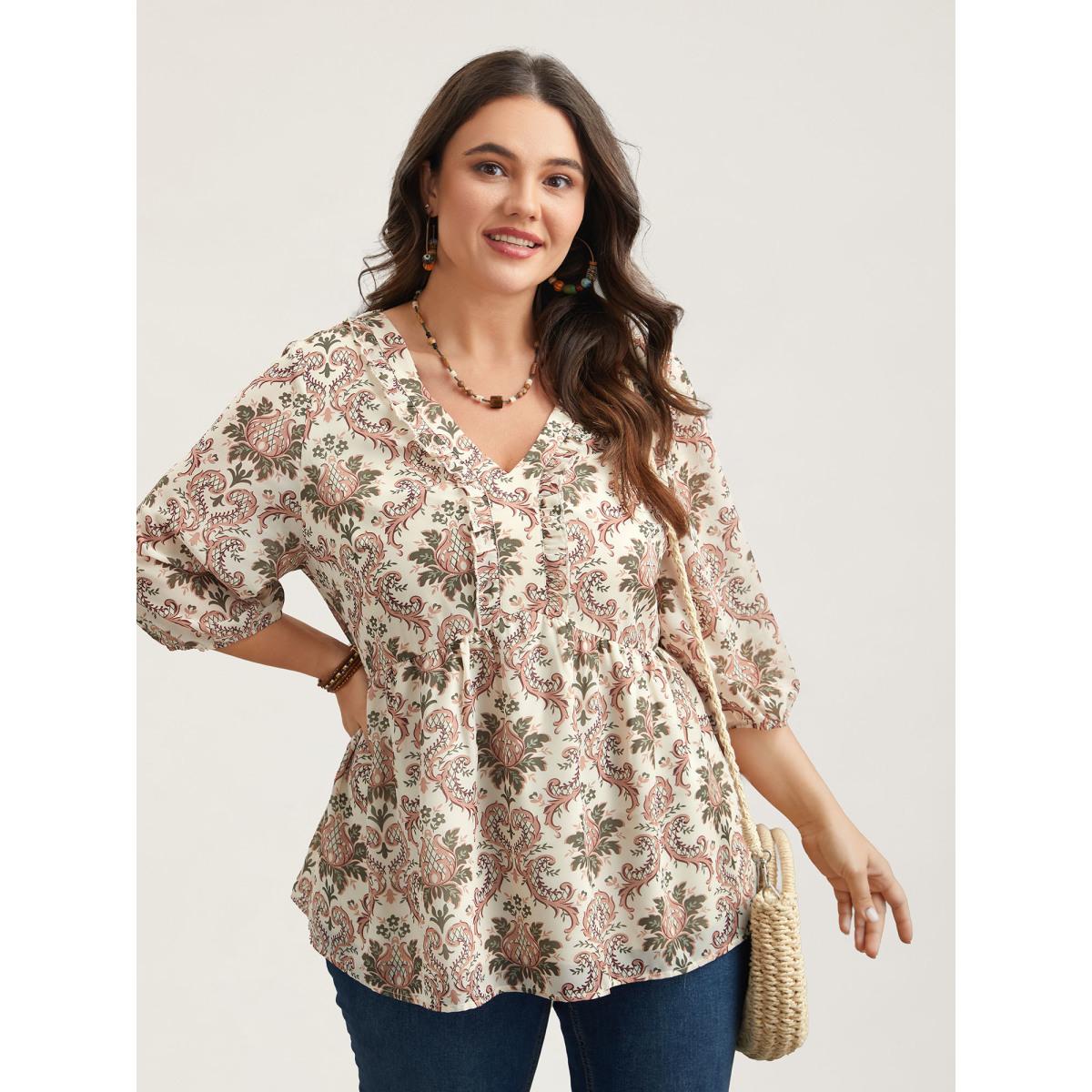 Plus Size Beige Ornate Print Stretchy Waist Lined Shirt Women Boho Elbow-length sleeve Deep V-neck Vacation Blouses BloomChic 12/L Product Image