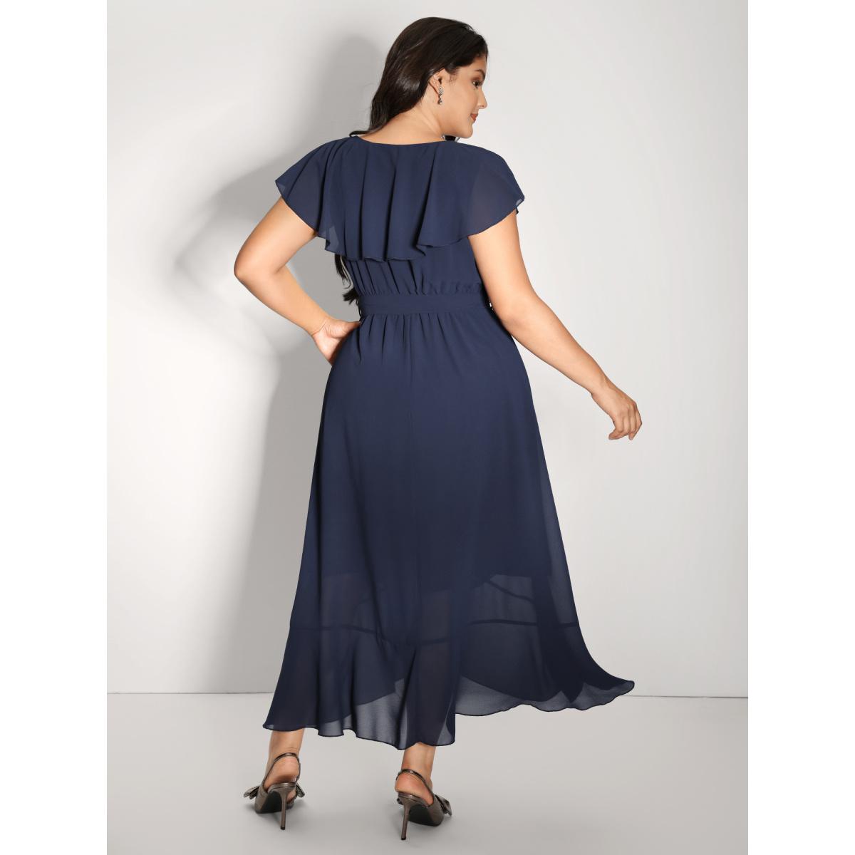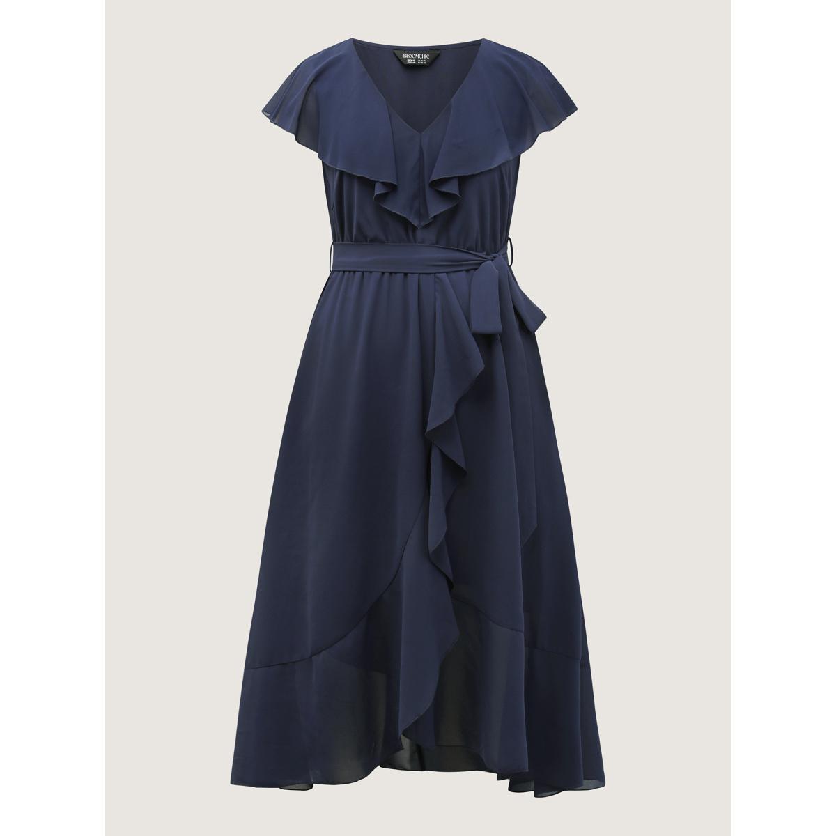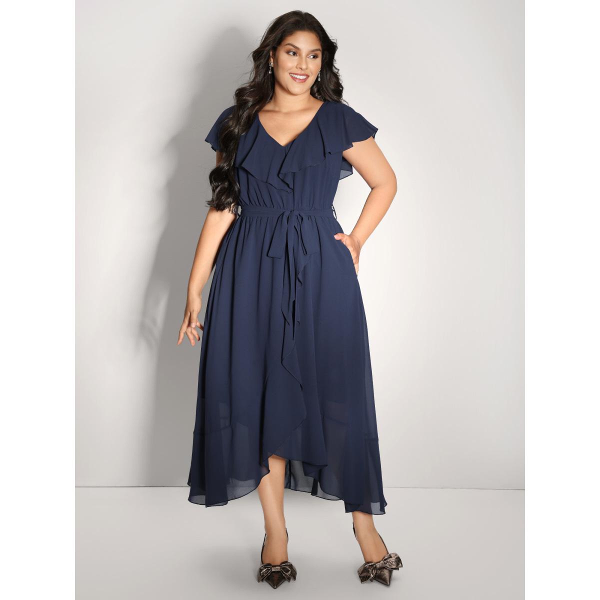 Plus Size Belted Waist High Low Hem Midi Dress Indigo Women Formal Belted V-neck Cap Sleeve Curvy BloomChic 10/M
