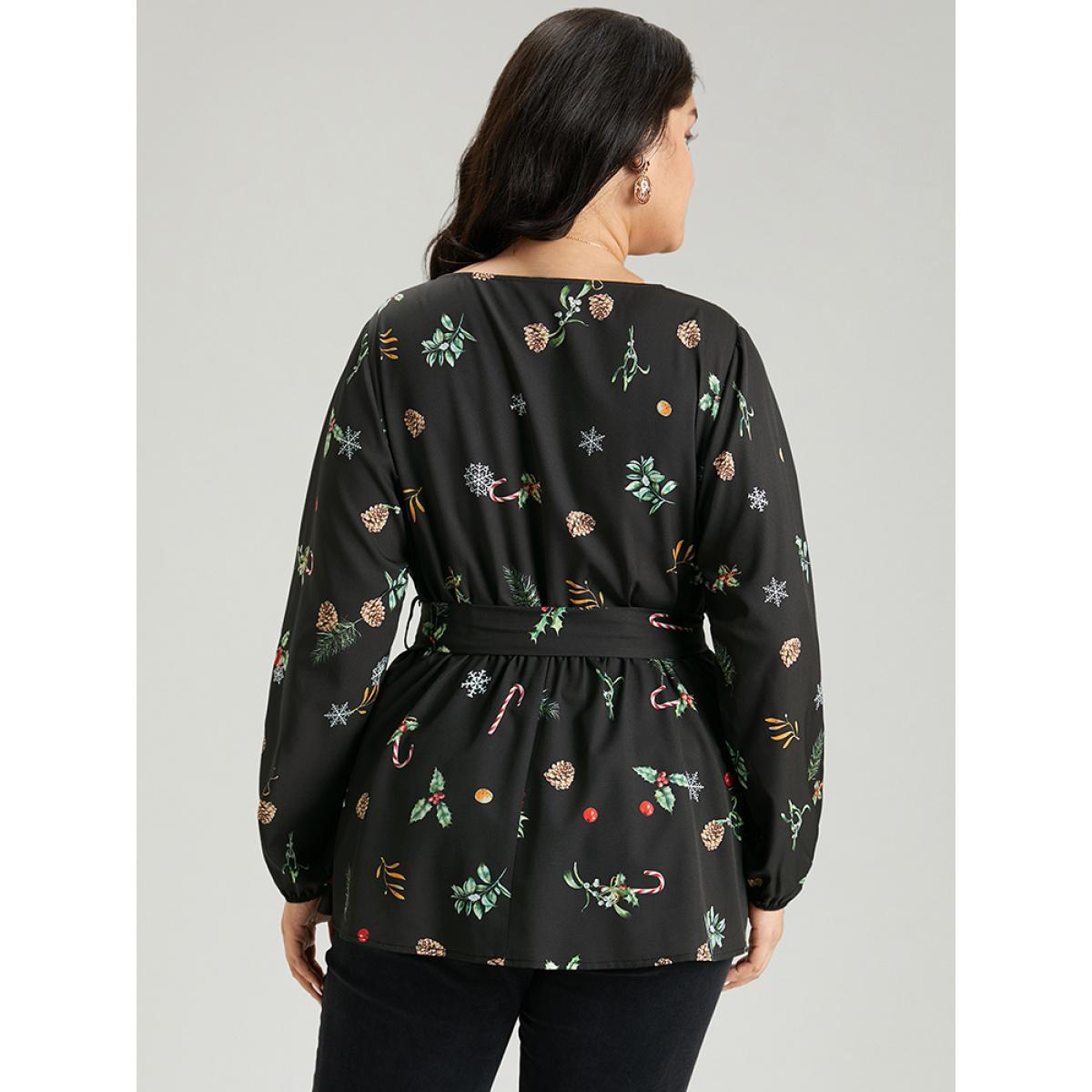 Plus Size Black Christmas Elastic Waist Belted Wrap Blouse Women Elegant Long Sleeve V-neck Festival-Christmas Blouses BloomChic 22-24/3X