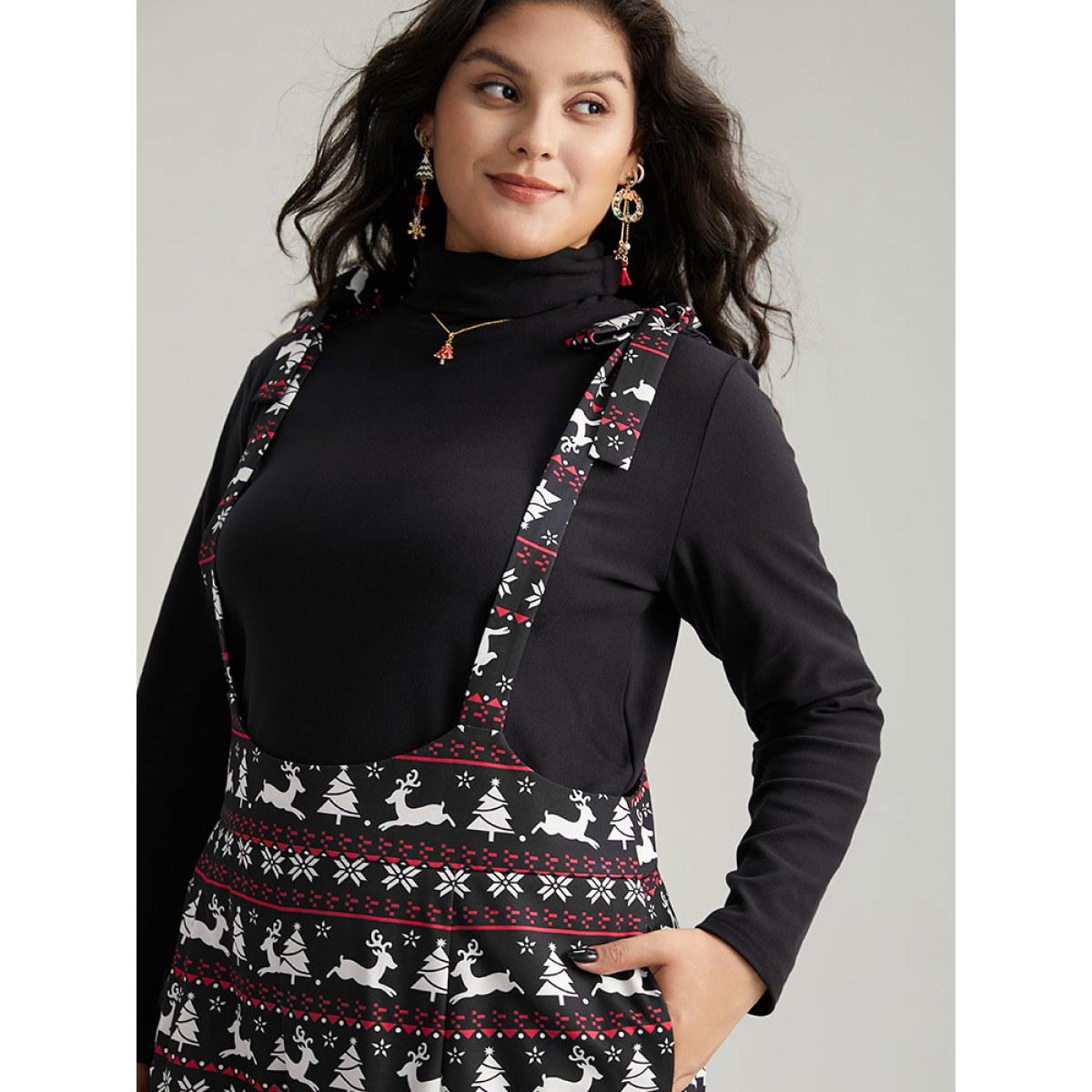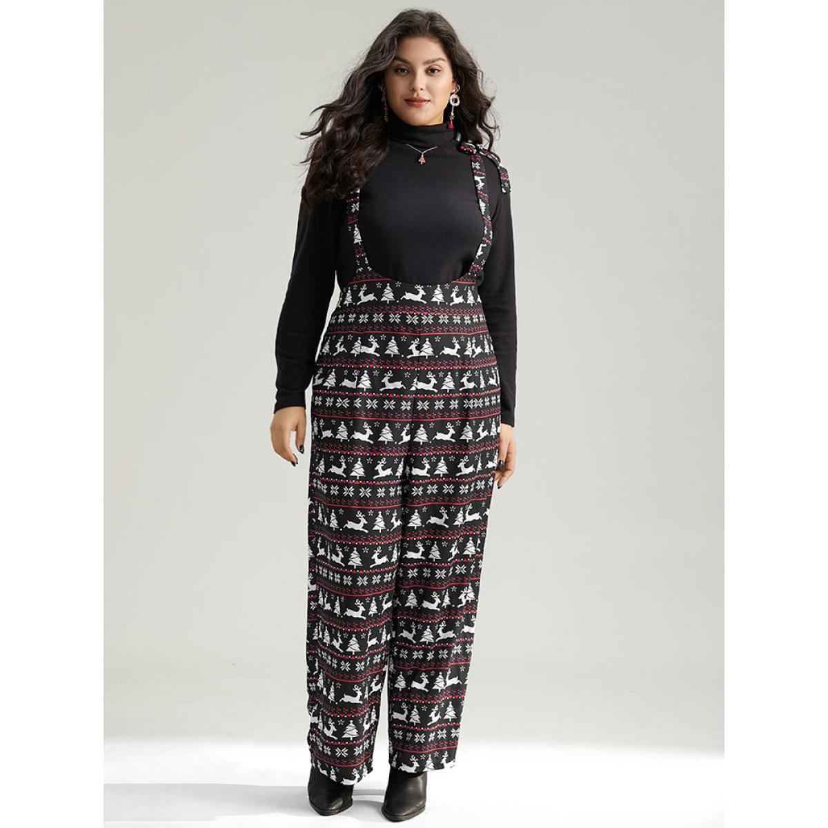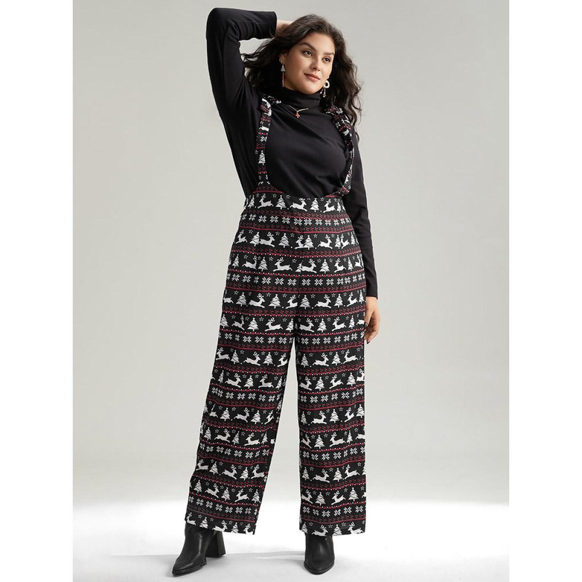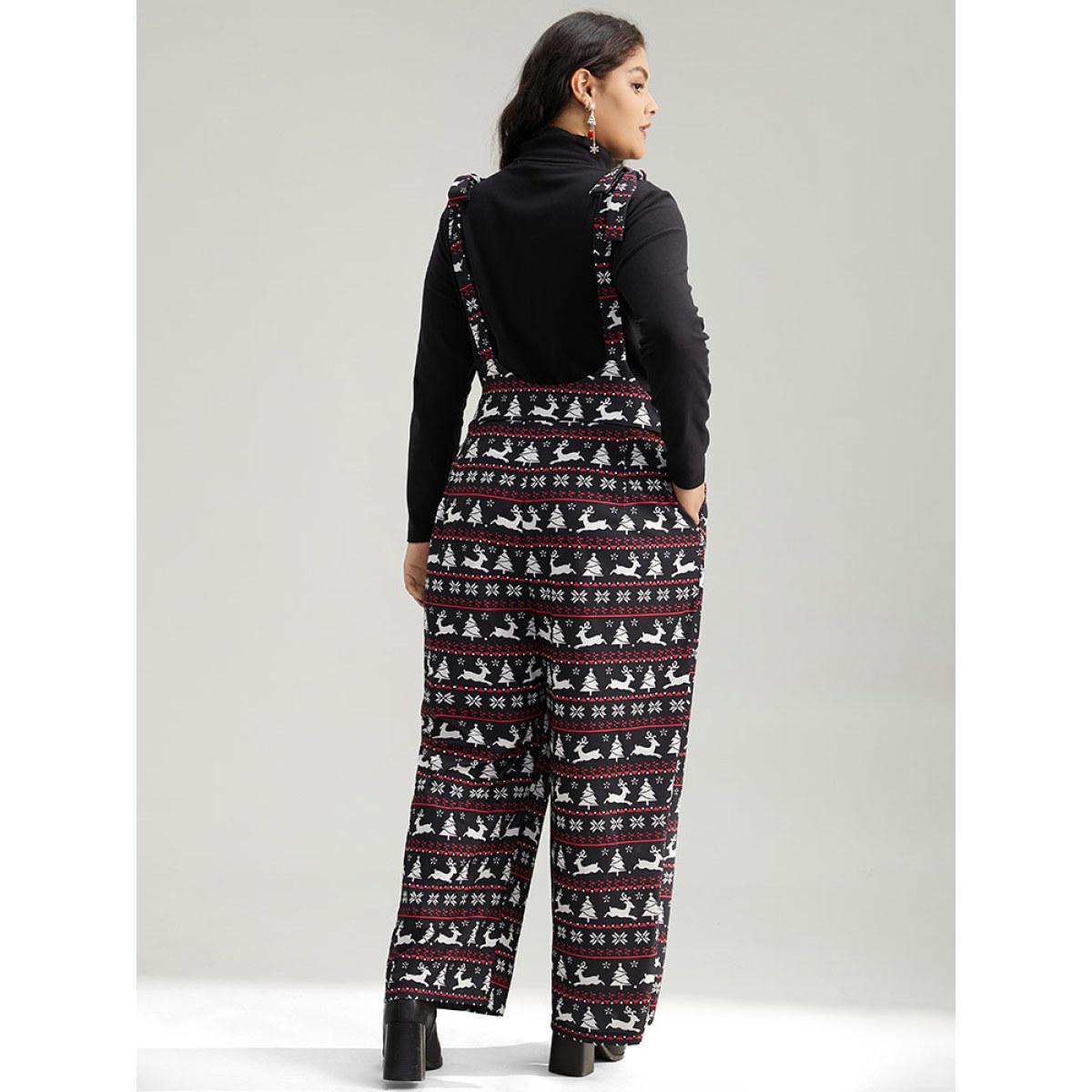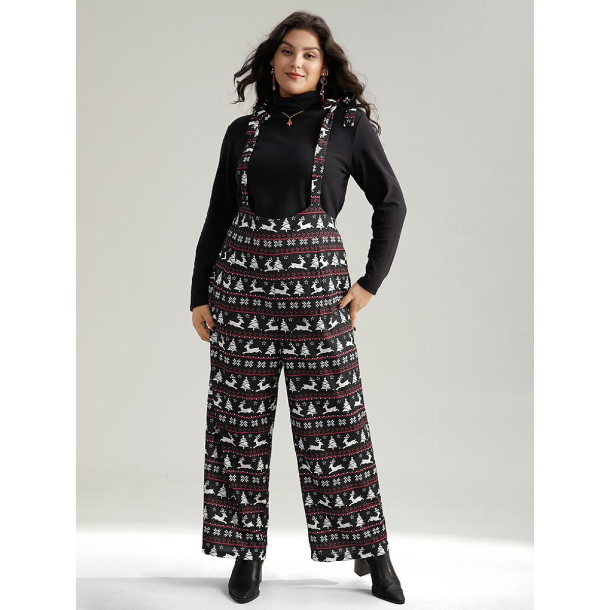 Plus Size Black Christmas Elk Print Elastic Waist Knot Jumpsuit Women Casual Sleeveless Spaghetti Strap Dailywear Loose Jumpsuits BloomChic 12/L