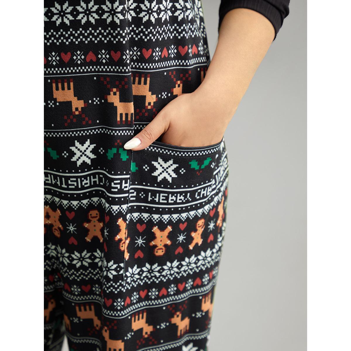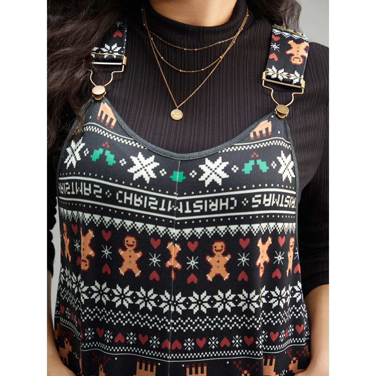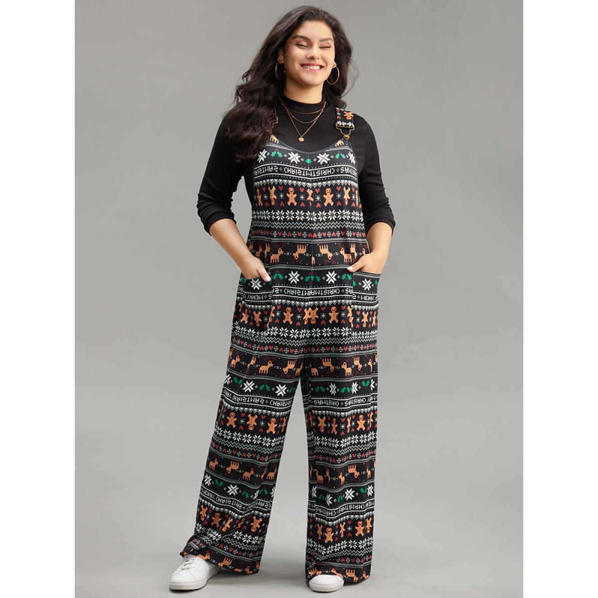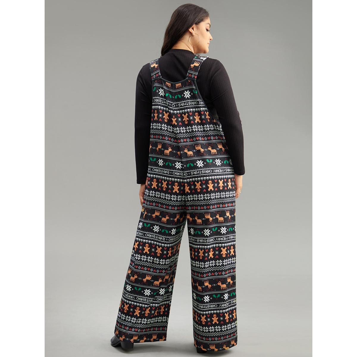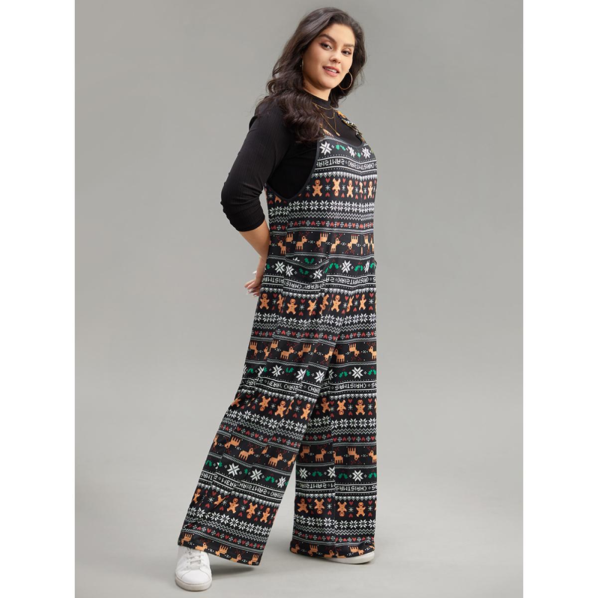 Plus Size Black Christmas Print Adjustable Straps Jumpsuit Women Playful Sleeveless Spaghetti Strap Casual Loose Jumpsuits BloomChic 18-20/2X