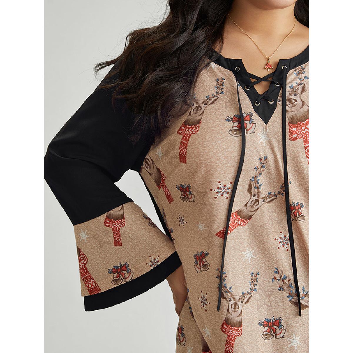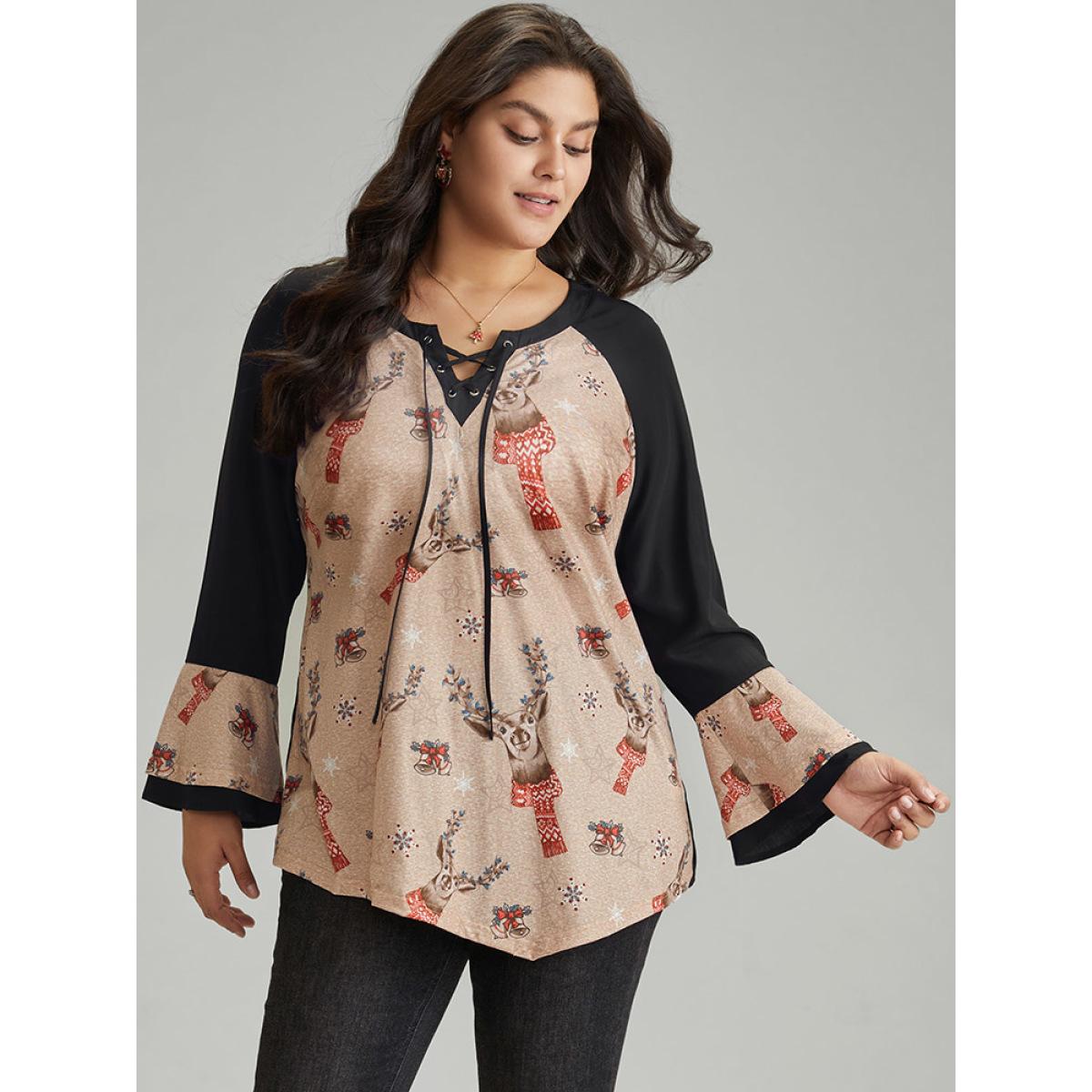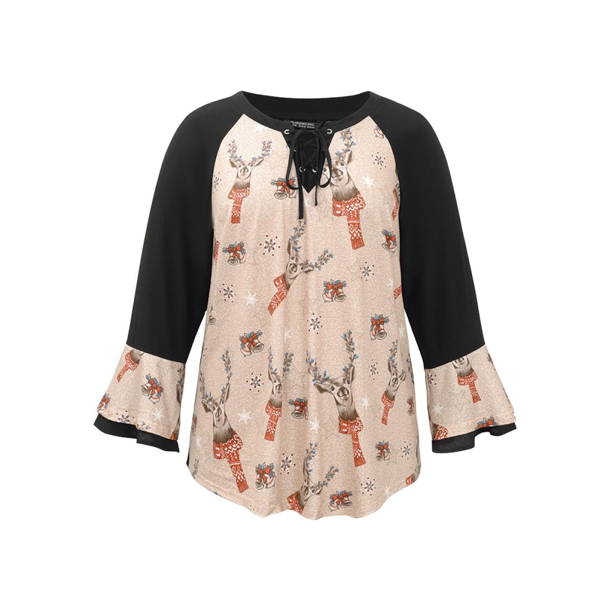Plus Size Black Christmas Print Ruffles Patchwork Bell Sleeve Lace Up Blouse Women Elegant Long Sleeve Tie Neck Festival-Christmas Blouses BloomChic 12/L