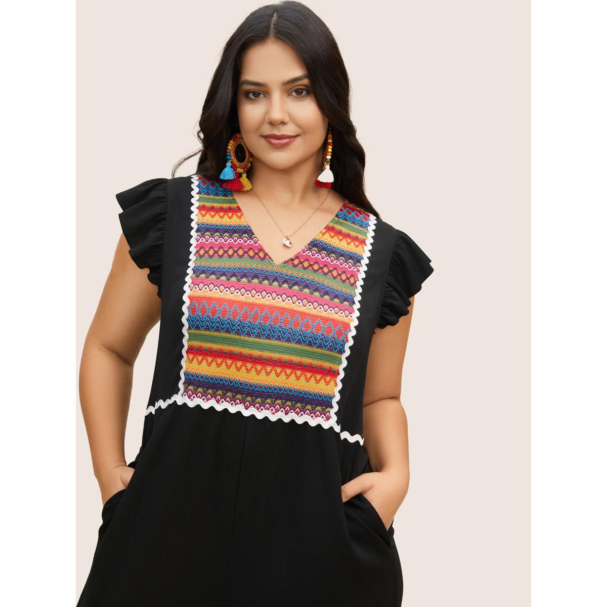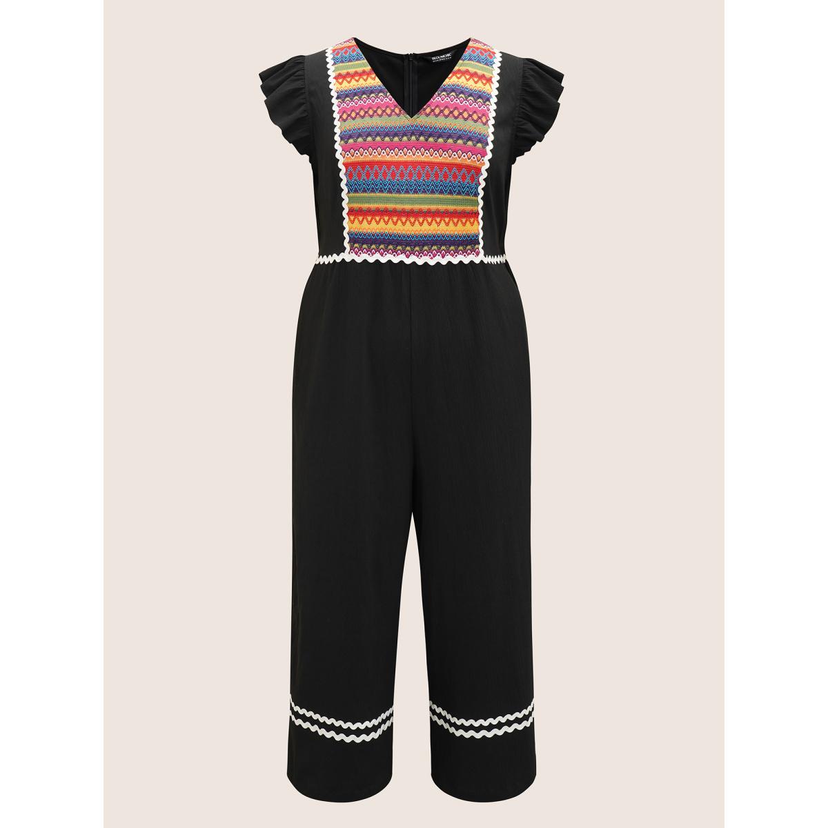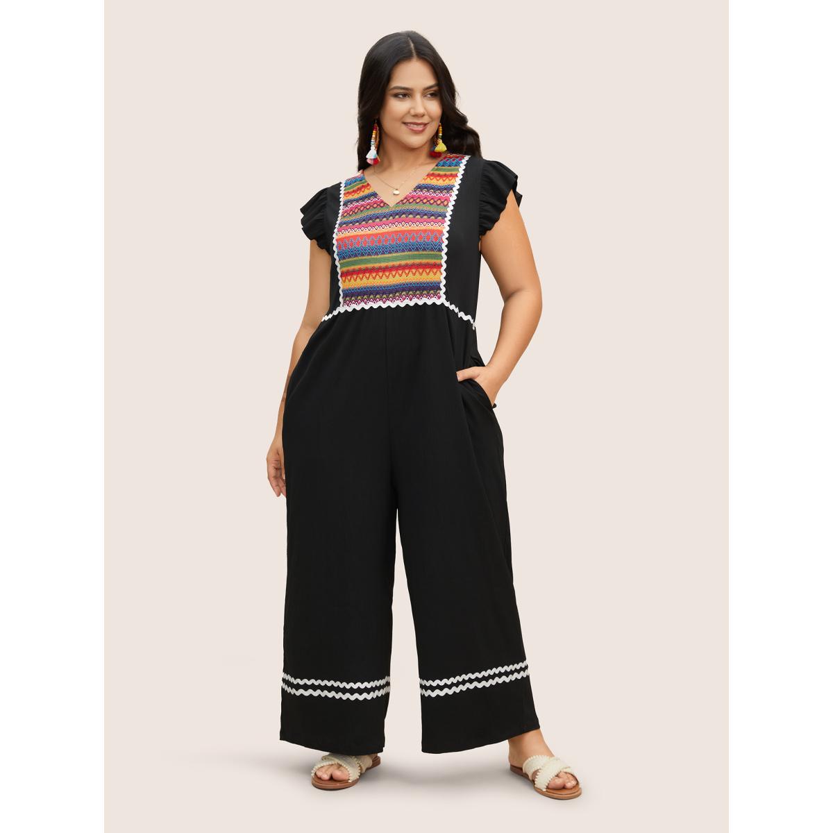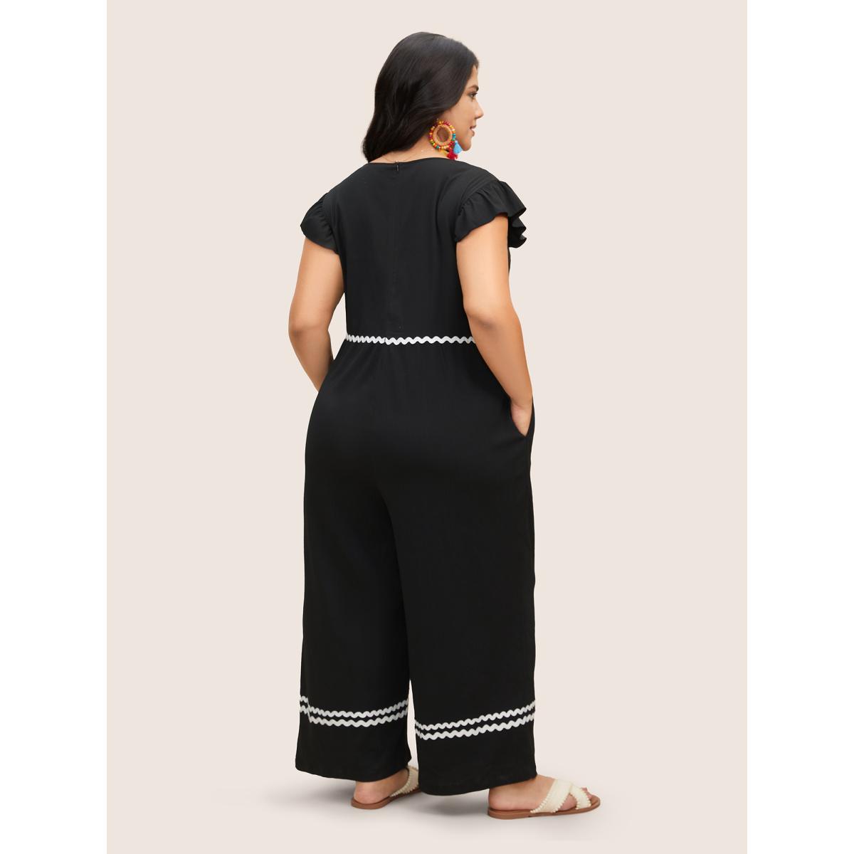Plus Size Black Contrast Webbing Ruffle Cap Sleeve Jumpsuit Women Resort Cap Sleeve V-neck Vacation Loose Jumpsuits BloomChic 22-24/3X