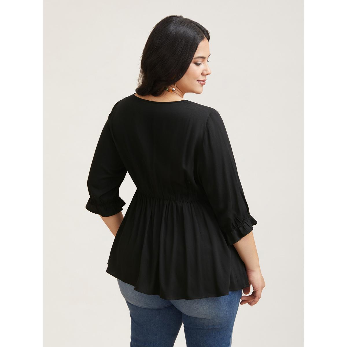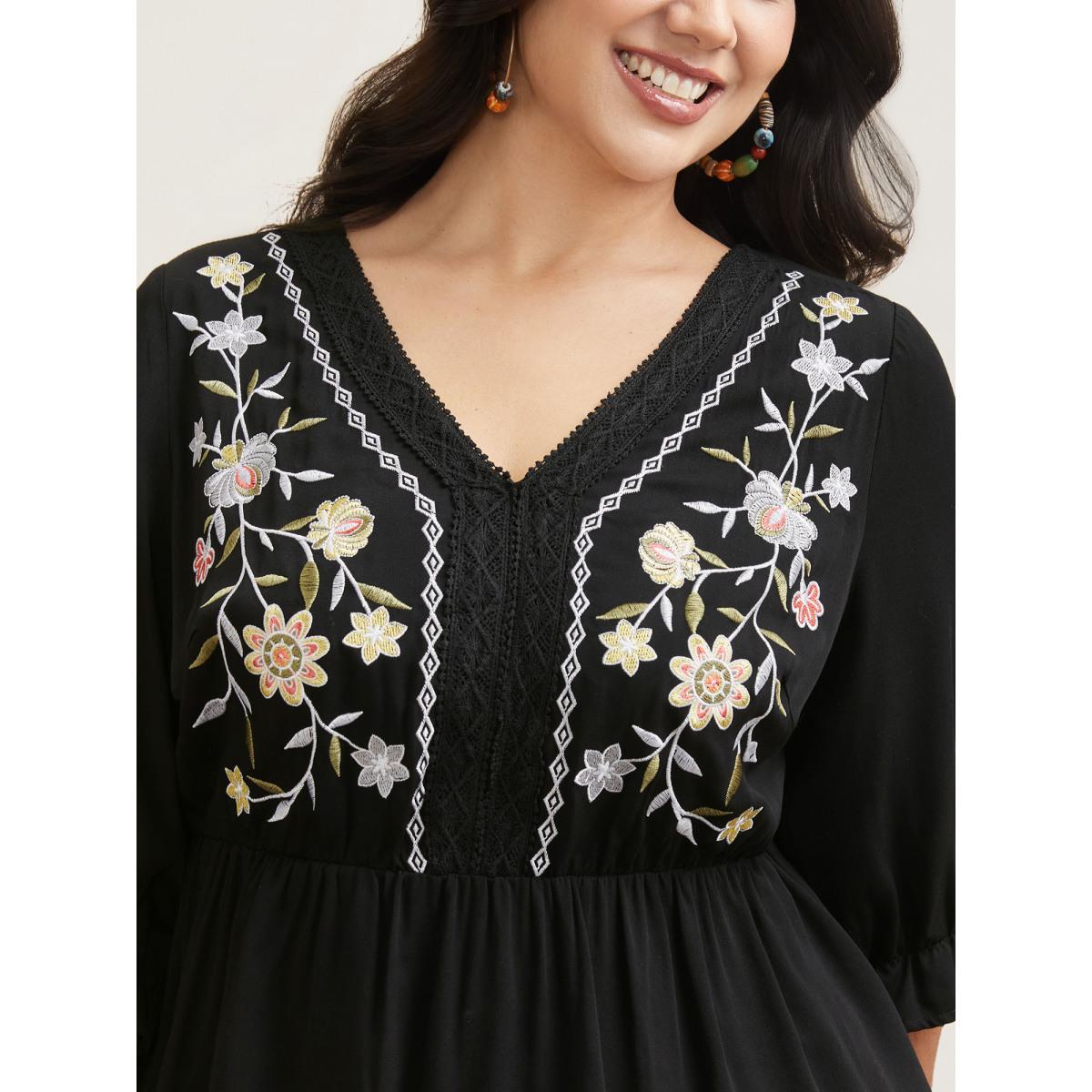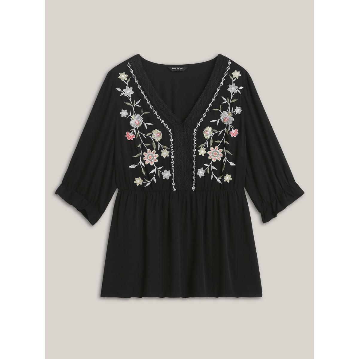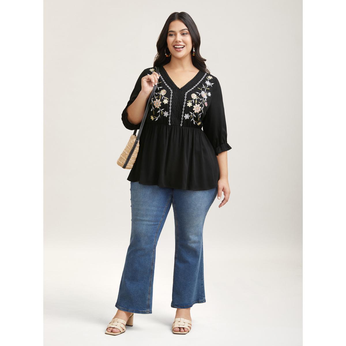 Plus Size Black Embroidered Lace Spliced Peplum Shirt Women Resort Elbow-length sleeve V-neck Vacation Blouses BloomChic 14-16/1X