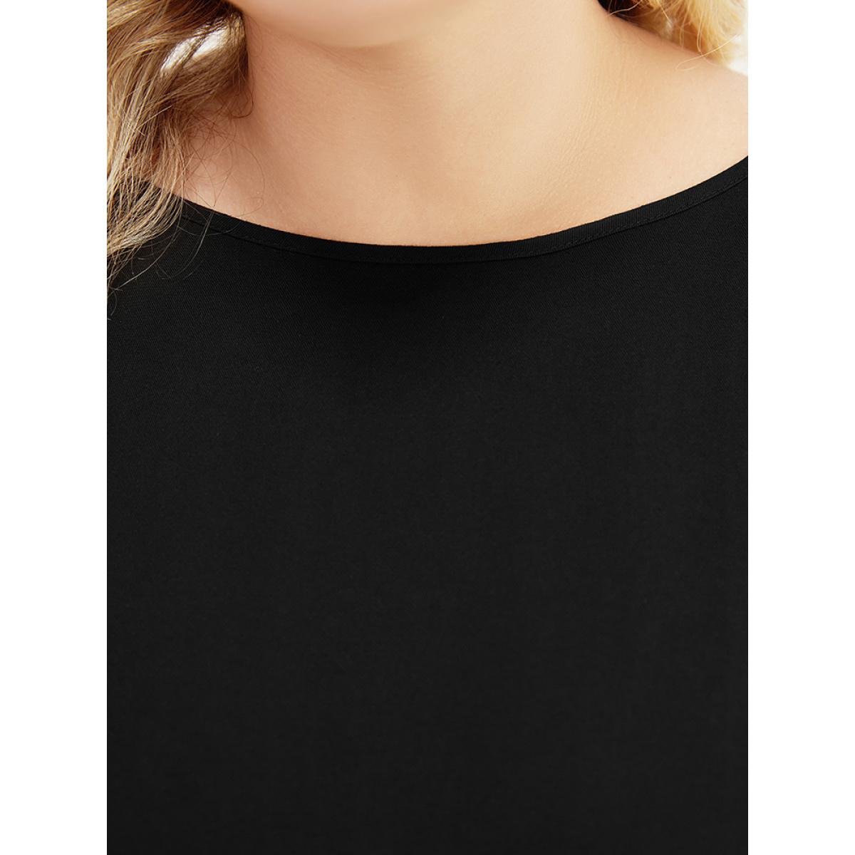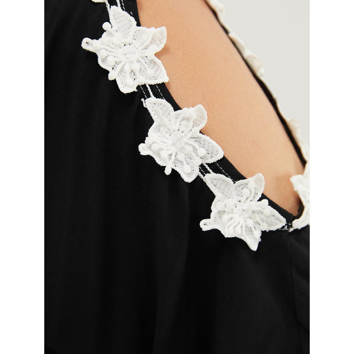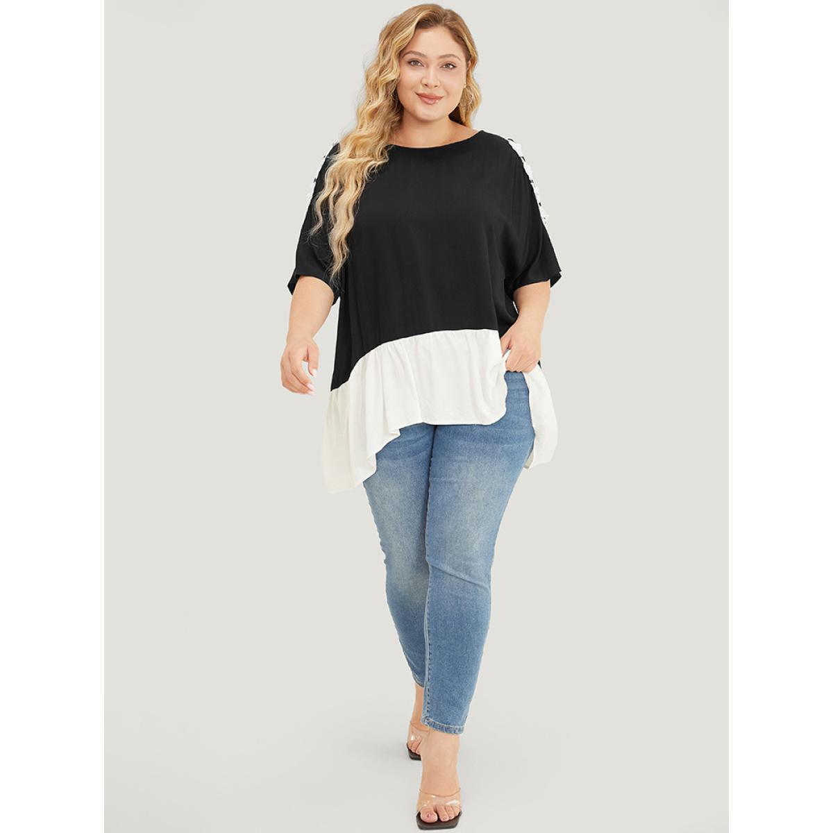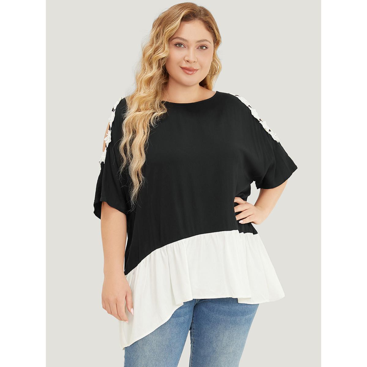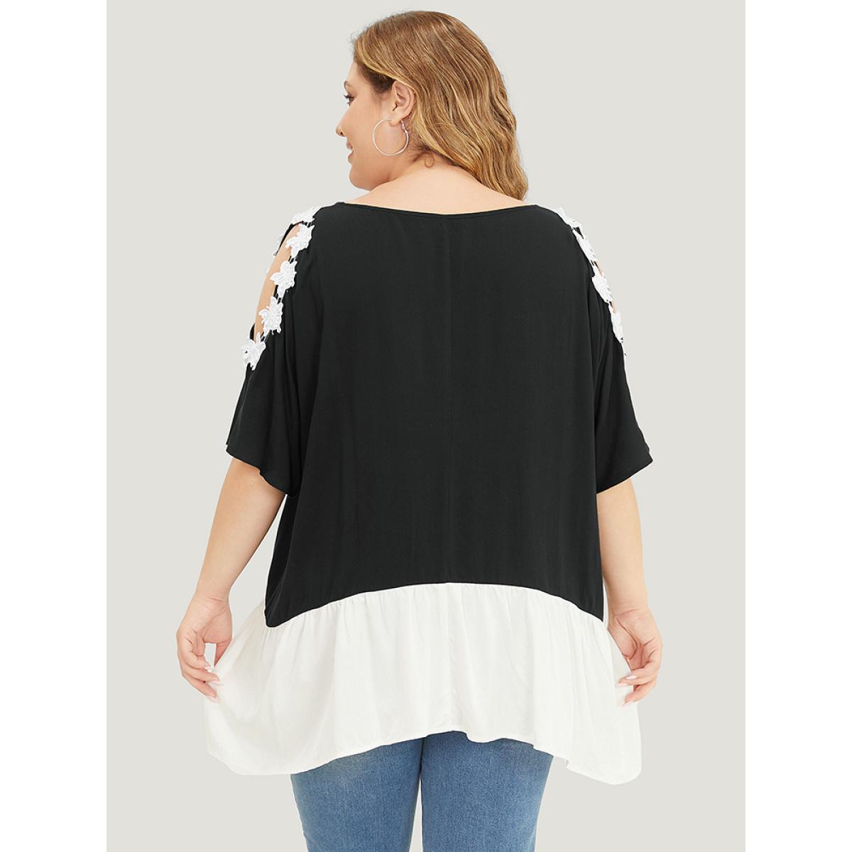 Plus Size Black Floral Appliques Patchwork Asymmetrical Hem Cold Shoulder Blouse Women Elegant Short sleeve Cold Shoulder Dailywear Blouses BloomChic 10/M
