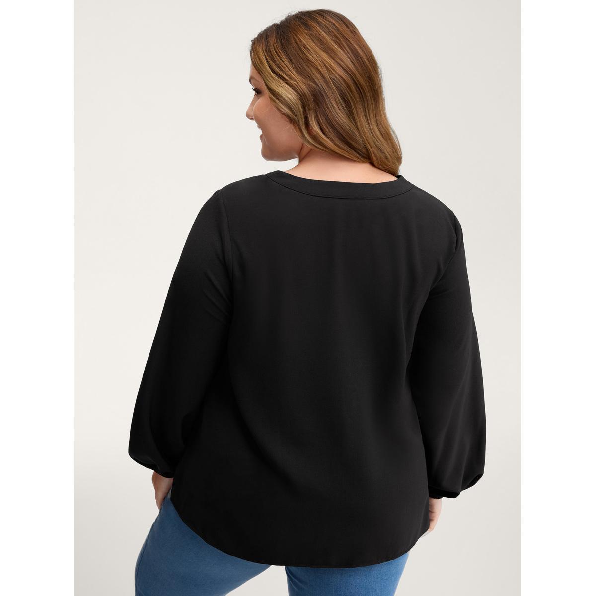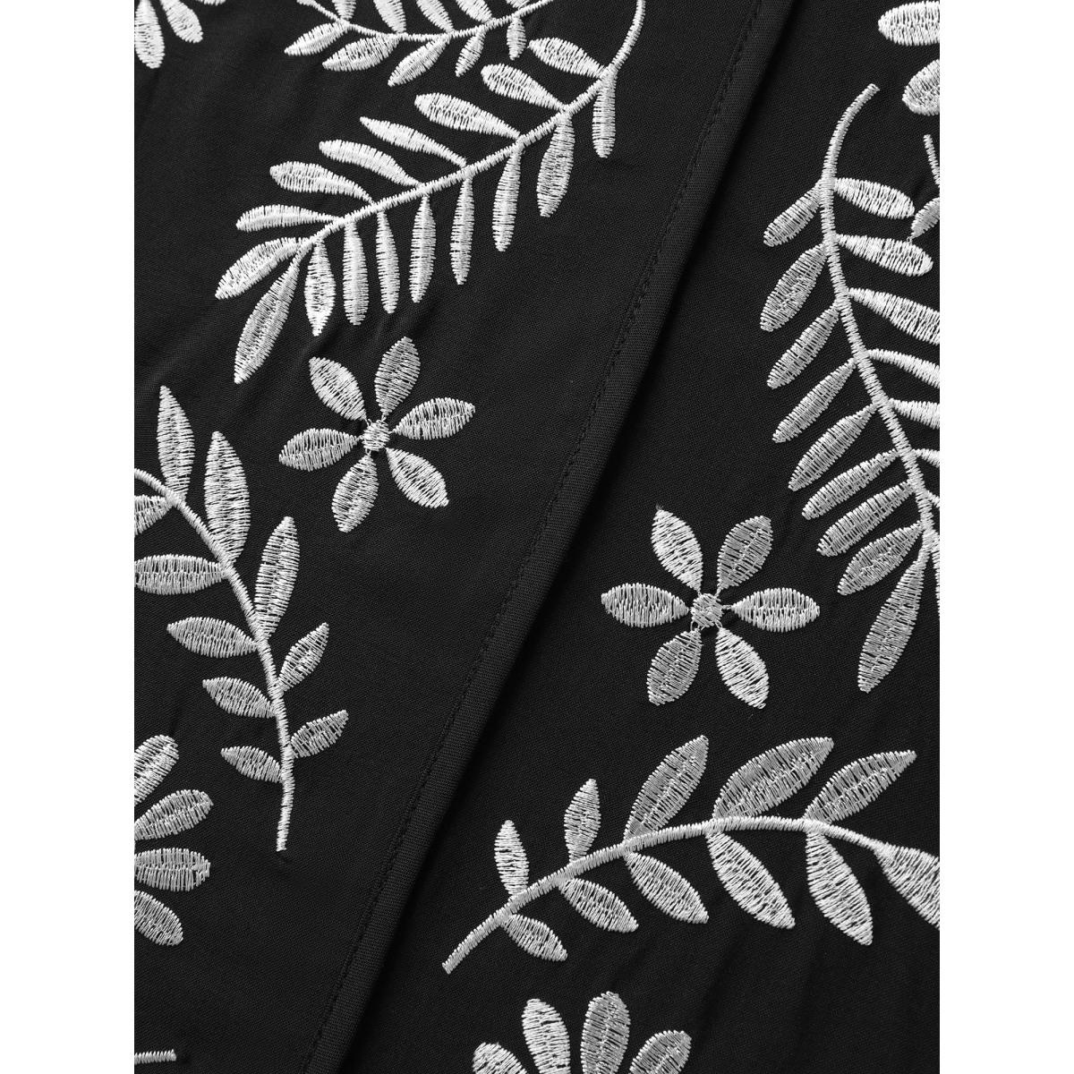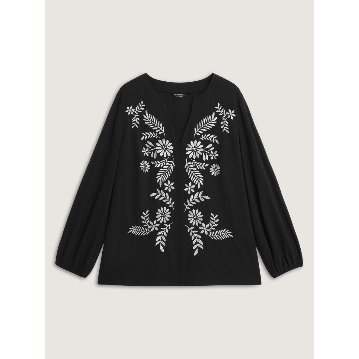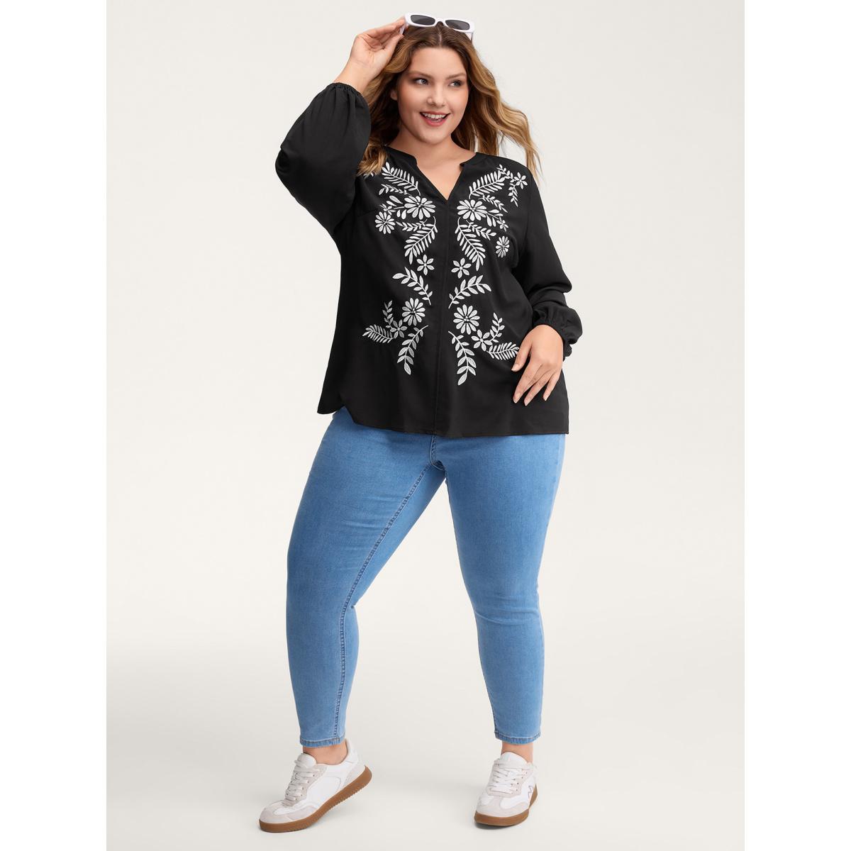 Plus Size Black Floral Color Contrast Embroidery Blouse Women Leisure Extra Long Sleeve Flat collar with V-notch Casual Blouses BloomChic 14-16/1X