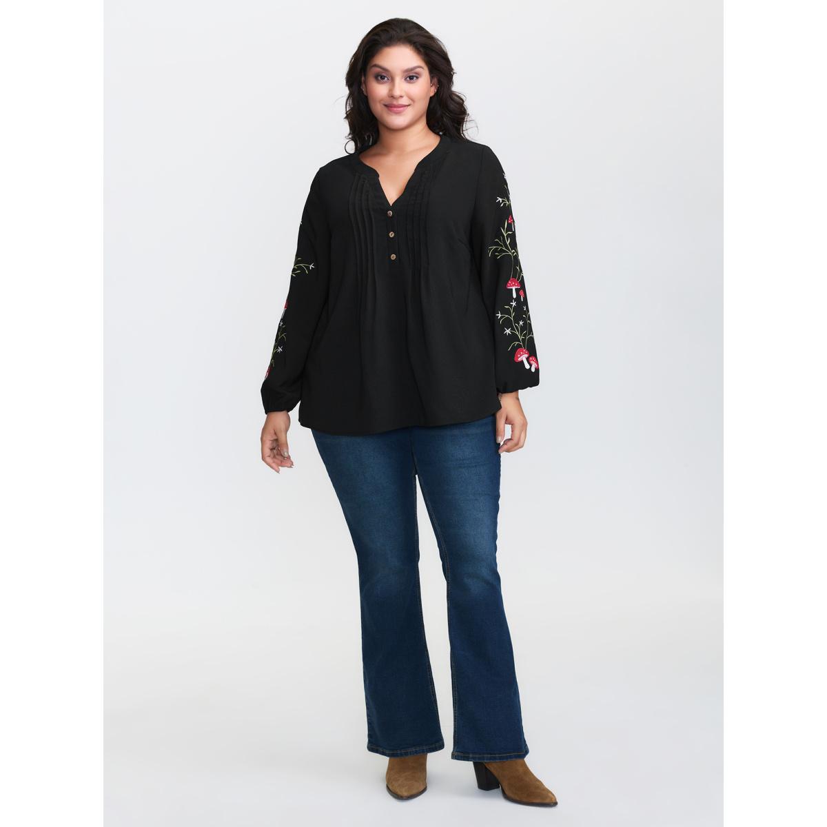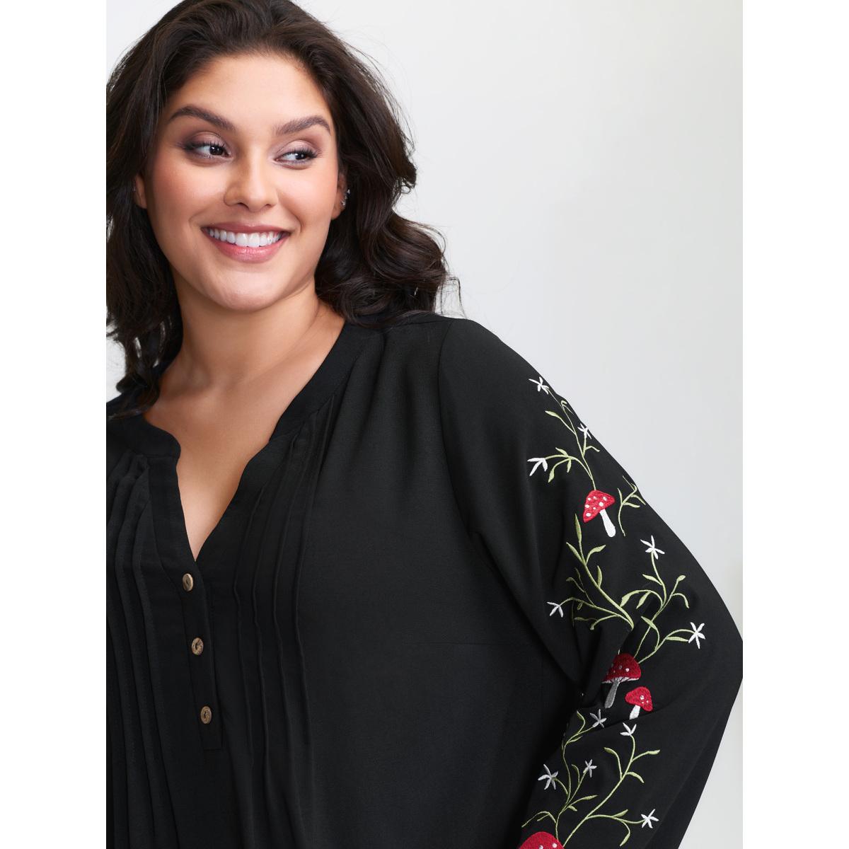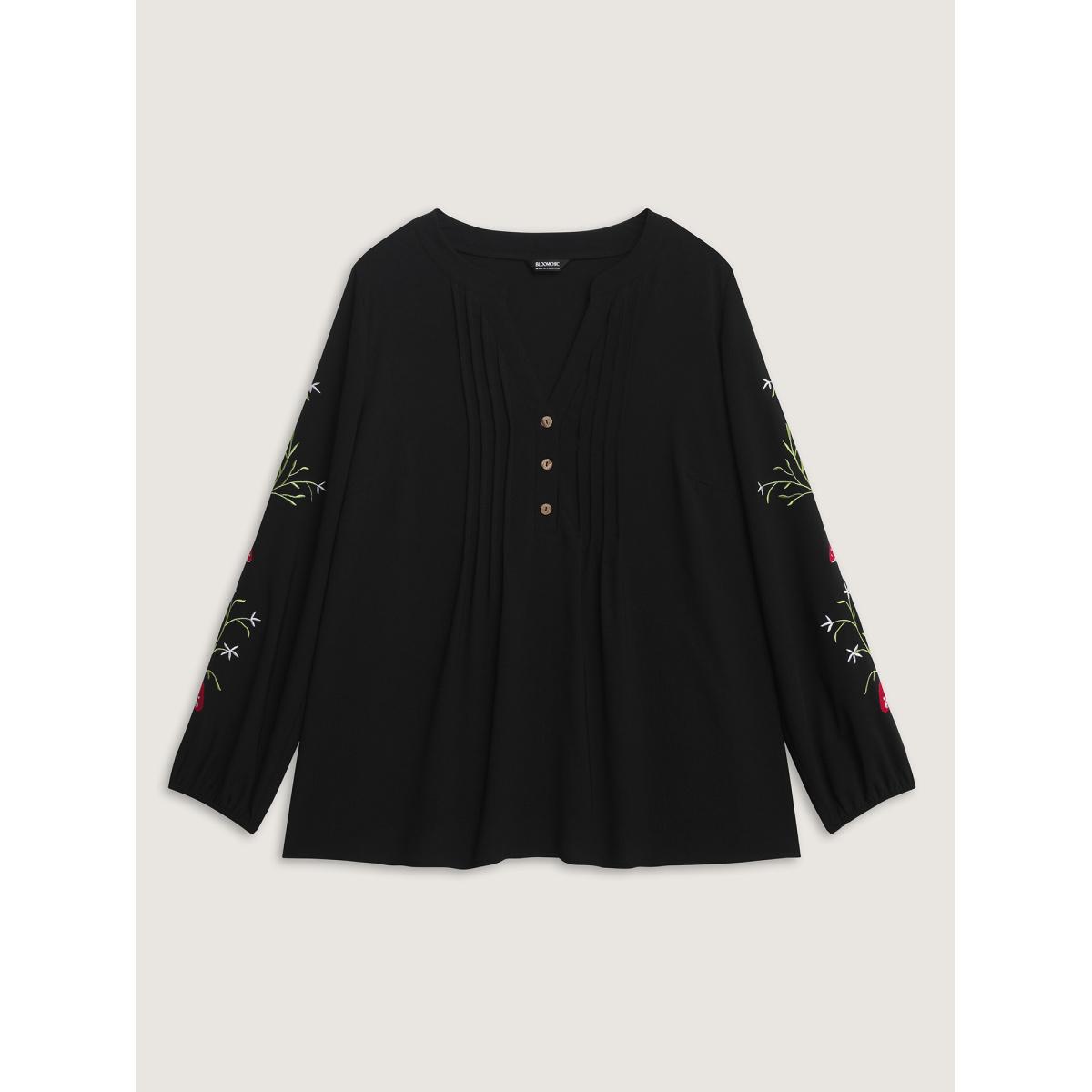 Plus Size Black Floral Embroidery Toothpick Pleats Blouse Women Extra Long Sleeve Flat collar with V-notch Casual Blouses BloomChic 18-20/2X