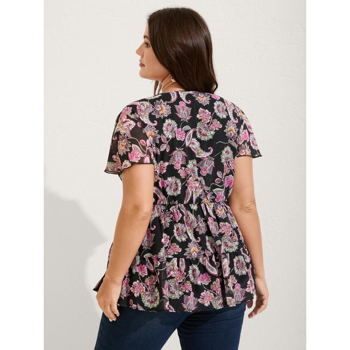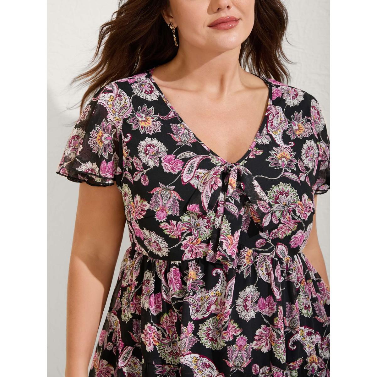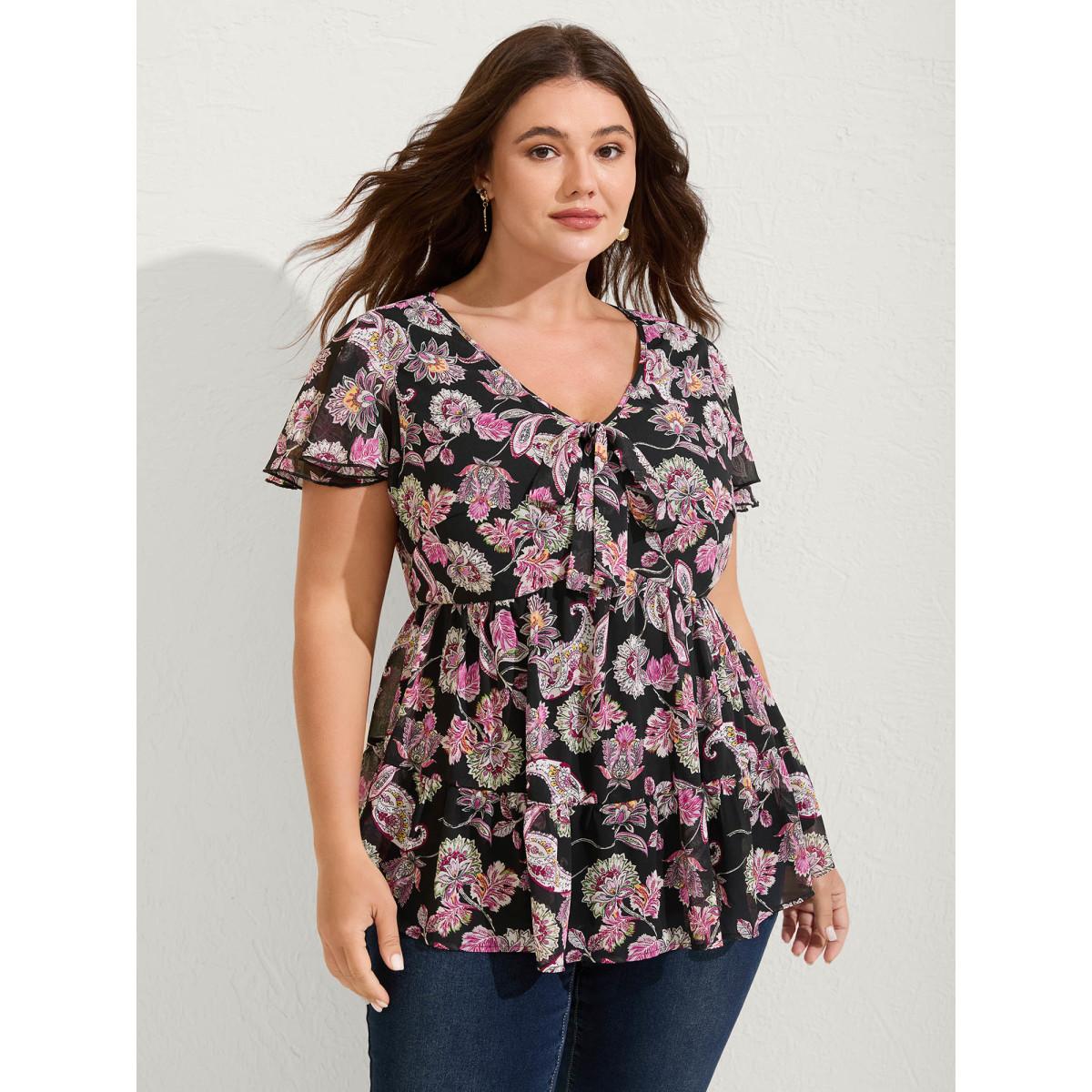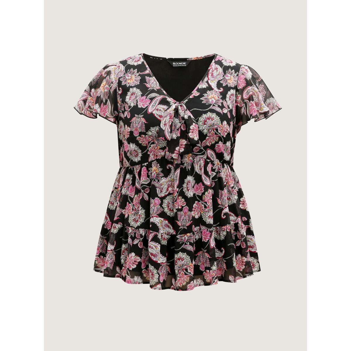 Plus Size BlackFlower Bandana Flutter Sleeve Tie Neck Cut Out Blouse Women Vacation Short sleeve V-neck Dailywear Blouses BloomChic 28/5X
