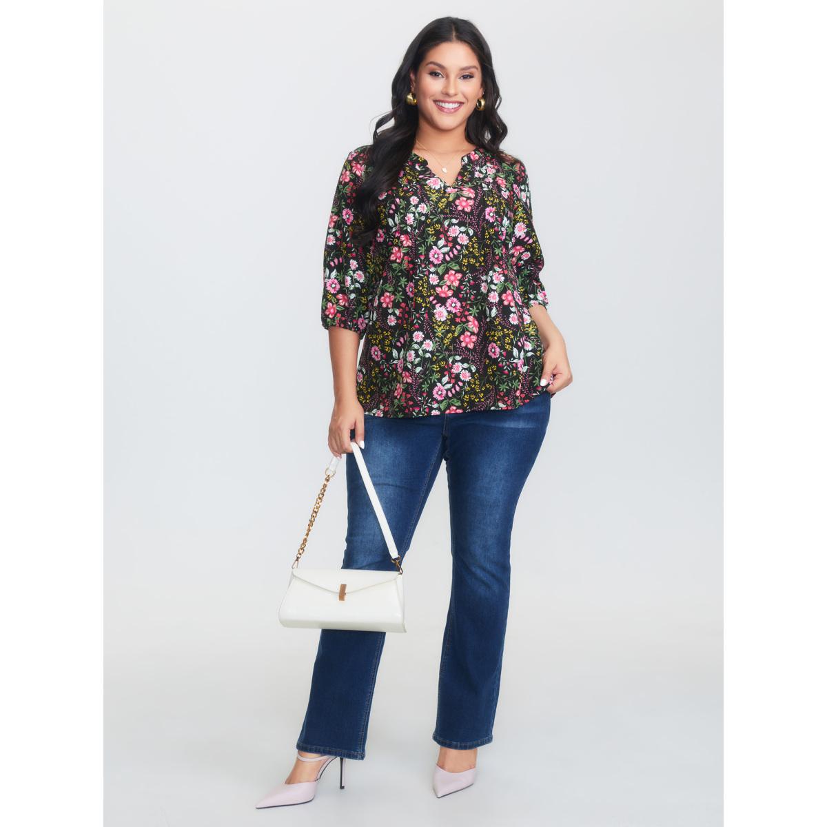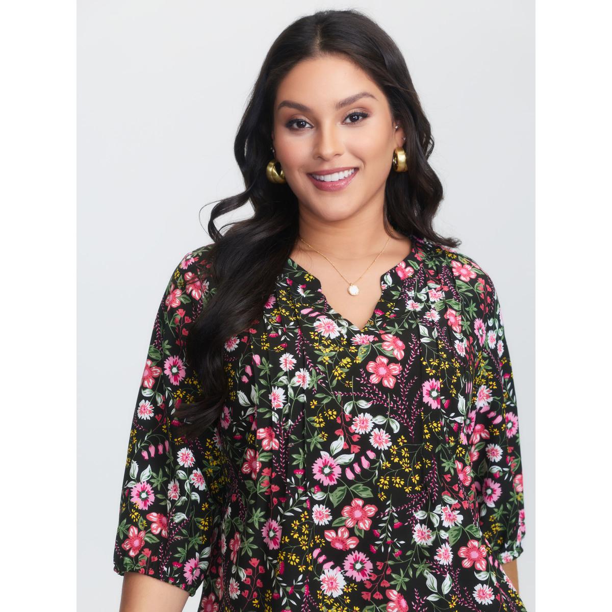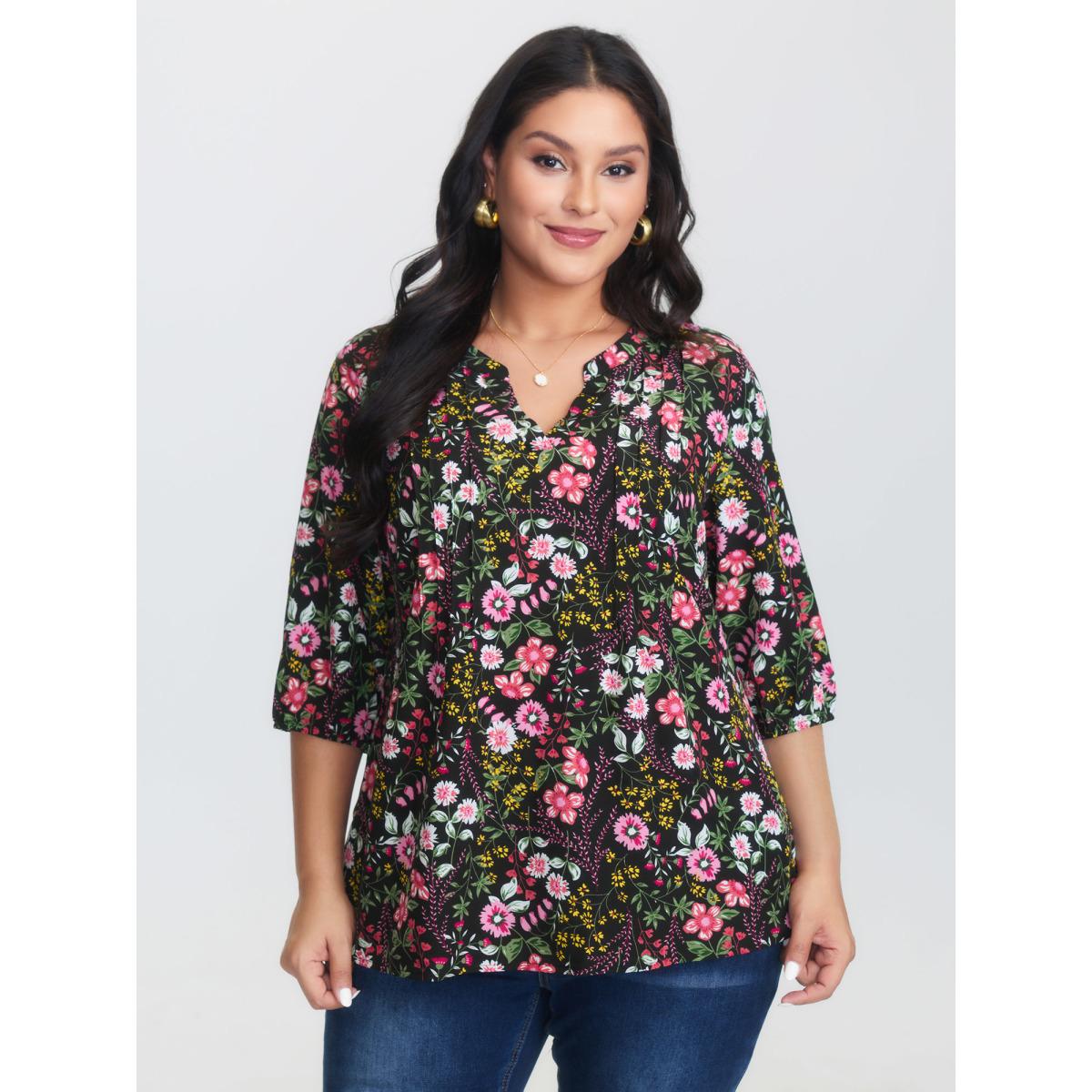 Plus Size Black Floral Print Notched Collar Shirt Women Timeless Elbow-length sleeve Notched collar Elegant Blouses BloomChic 30/6X