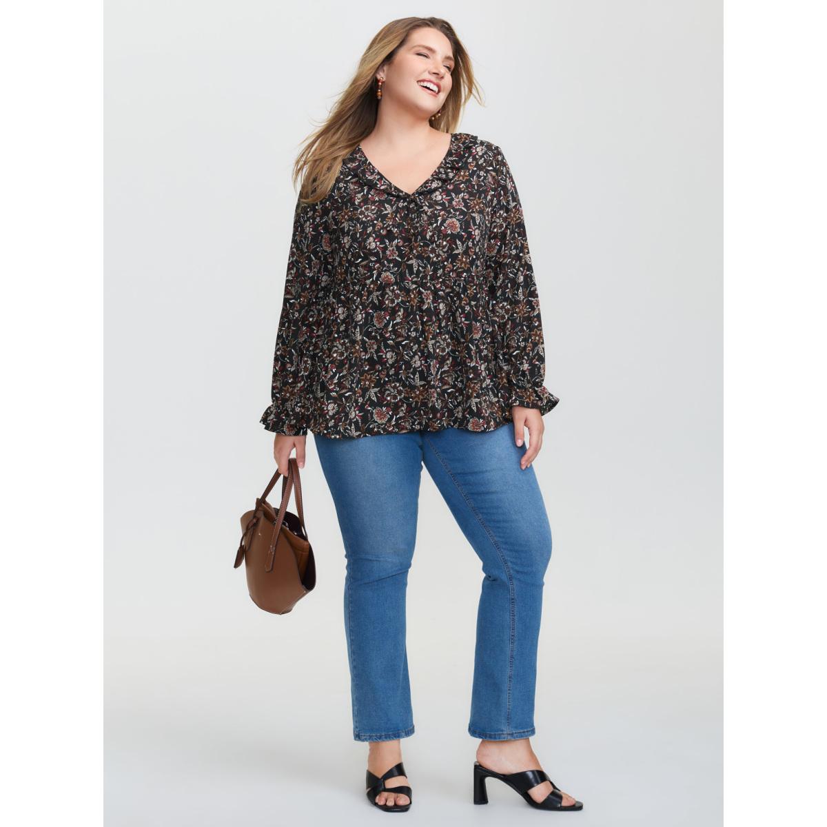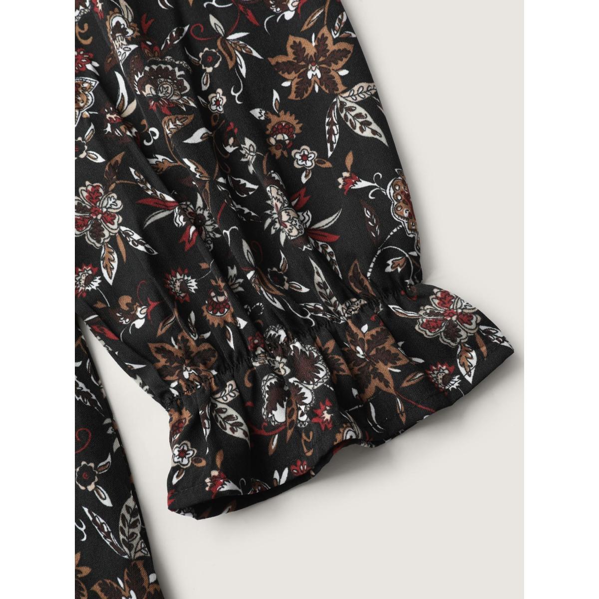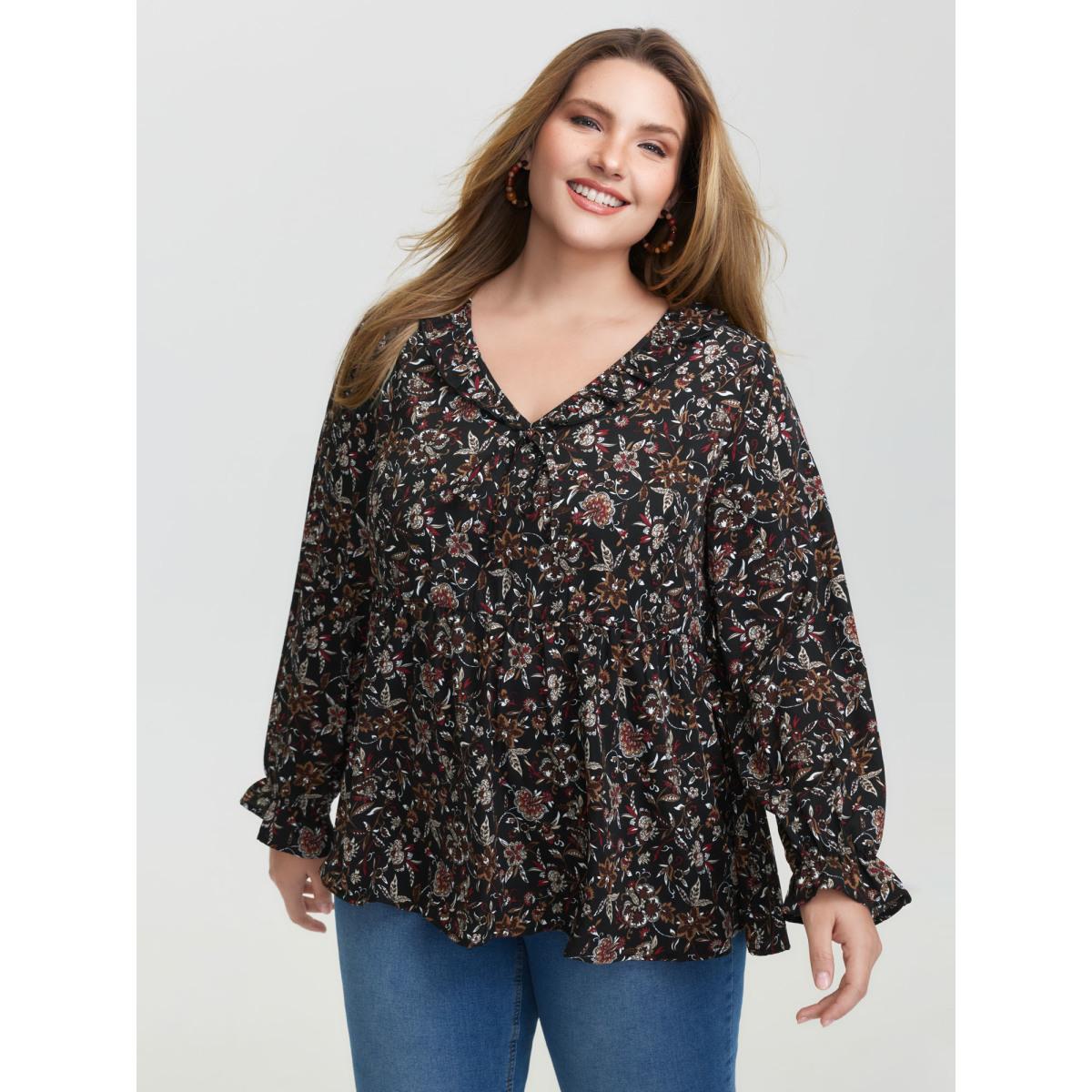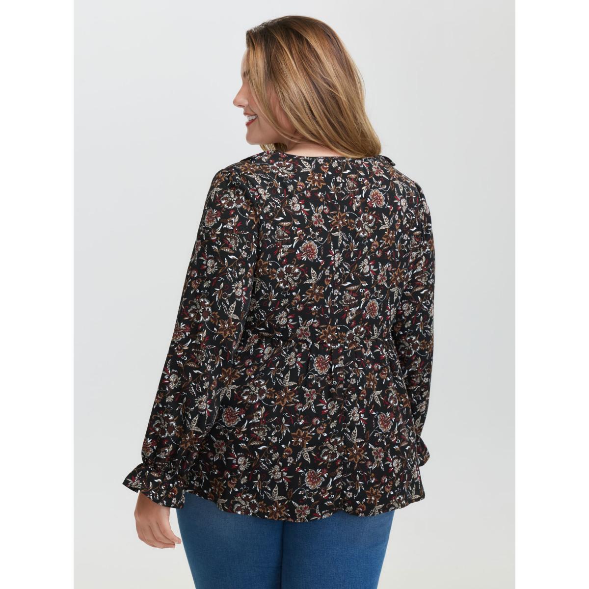 Plus Size Black Floral Print Ruffled Neck Blouse Women Boho Extra Long Sleeve V-neck Vacation Blouses BloomChic 14-16/1X