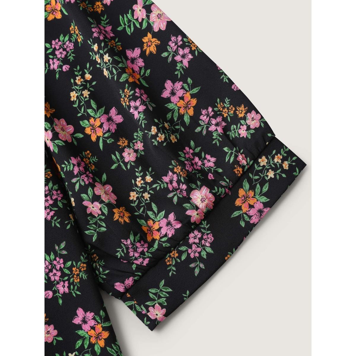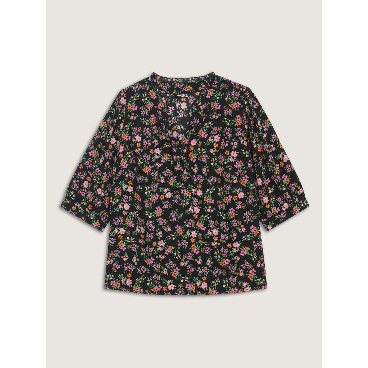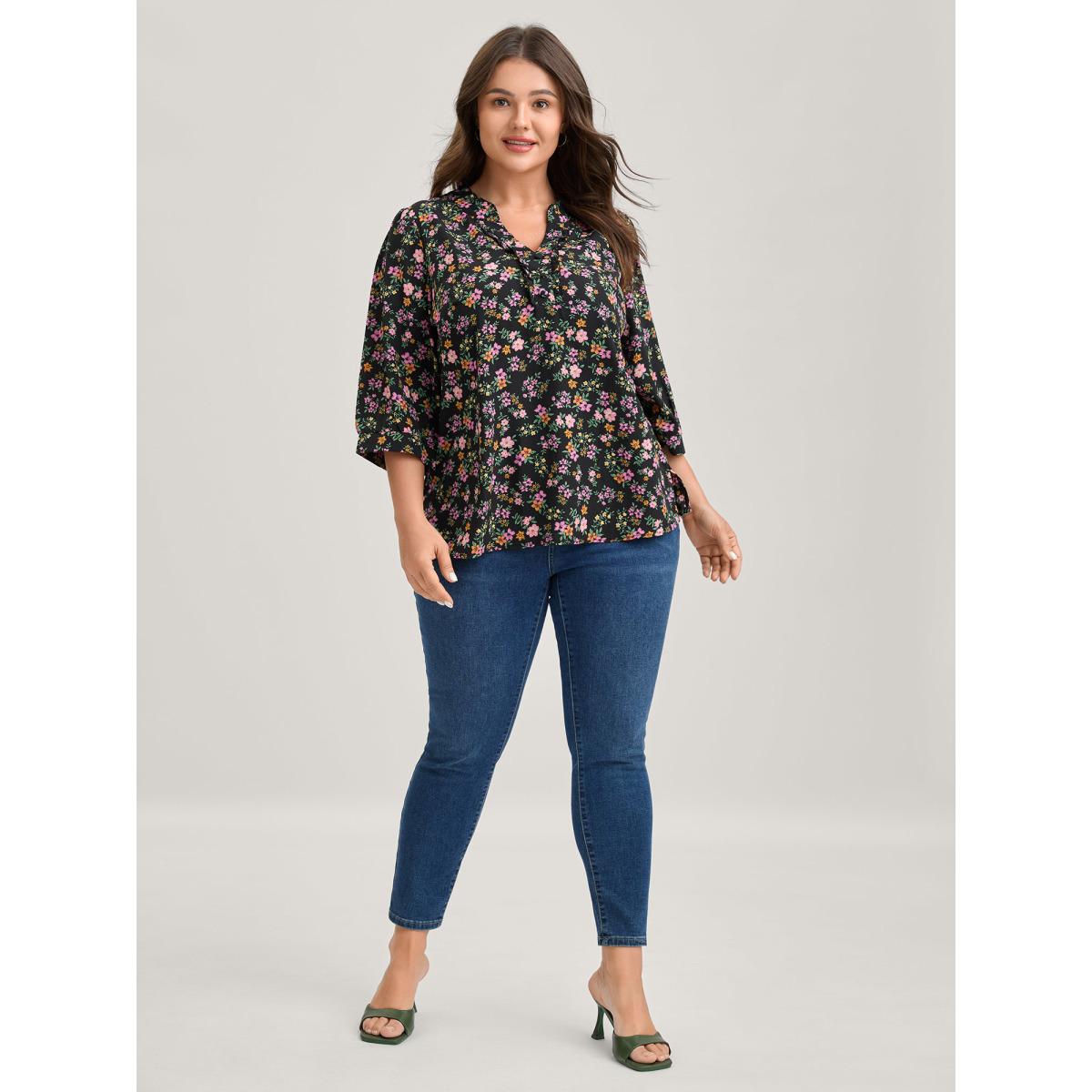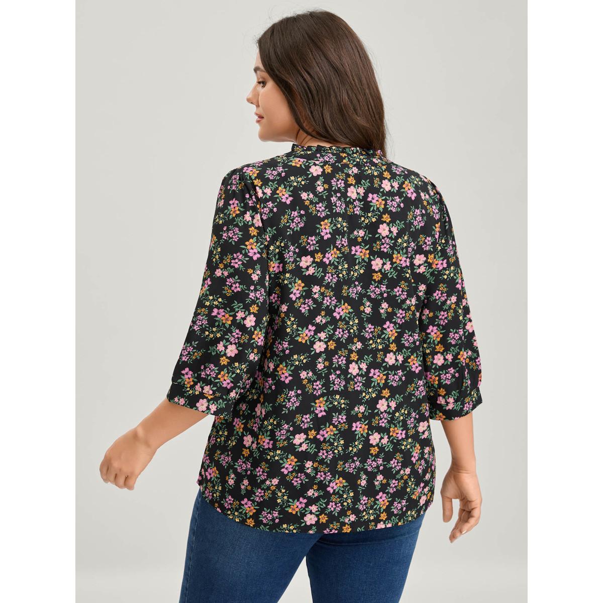 Plus Size Black Floral Print Ruffled Neckline Flowy Blouse Women Timeless Elbow-length sleeve Notched collar Elegant Blouses BloomChic 10/M