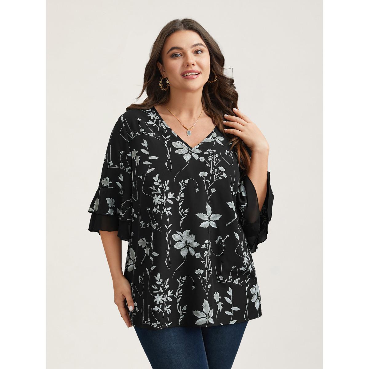Plus Size BlackFlower Floral Print Layered Ruffle Sleeve Blouse Women Elegant Short sleeve V-neck Dailywear Blouses BloomChic 14-16/1X