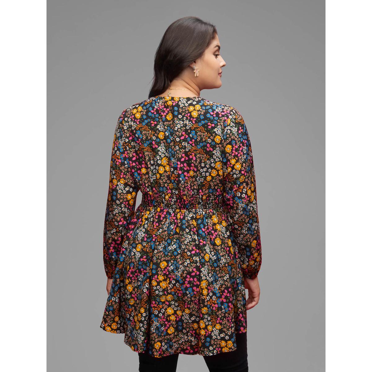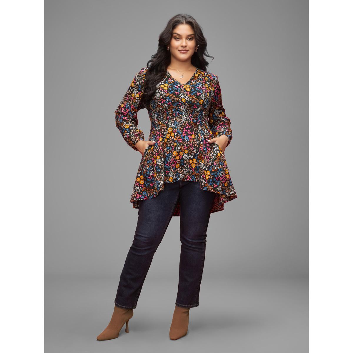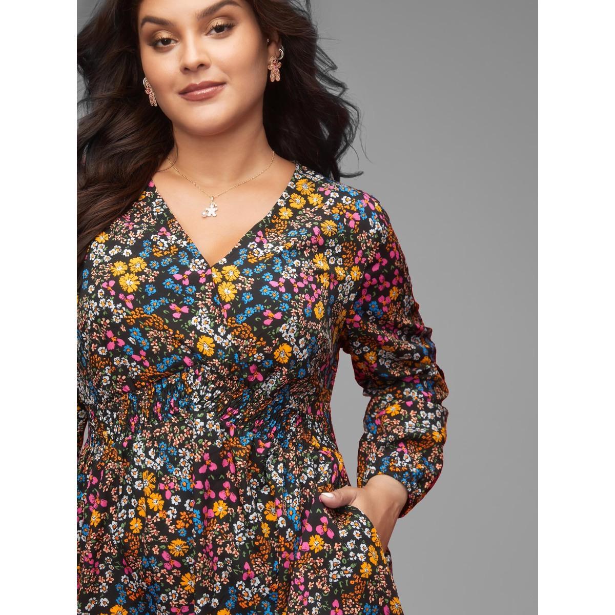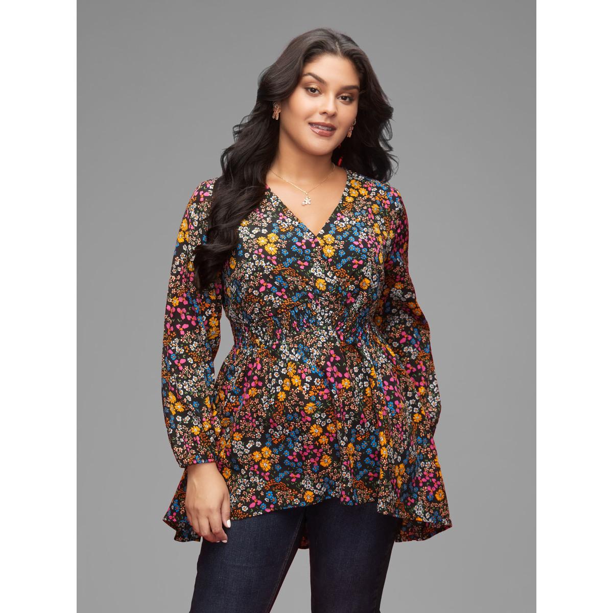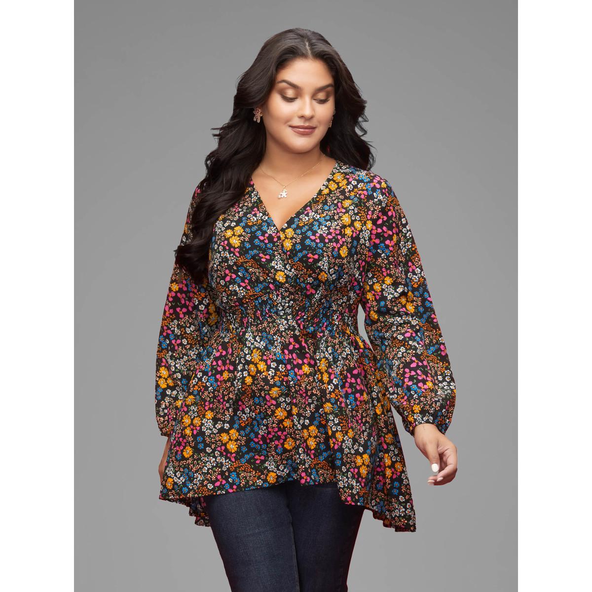 Plus Size Black Floral Smocked Waistline Surplice Neck Blouse Women Elegant Long Sleeve Overlap Collar Everyday Blouses BloomChic 12/L