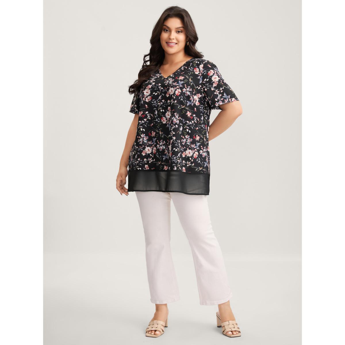 Plus Size Black Floral Print V-Neck Flowy Blouse Women Playful Short sleeve V-neck Vacation Blouses BloomChic 30/6X