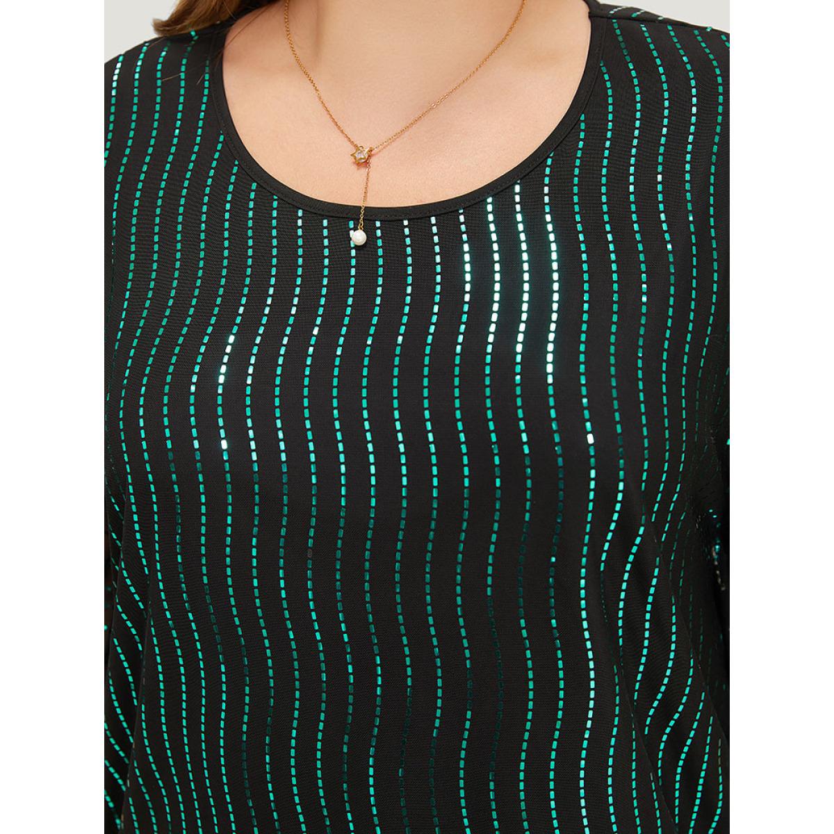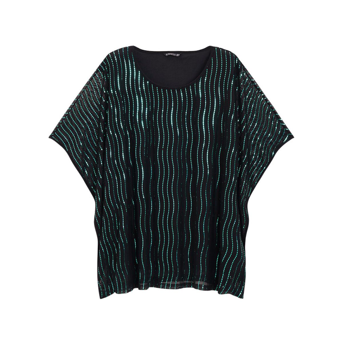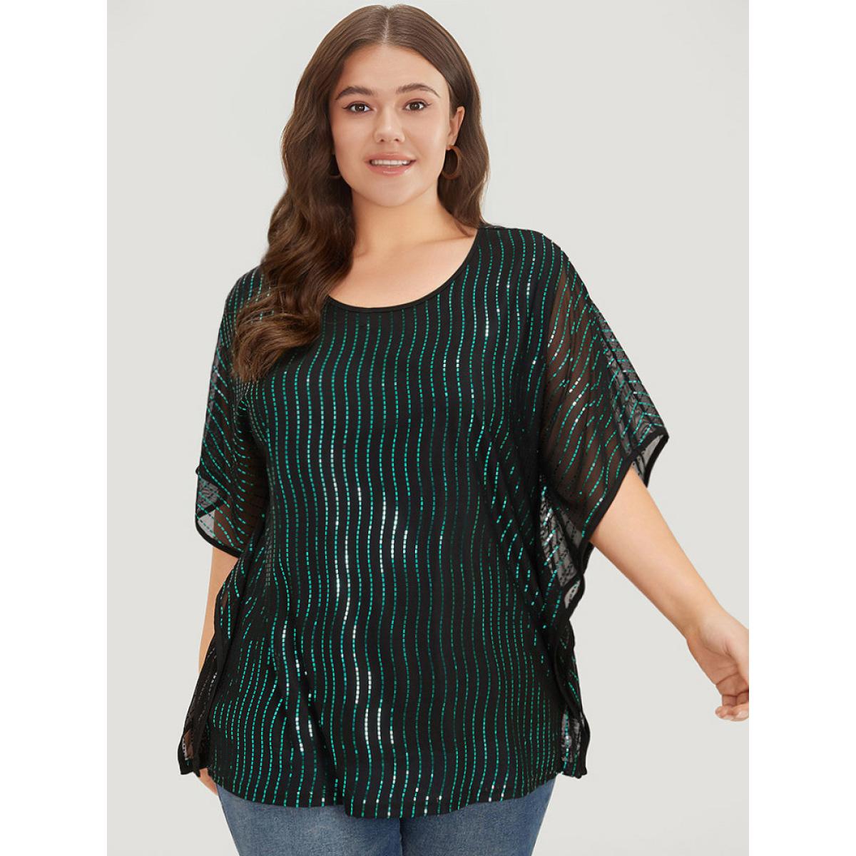 Plus Size Black Glitter Striped Mesh Batwing Sleeve Blouse Women Party Short sleeve Round Neck Going out Blouses BloomChic 22-24/3X