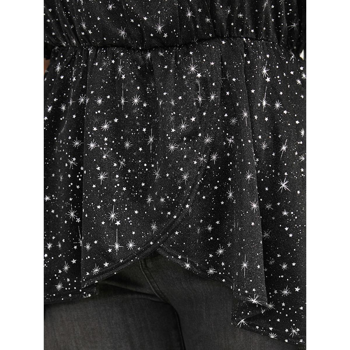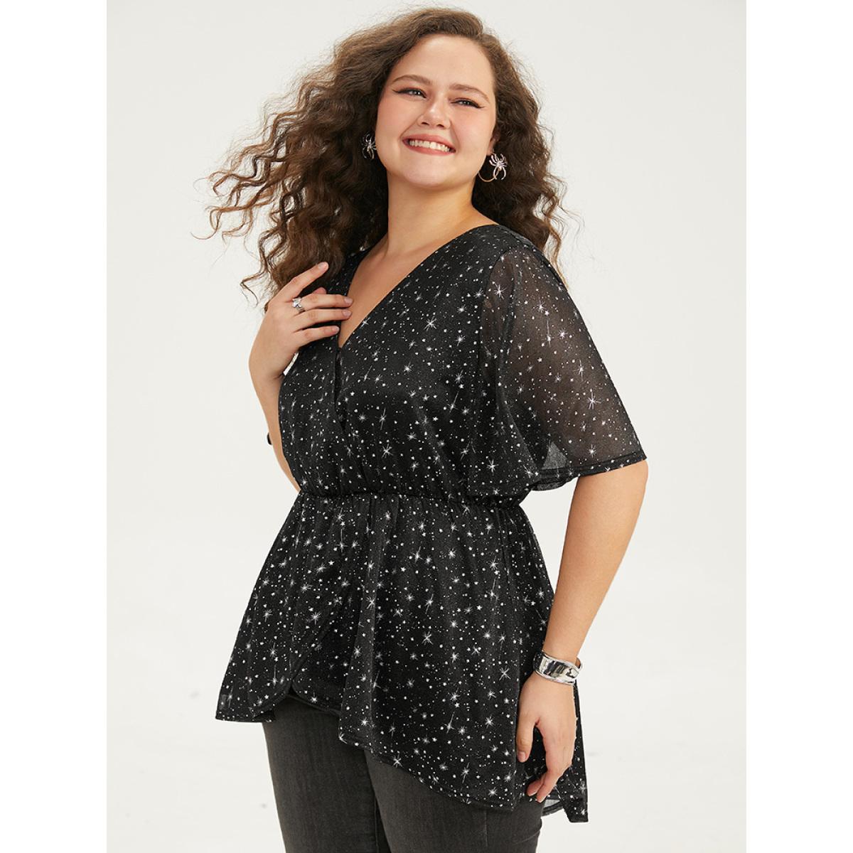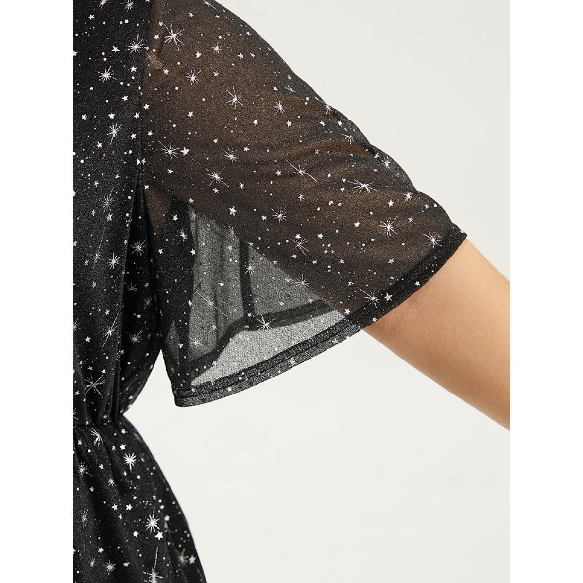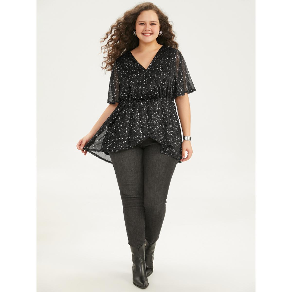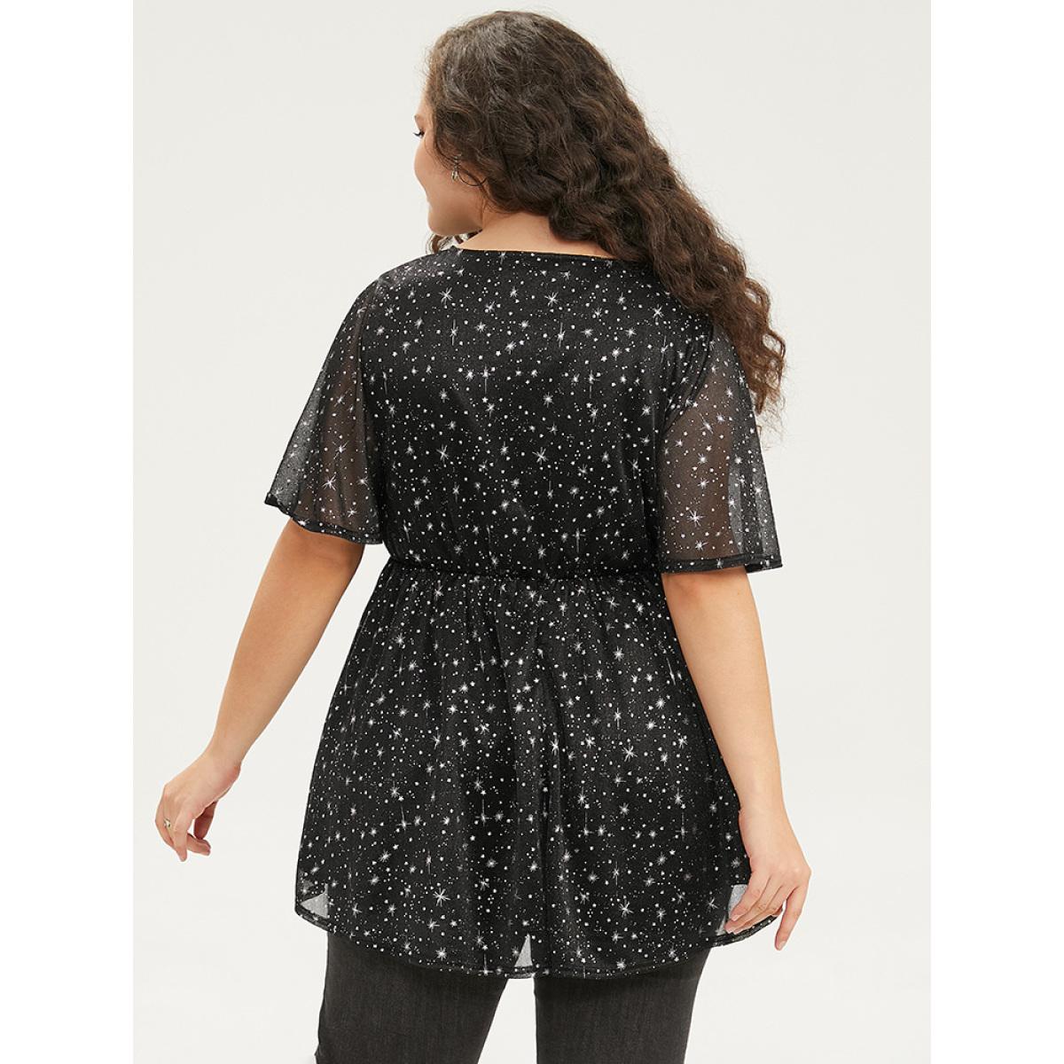 Plus Size Black Halloween Star Glitter Wrap Mesh Flutter Sleeve Blouse Women Elegant Short sleeve V-neck Festival-Halloween Blouses BloomChic 10/M