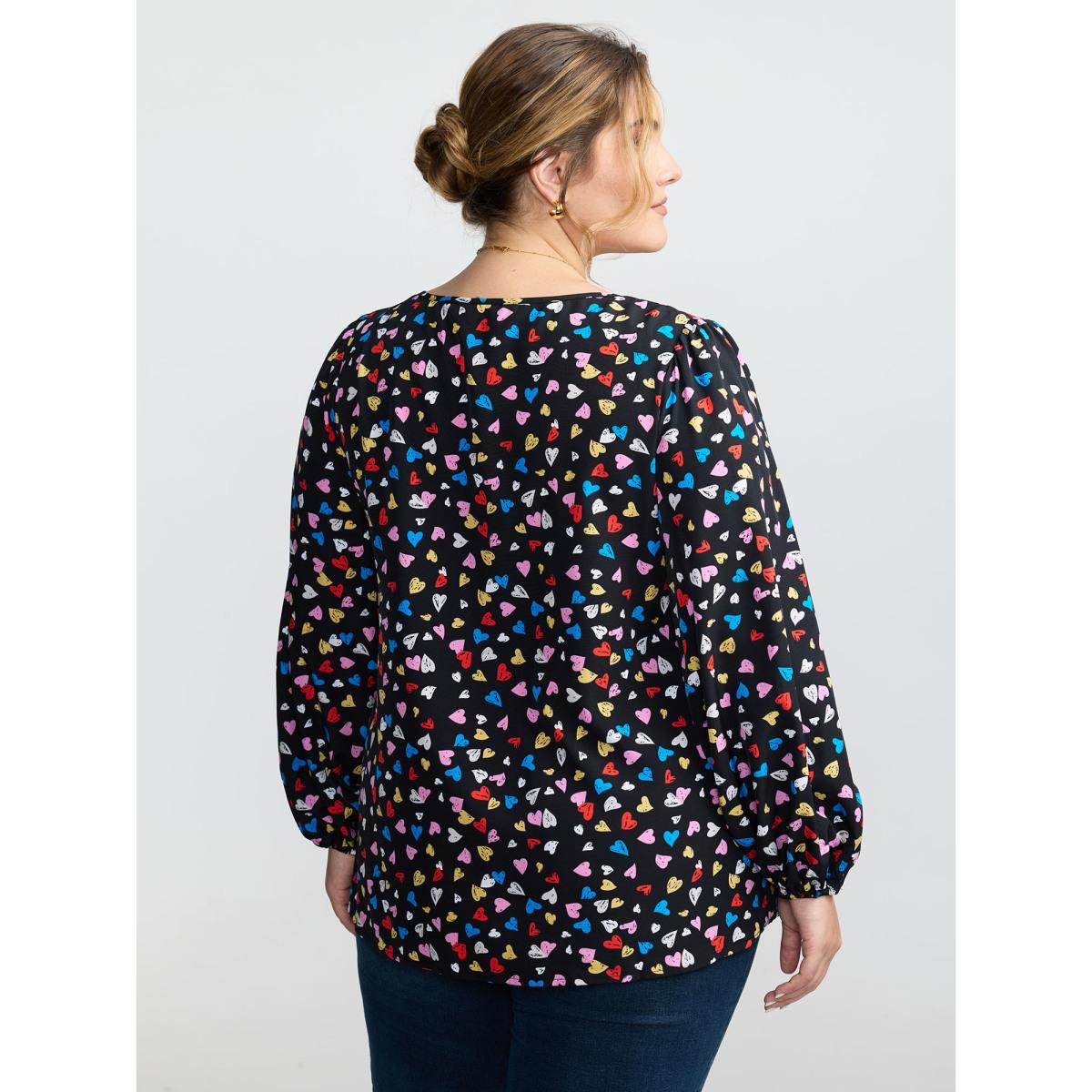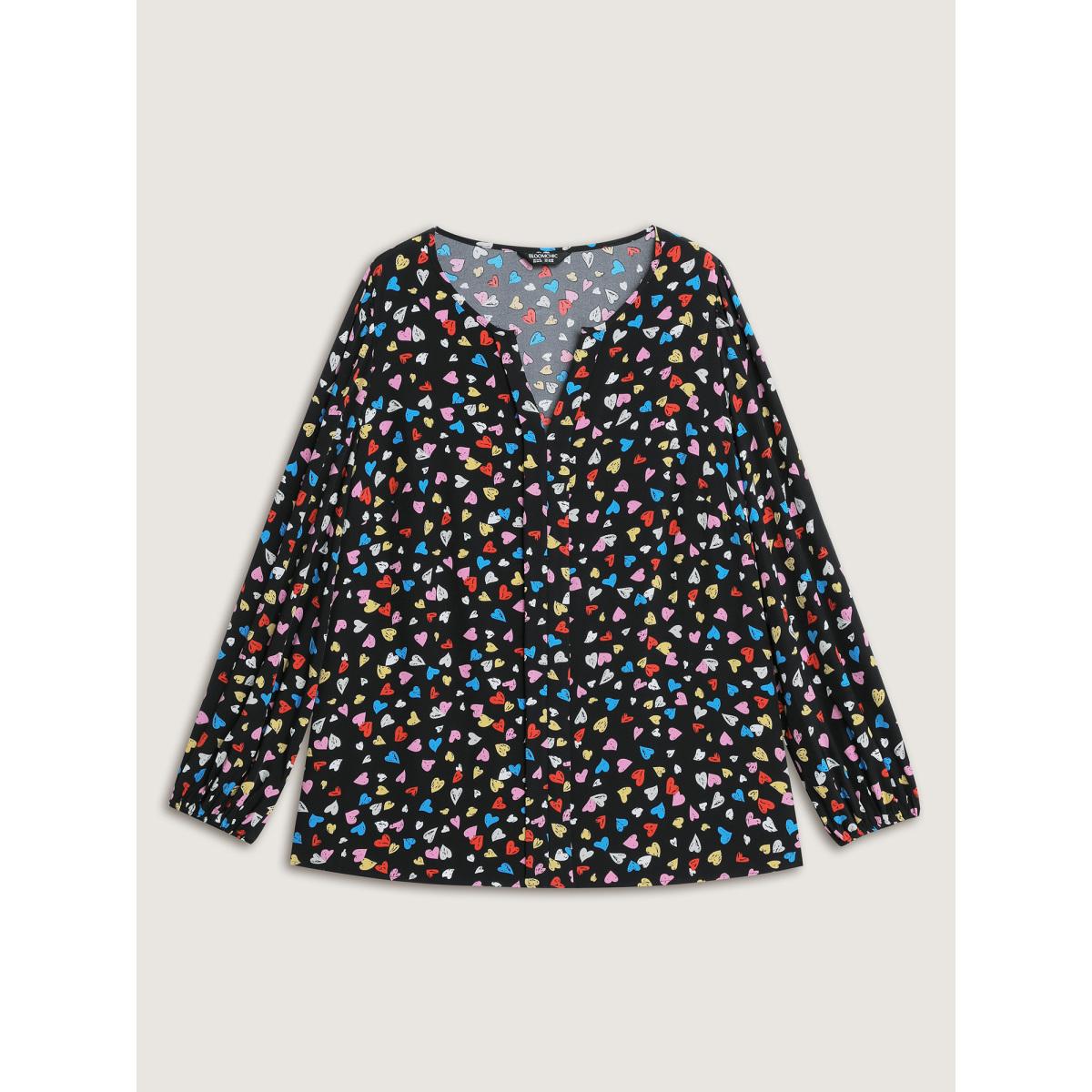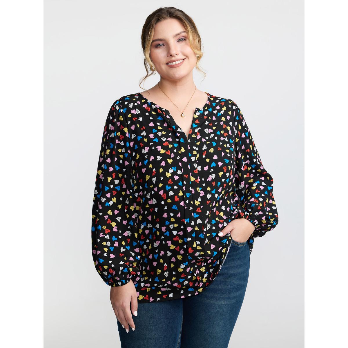 Plus Size Black Multicolor Hearts Print Notched Collar Blouse Women Long Sleeve Notched collar Elegant Blouses BloomChic 12/L