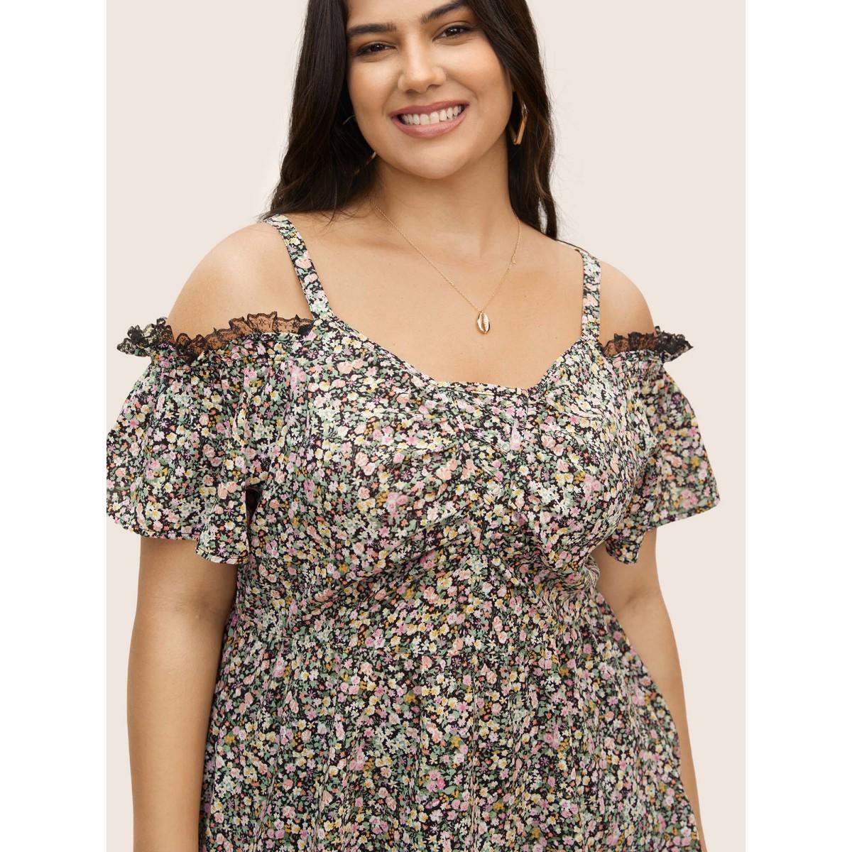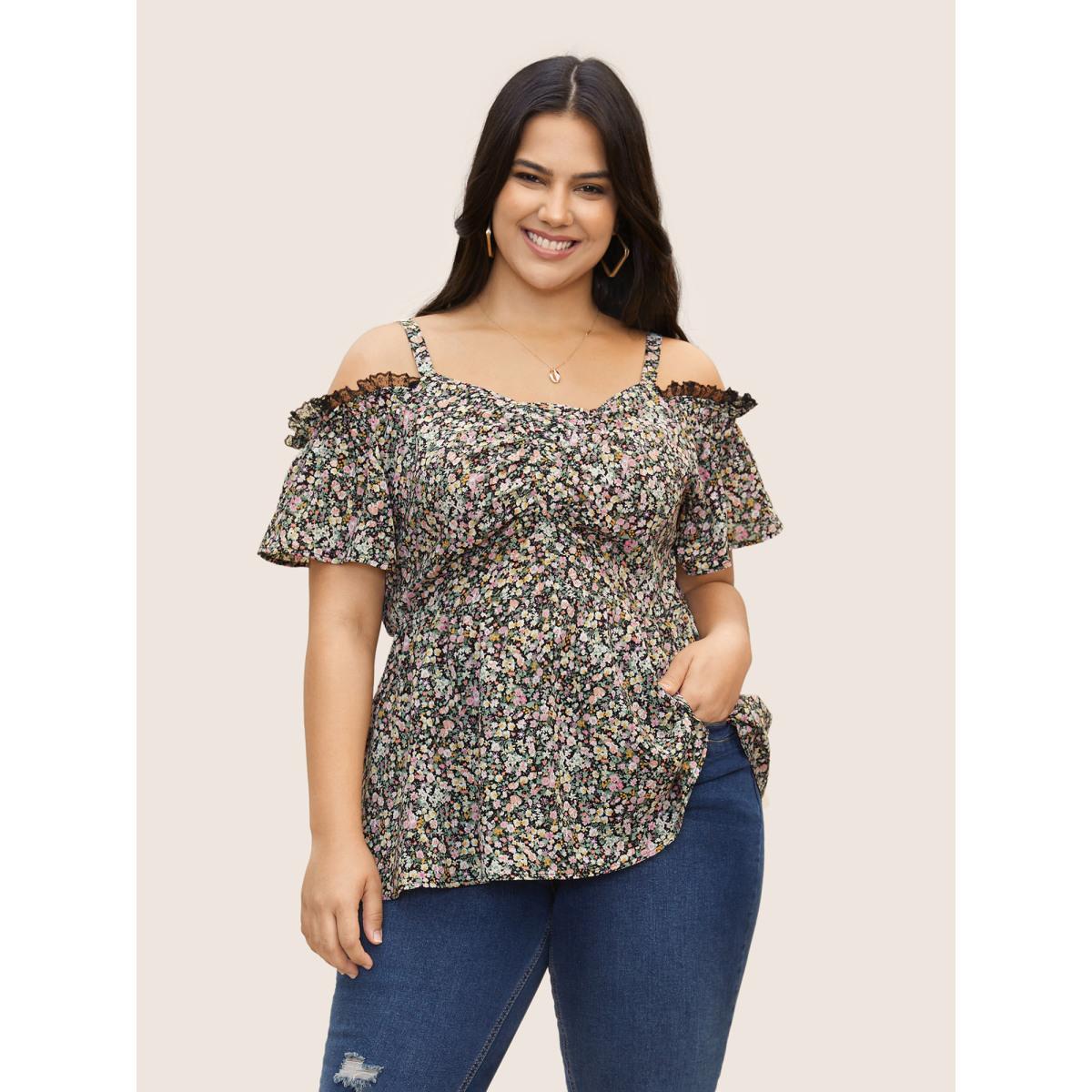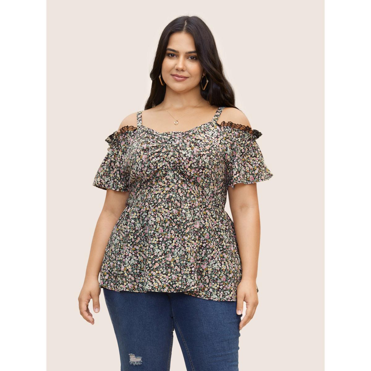 Plus Size Black Off Shoulder Ditsy Floral Lace Panel Blouse Women Elegant Short sleeve One-shoulder neck Everyday Blouses BloomChic 30/6X
