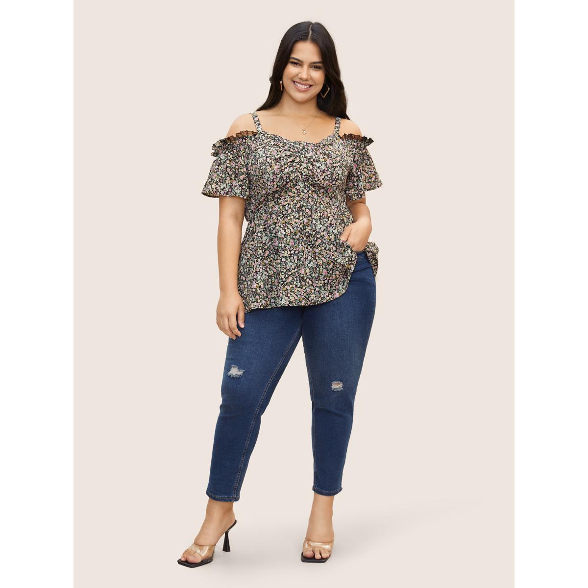 Plus Size Black Ditsy Floral Shirred Ruffle Sleeve Elastic Waist Blouse Women Timeless Short sleeve V-neck Elegant Blouses BloomChic 28/5X