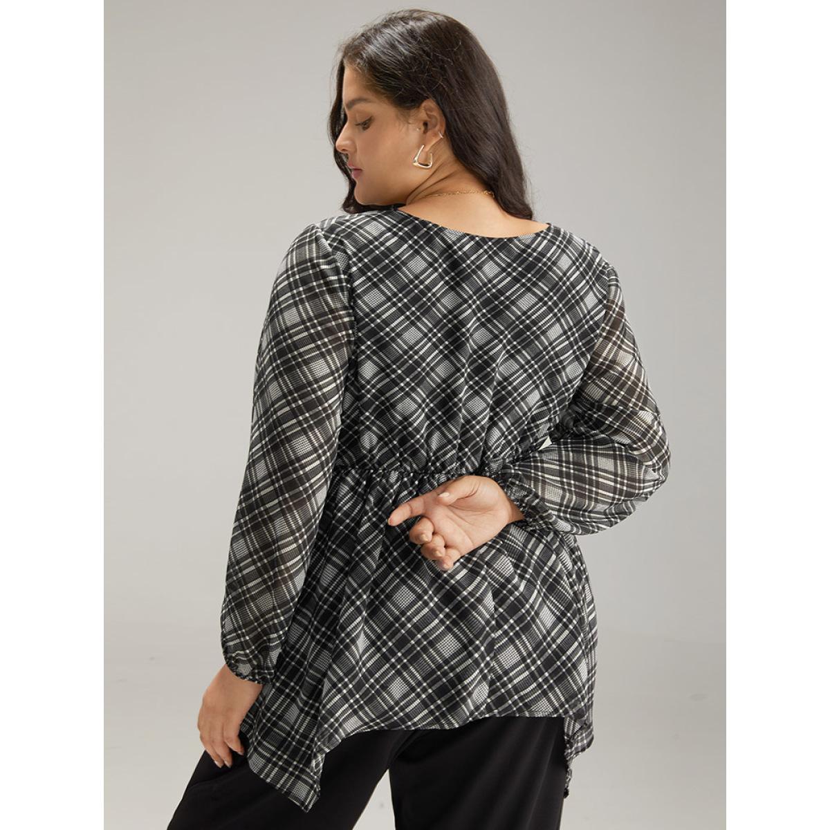 Plus Size Black Plaid Chiffon Lantern Sleeve Hanky Hem Blouse Women Office Long Sleeve Round Neck Office Blouses BloomChic 12/L