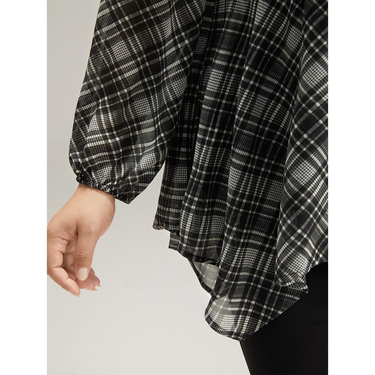 Plus Size Black Plaid Chiffon Lantern Sleeve Hanky Hem Blouse Women Office Long Sleeve Round Neck Office Blouses BloomChic 30/6X