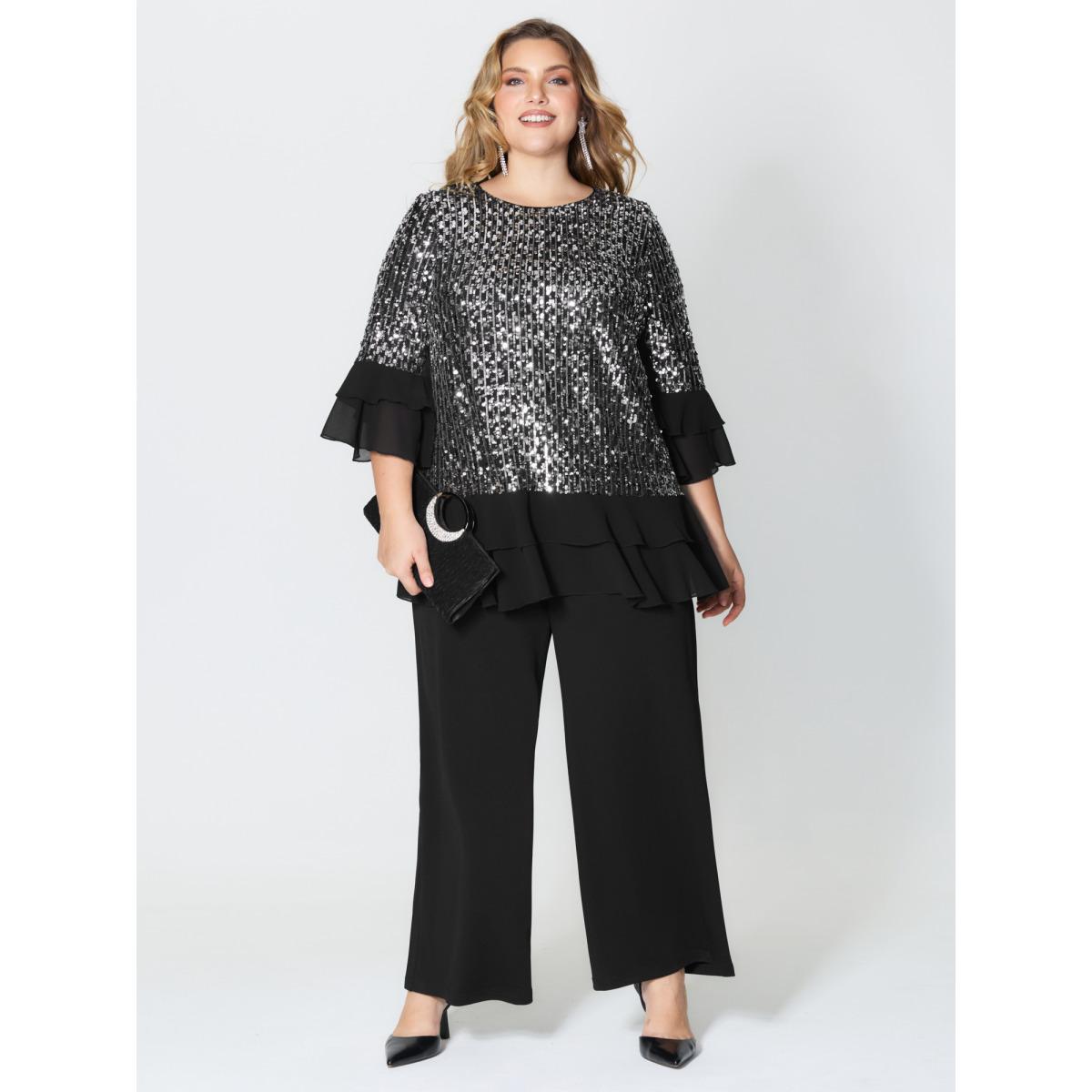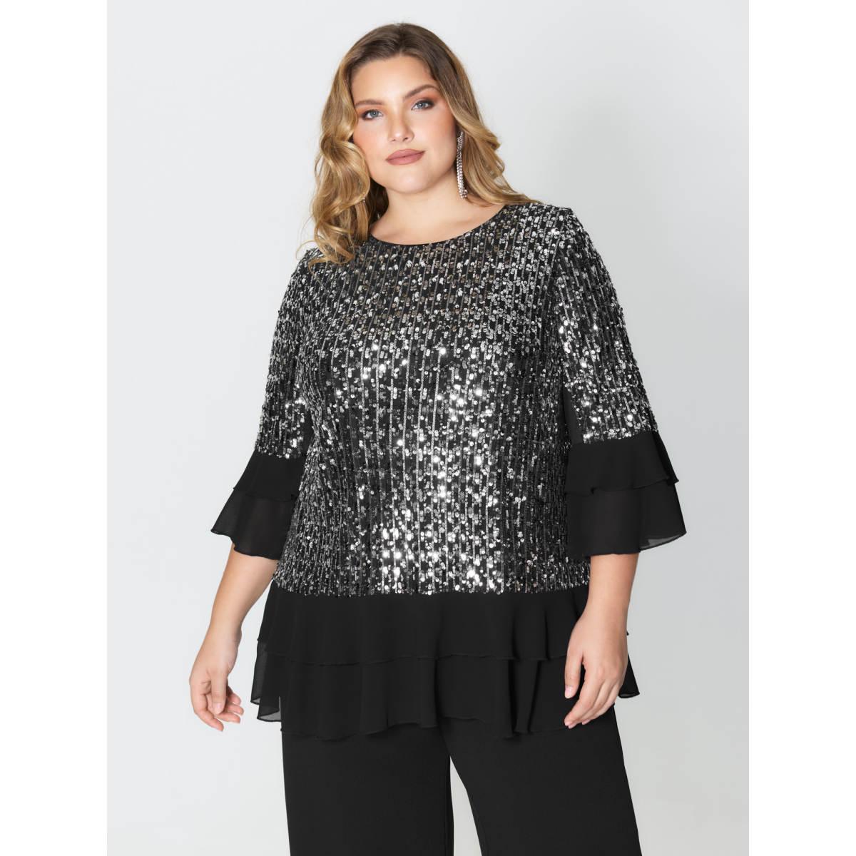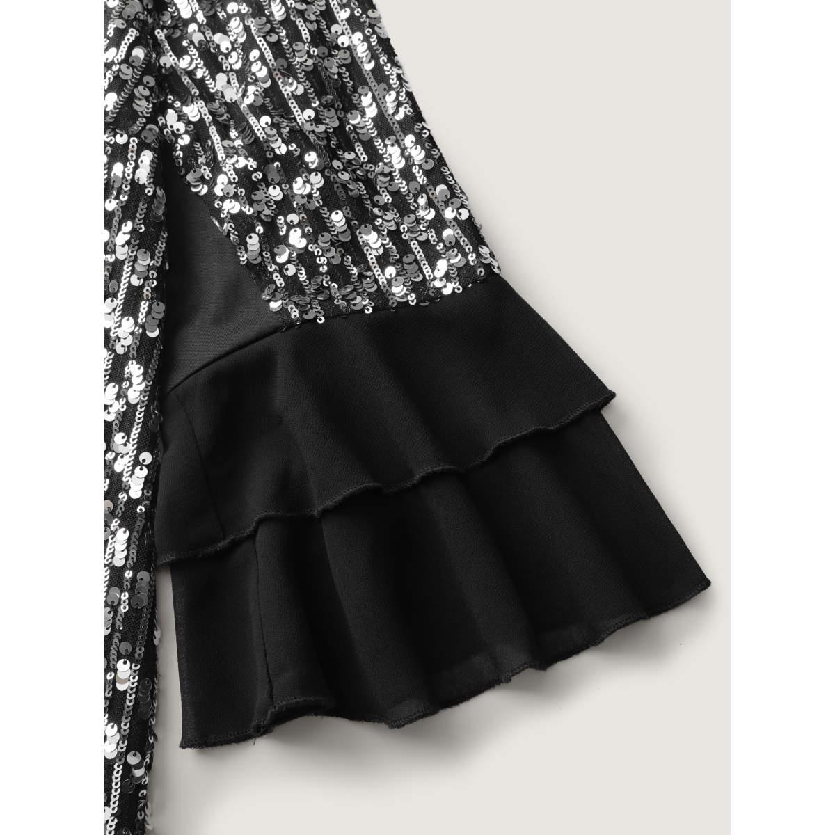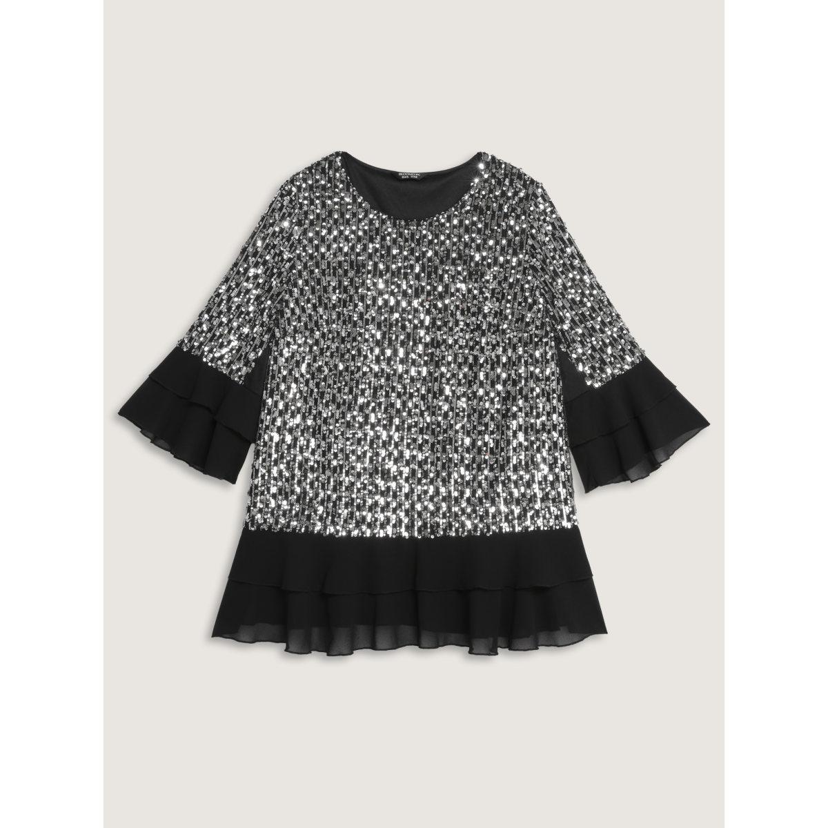 Plus Size Black Sequin Layered Ruffled Sleeve Blouse Women Party&Cocktail Elbow-length sleeve Round Neck Party Blouses BloomChic 28/5X