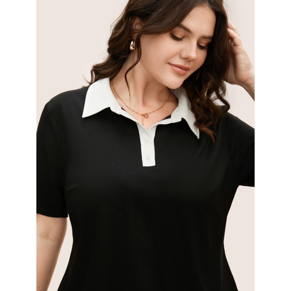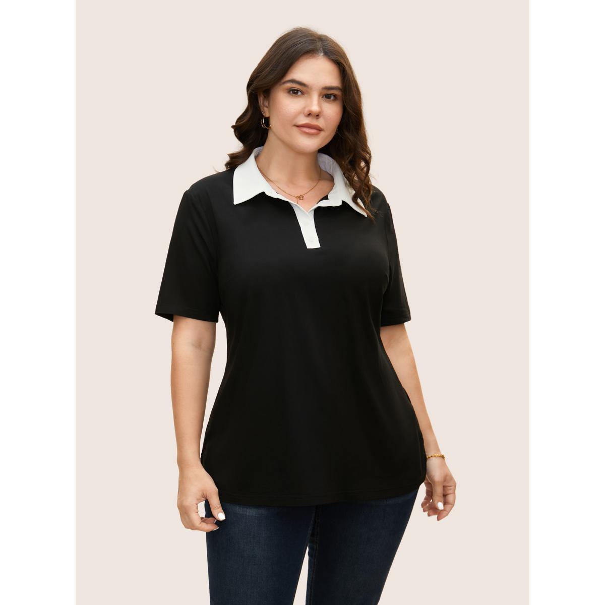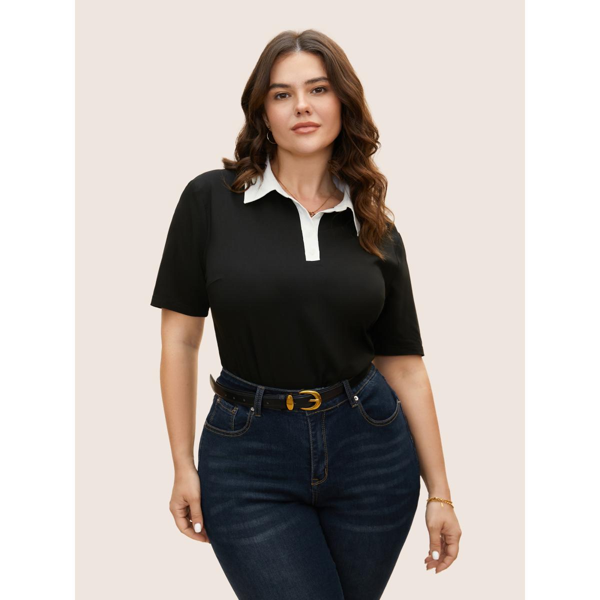 Plus Size Black Stretchy Woven Shirt Collar Contrast Blouse Women Workwear Essentials Short sleeve Shirt collar Work Blouses BloomChic 14-16/1X