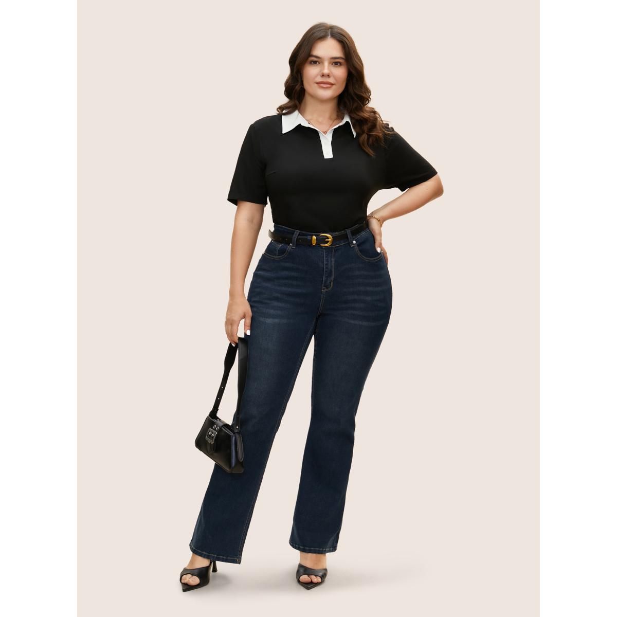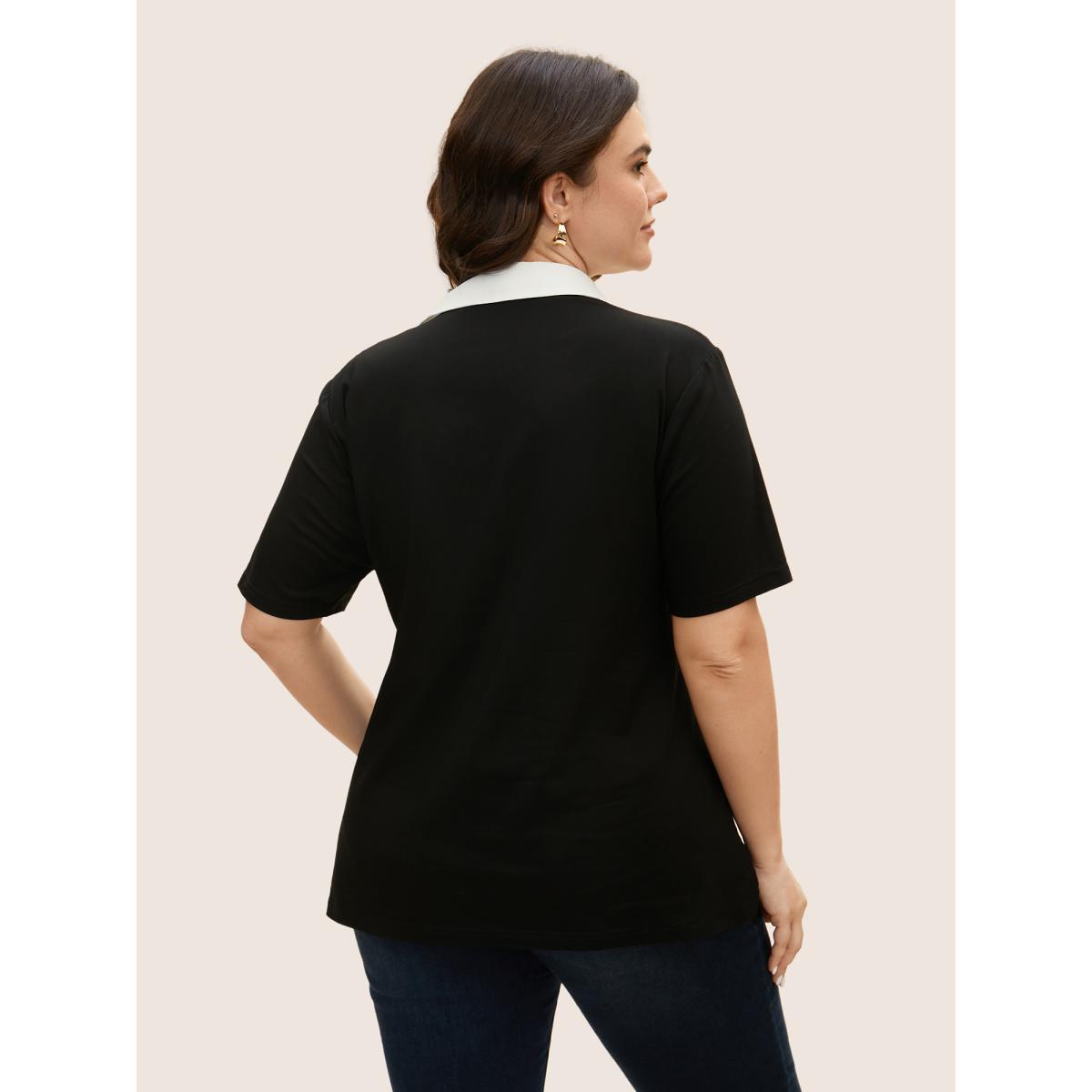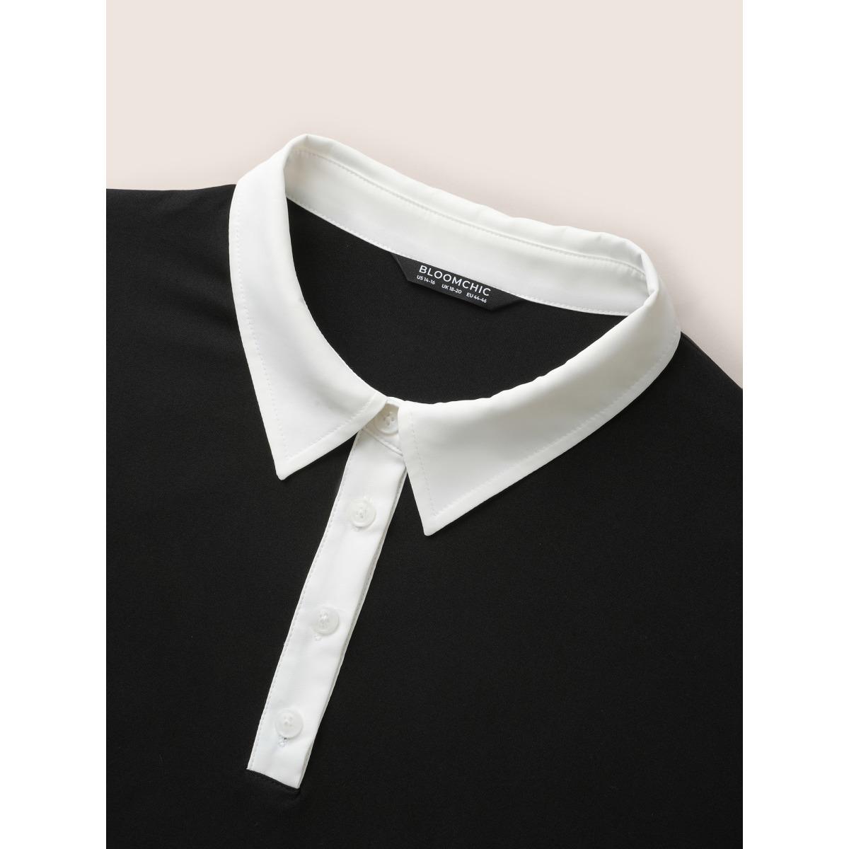 Plus Size Black Stretchy Woven Shirt Collar Contrast Blouse Women Workwear Essentials Short sleeve Shirt collar Work Blouses BloomChic 14-16/1X