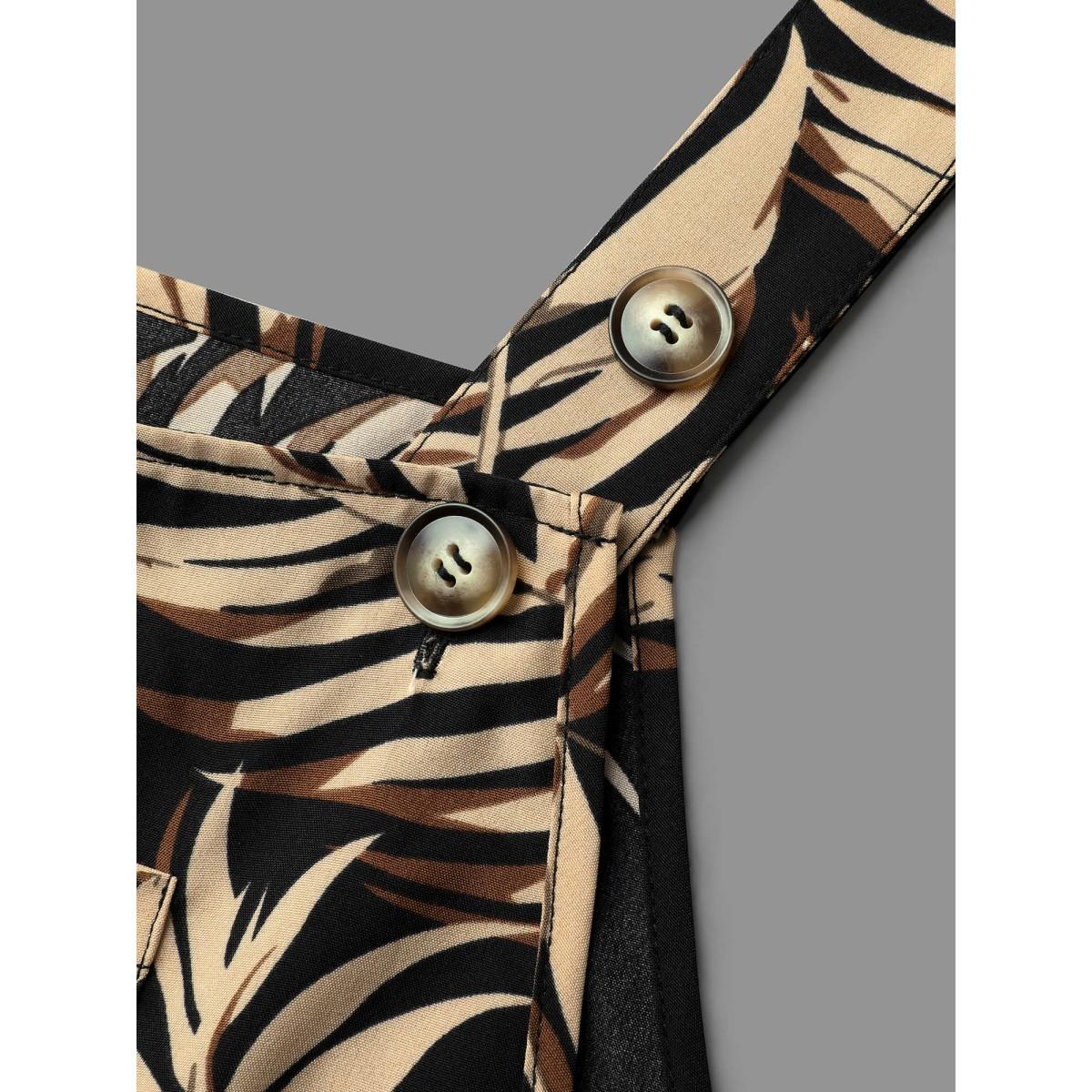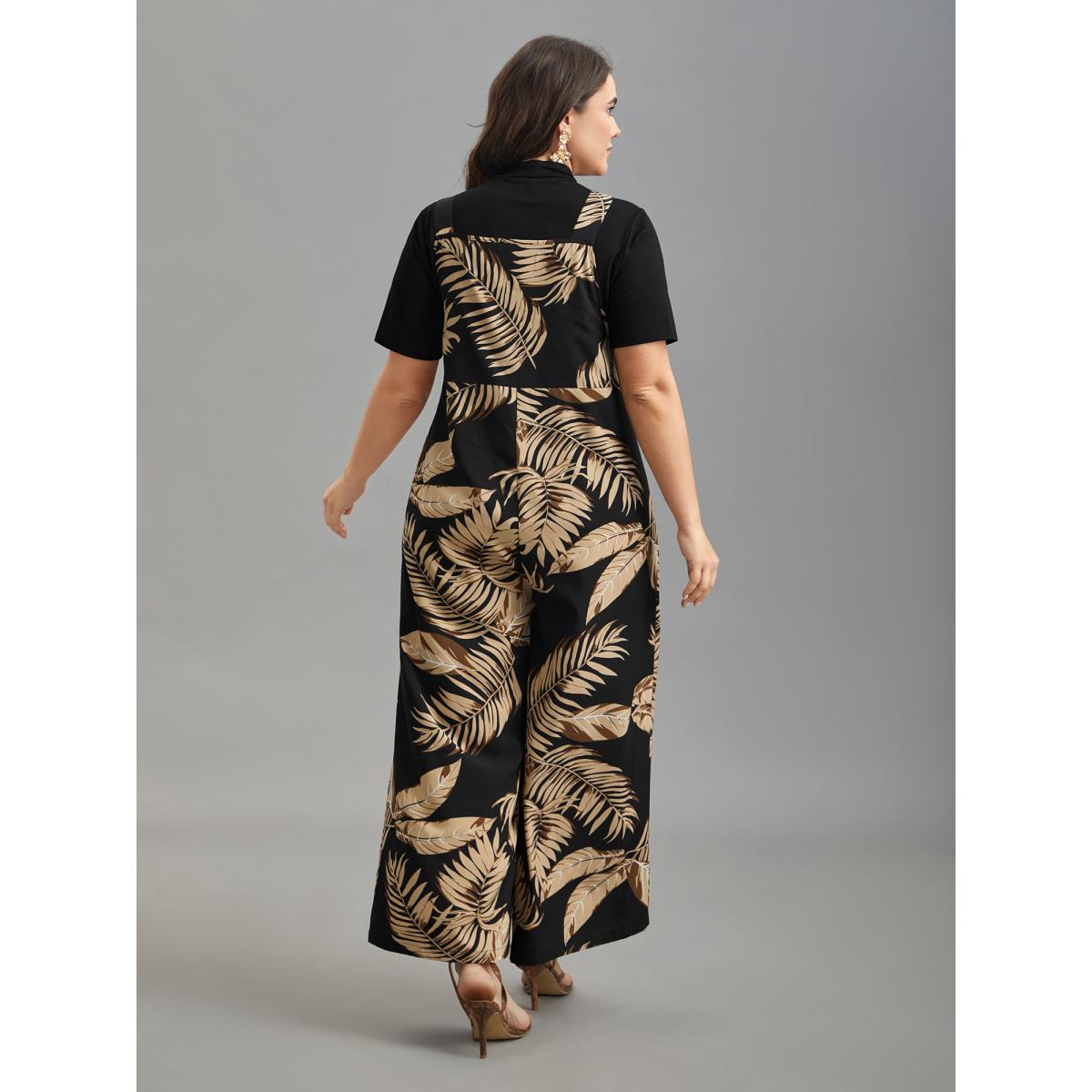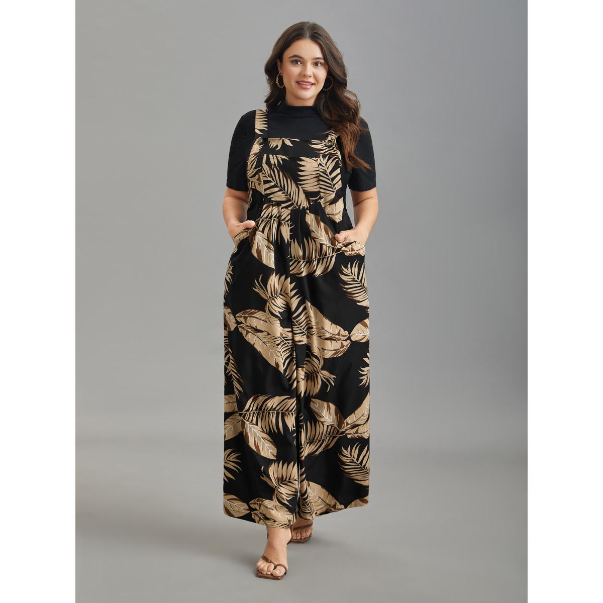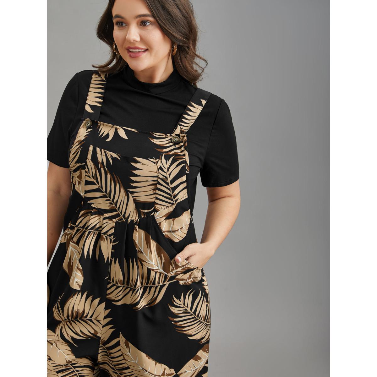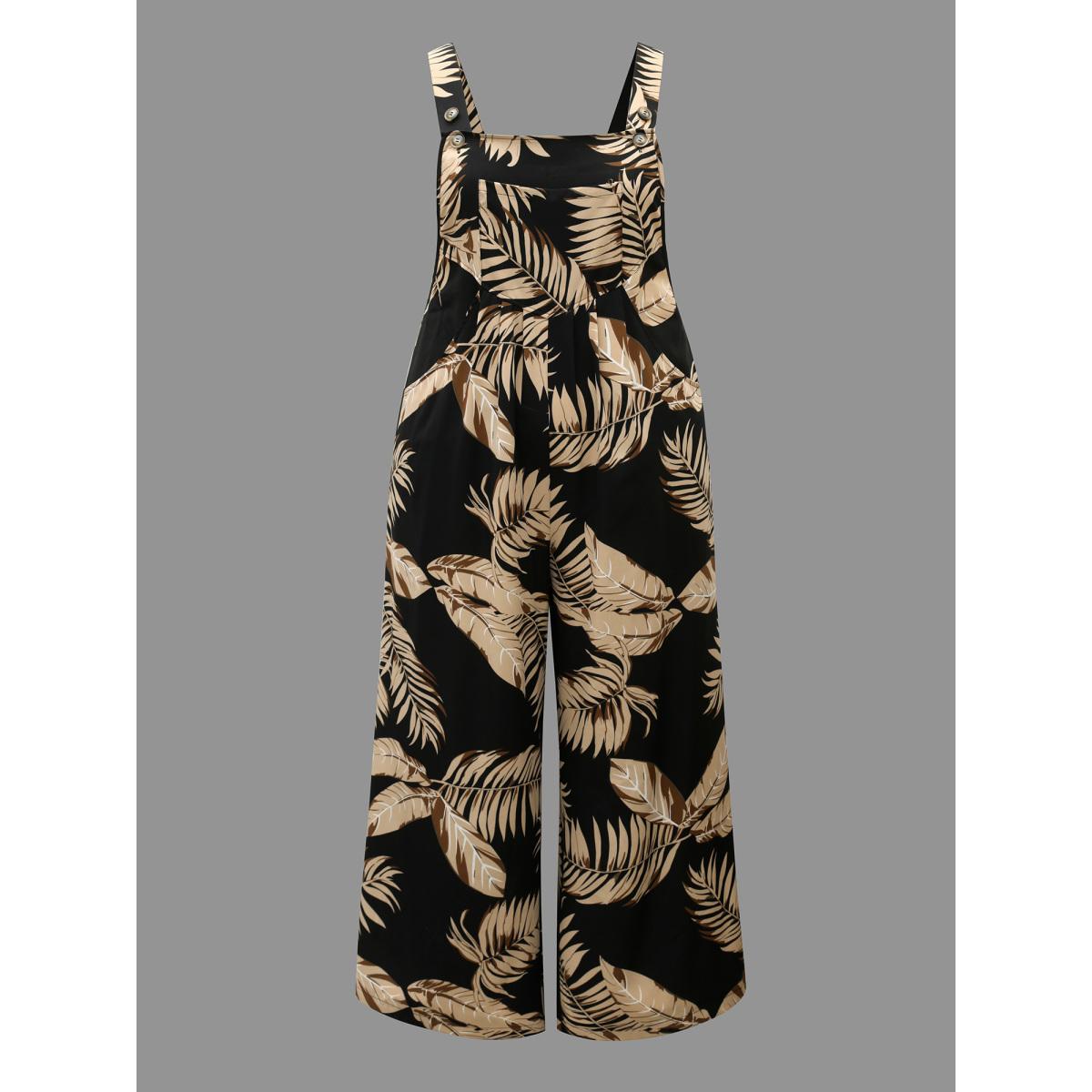 Plus Size Black Tropical Leaf Print Overall Straps Jumpsuit Women Elegant Sleeveless Non Everyday-Elegant Loose Jumpsuits BloomChic 28/5X