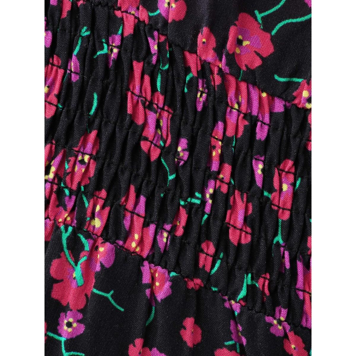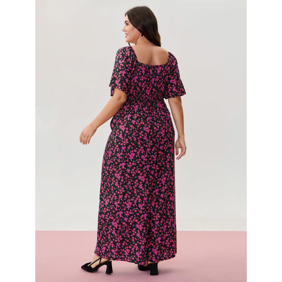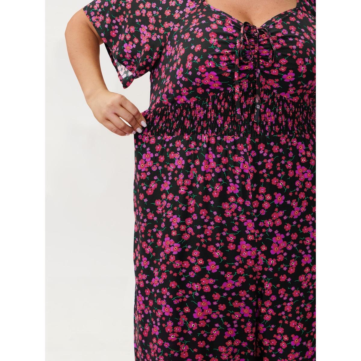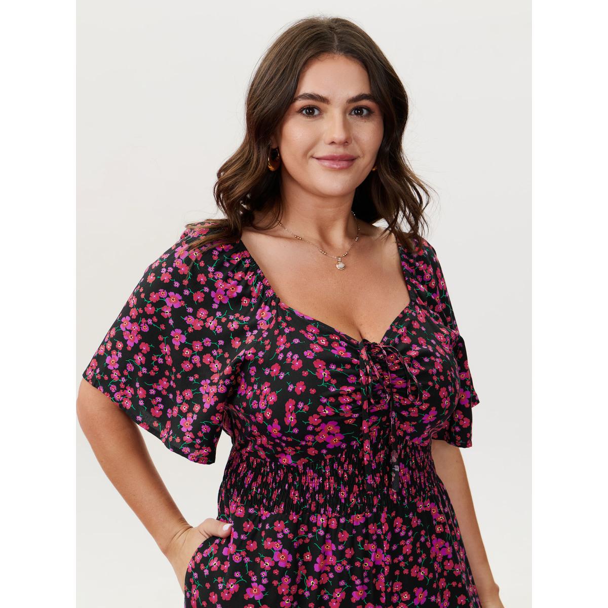 Plus Size BlackFlower Floral Romance Shirred Waist Jumpsuit Women Timeless Short sleeve Heart neckline Elegant Loose Jumpsuits BloomChic 12/L