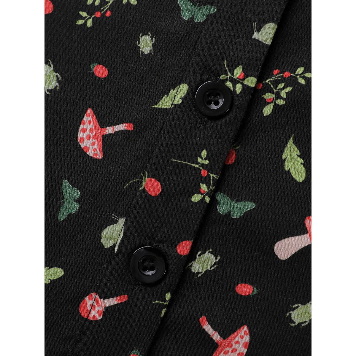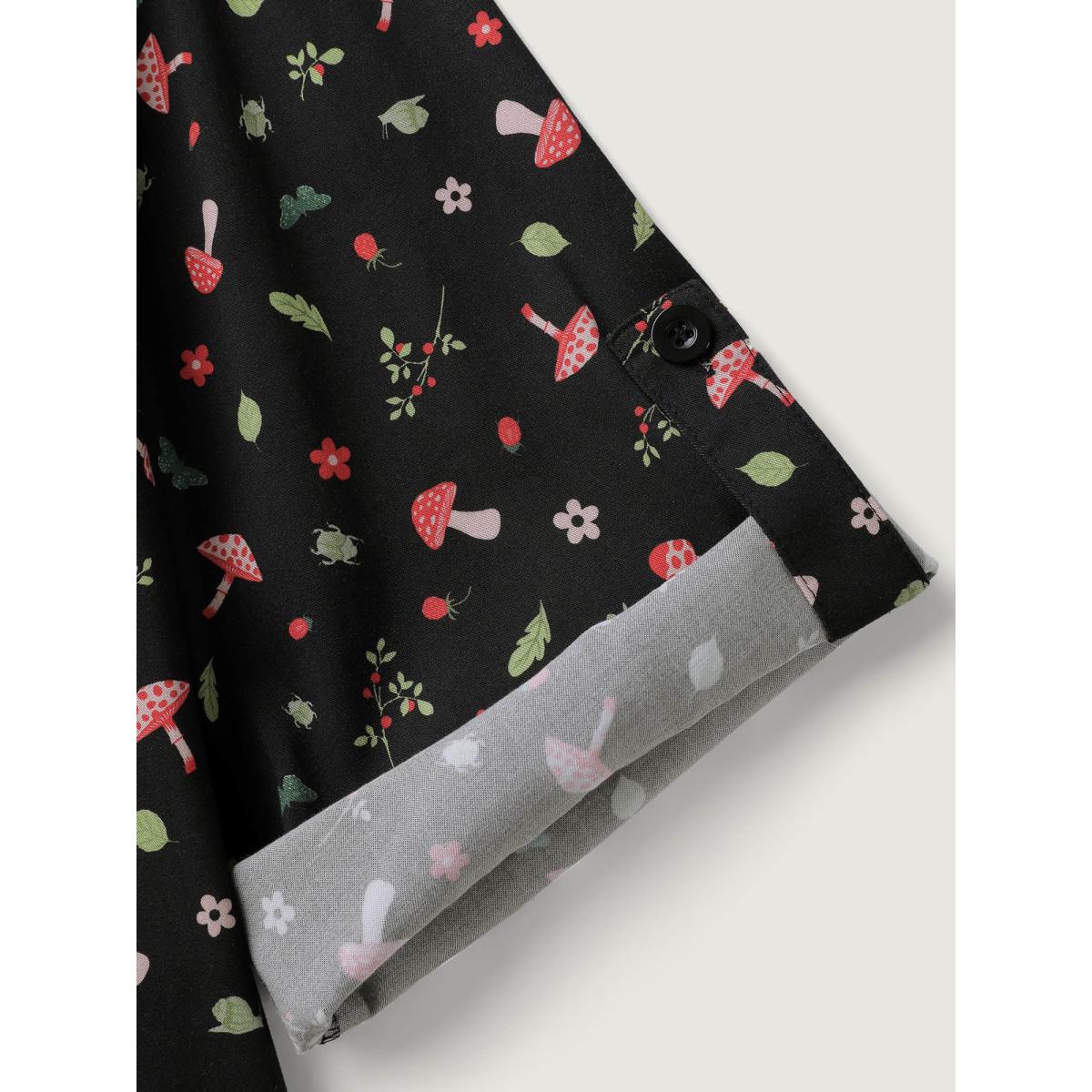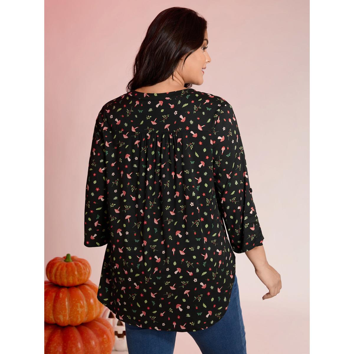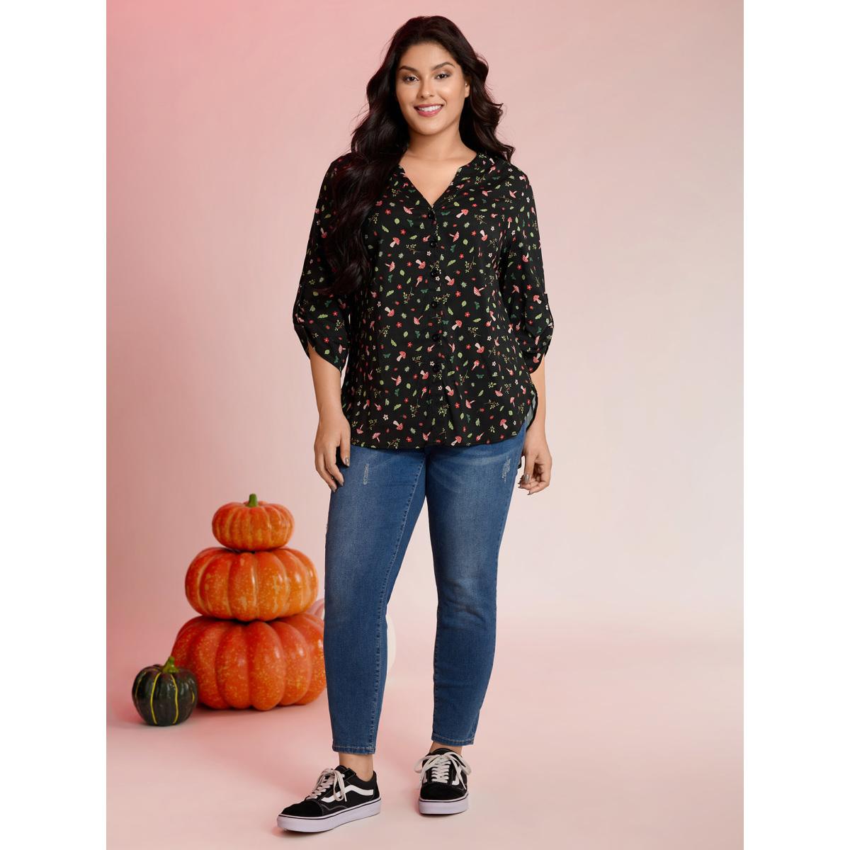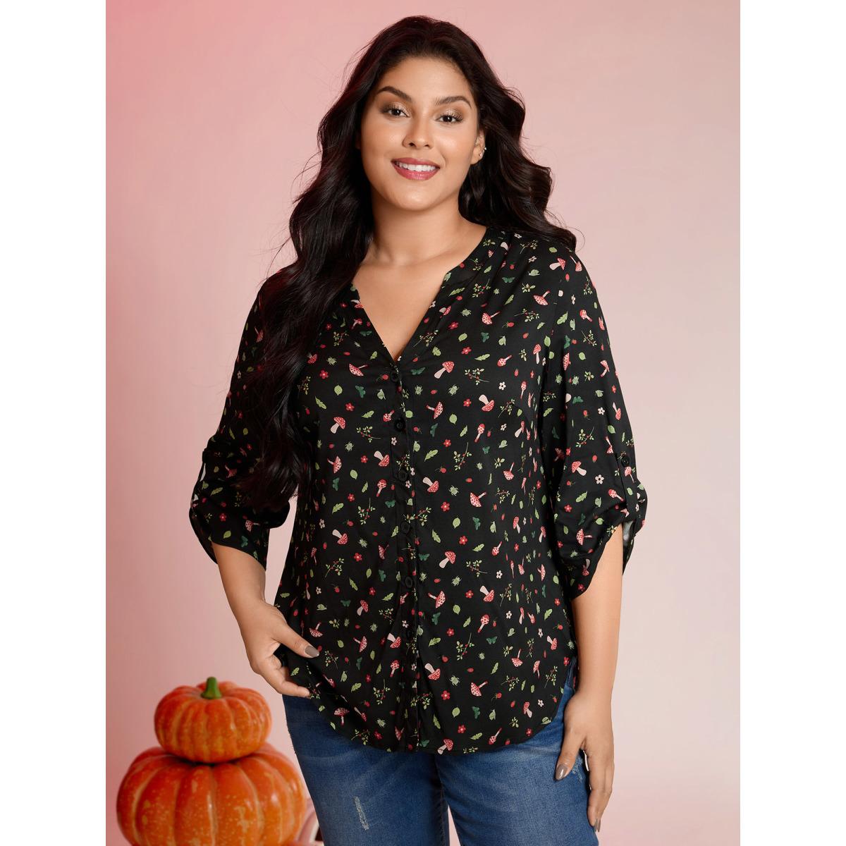 Plus Size BlackFlower Mushroom Print Adjustable Sleeve Placket Blouse Women Leisure Elbow-length sleeve Flat collar with V-notch Casual Blouses BloomChic 22-24/3X