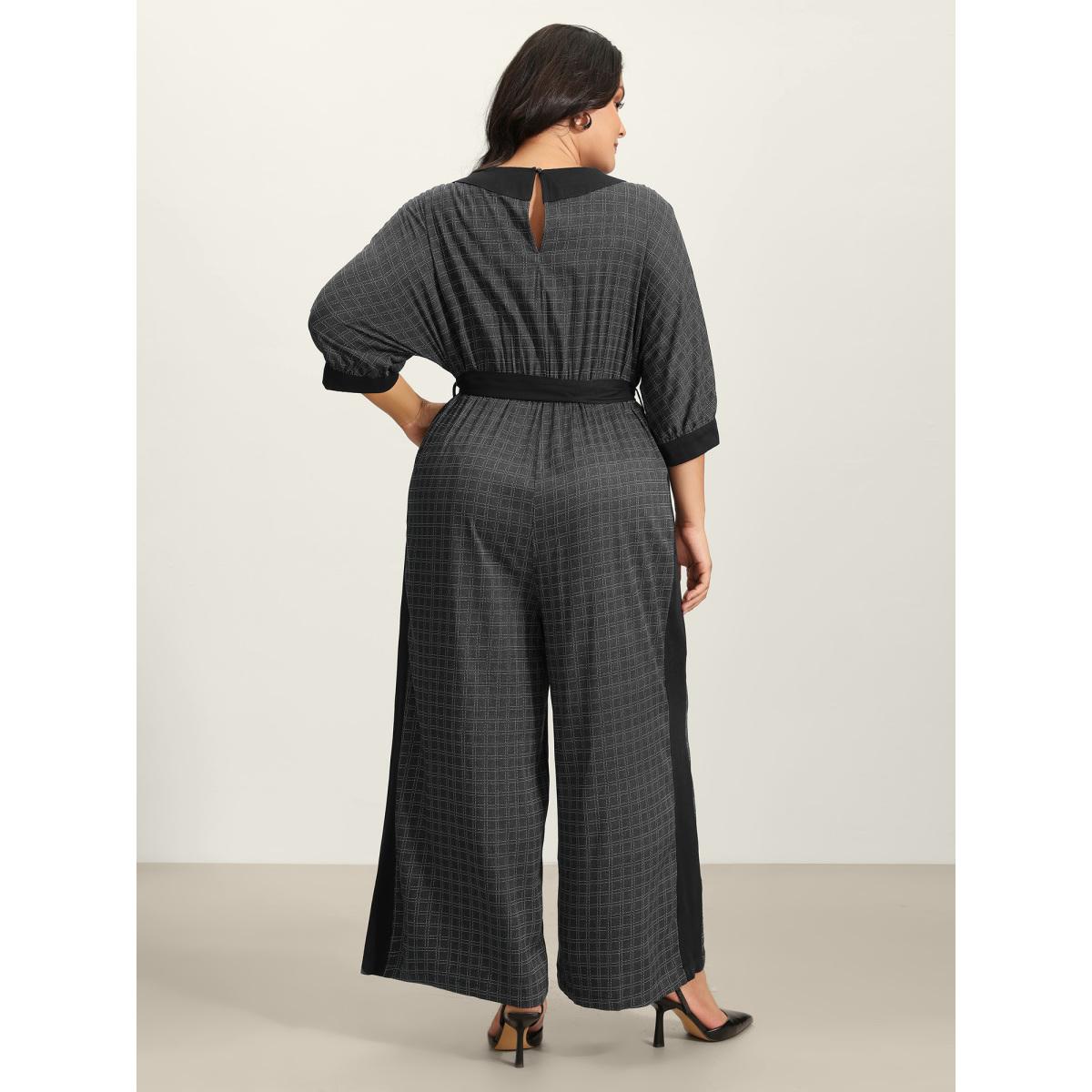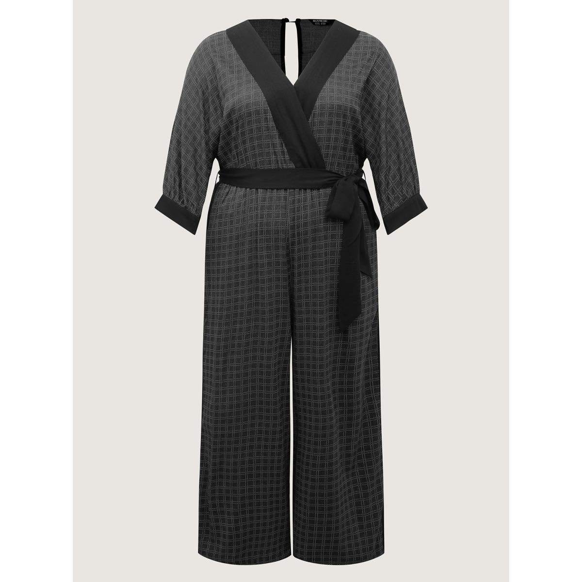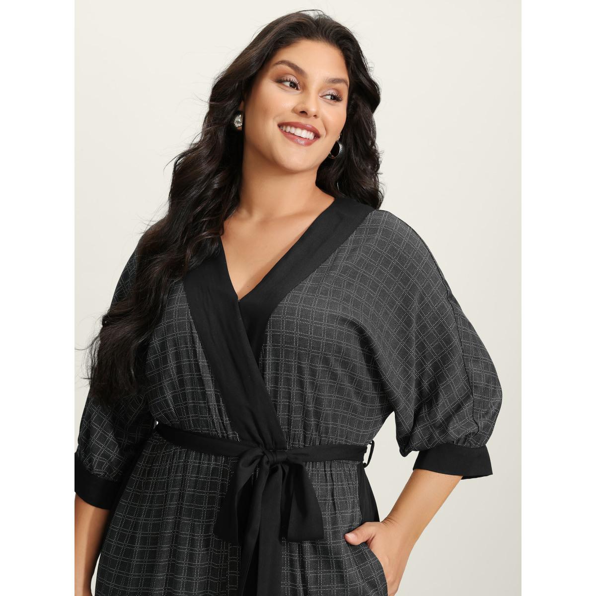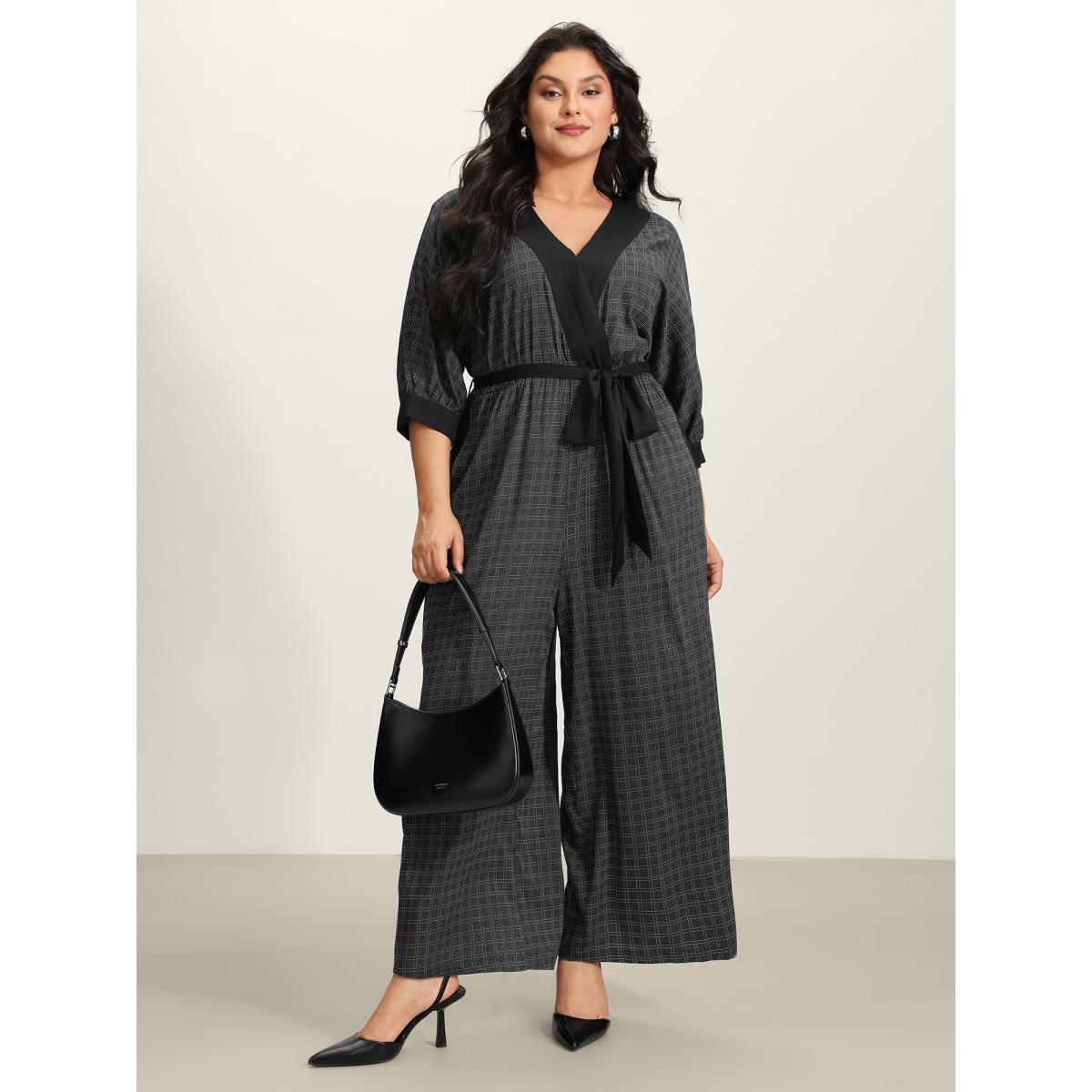 Plus Size BlackFlower Stretchy Rayon Plaid Pockets Belt Jumpsuit Women Office Long Sleeve Overlap Collar Office Loose Jumpsuits BloomChic 12/L