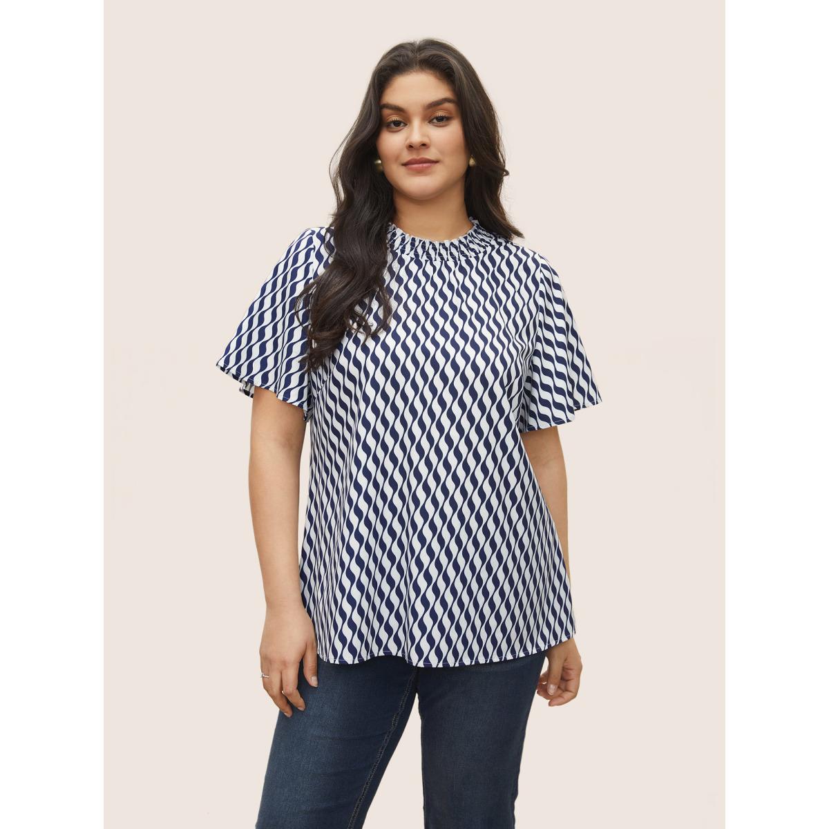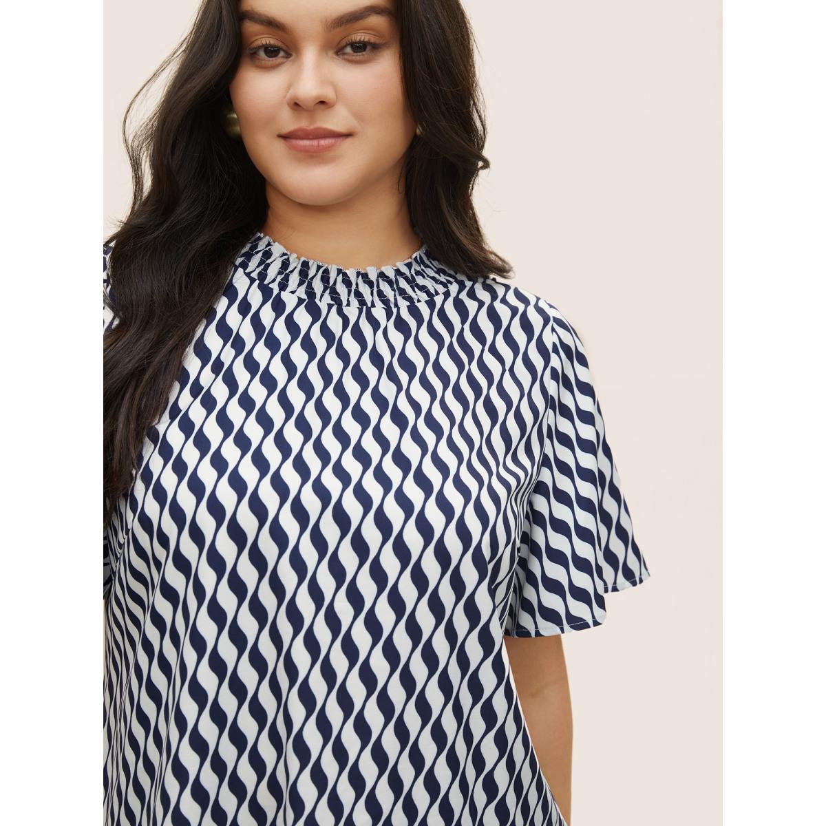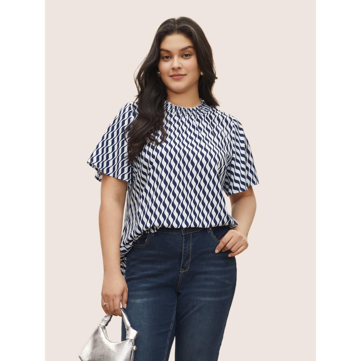 Plus Size Blue Geometric Mock Neck Shirred Ruffle Sleeve Blouse Women At the Office Short sleeve Mock Neck Work Blouses BloomChic 10/M