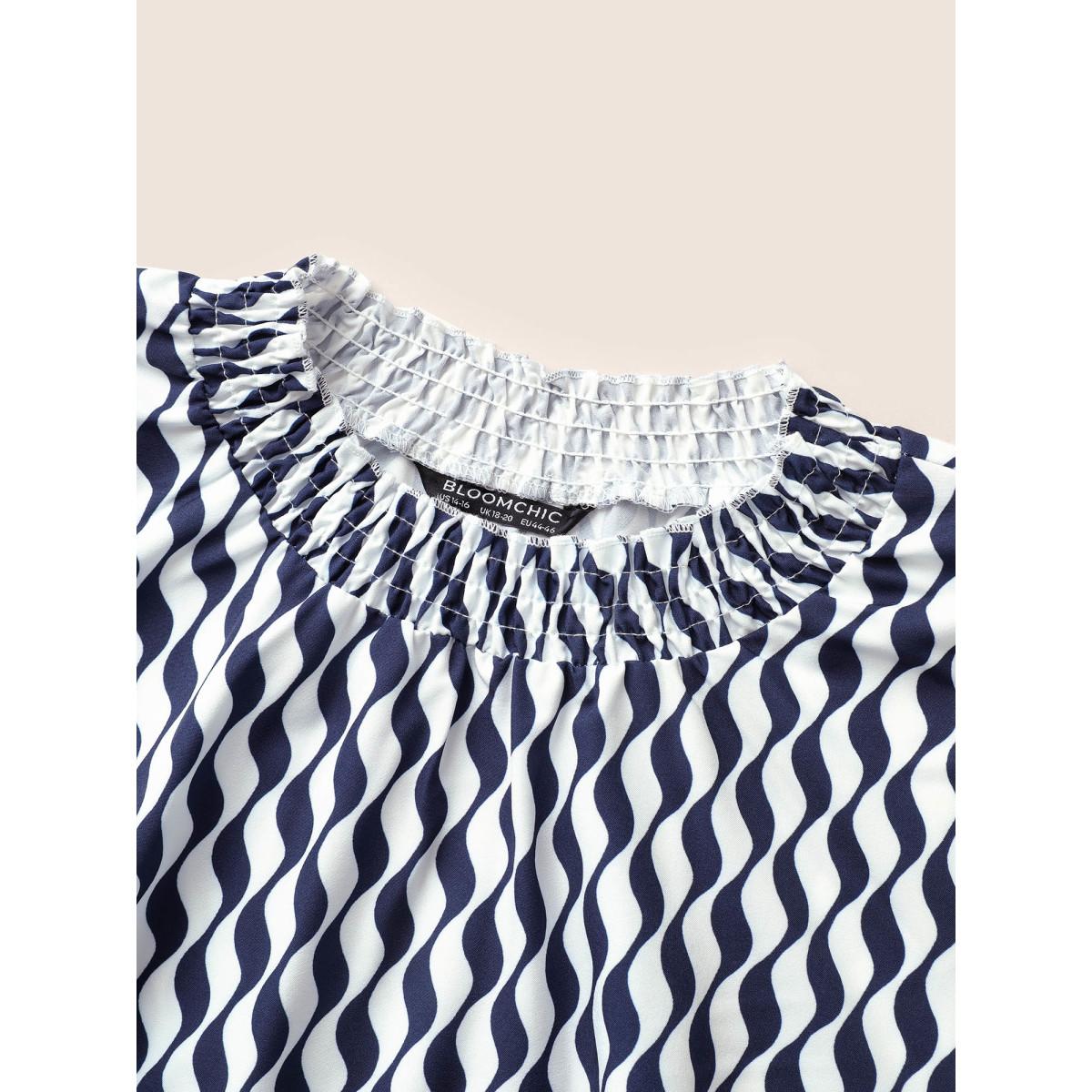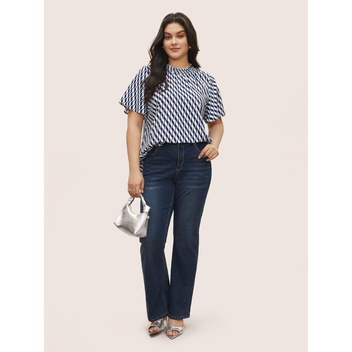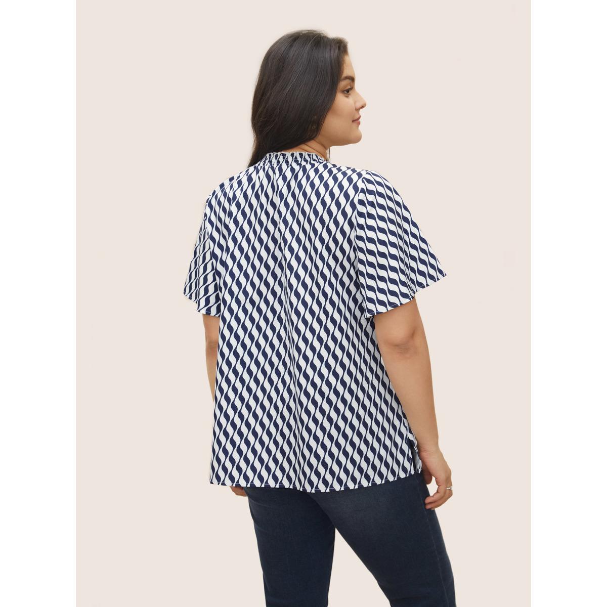 Plus Size Blue Geometric Mock Neck Shirred Ruffle Sleeve Blouse Women At the Office Short sleeve Mock Neck Work Blouses BloomChic 10/M