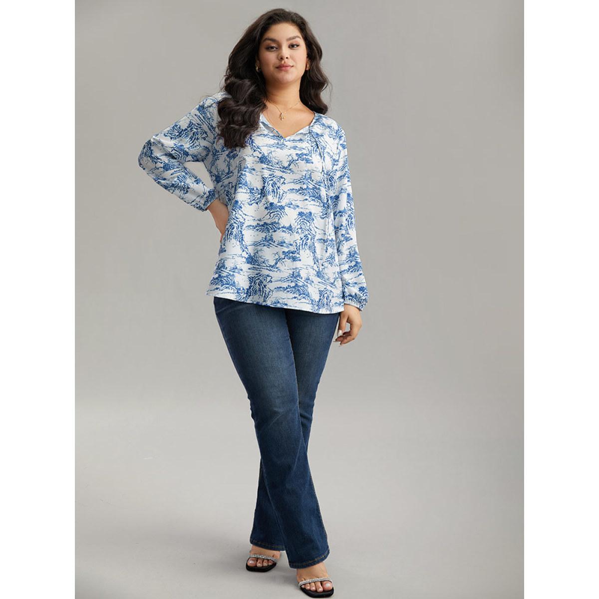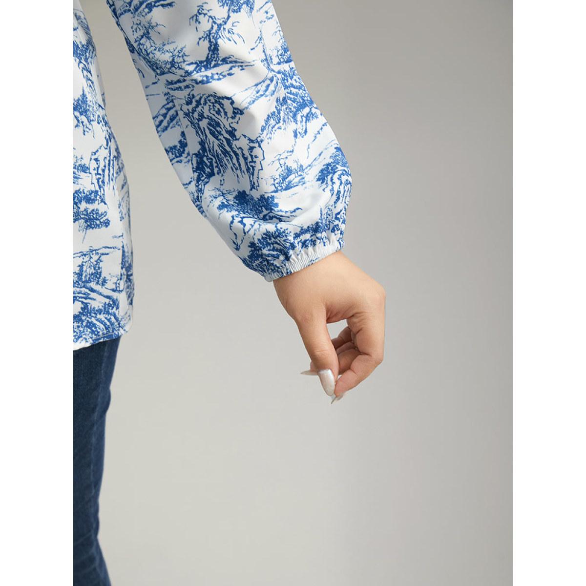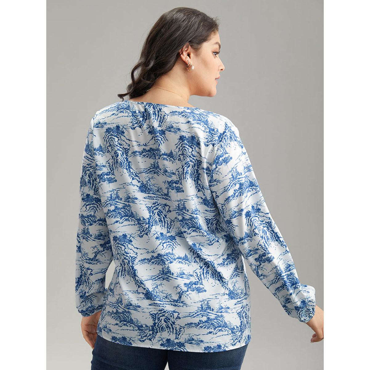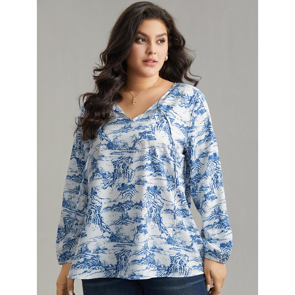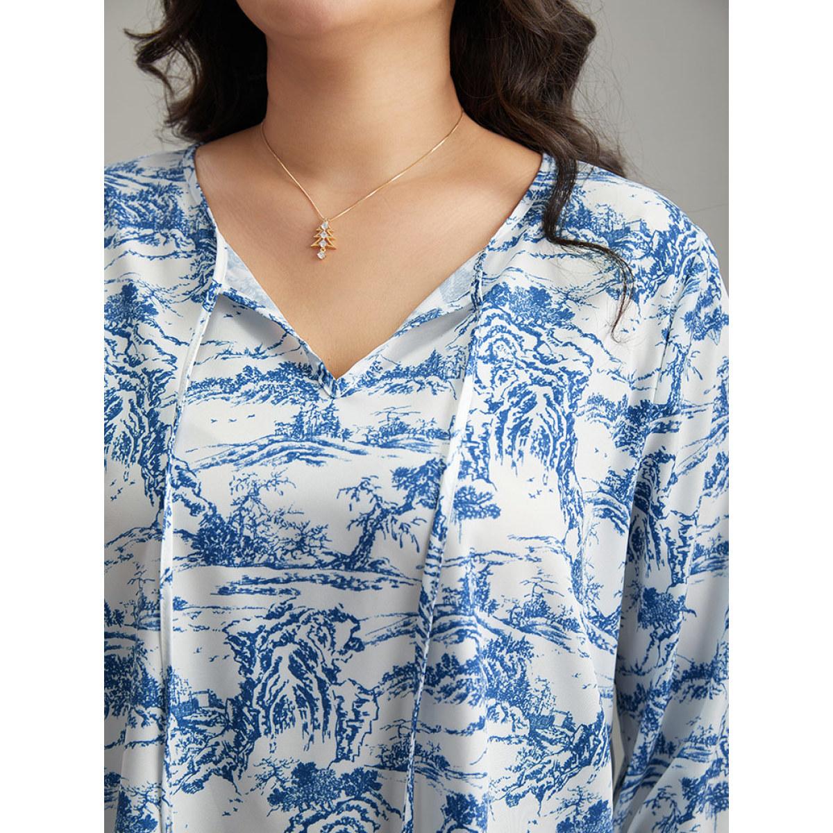 Plus Size Blue Landscape Print Tie Neck Blouse Women Elegant Long Sleeve Tie Neck Dailywear Blouses BloomChic 18-20/2X