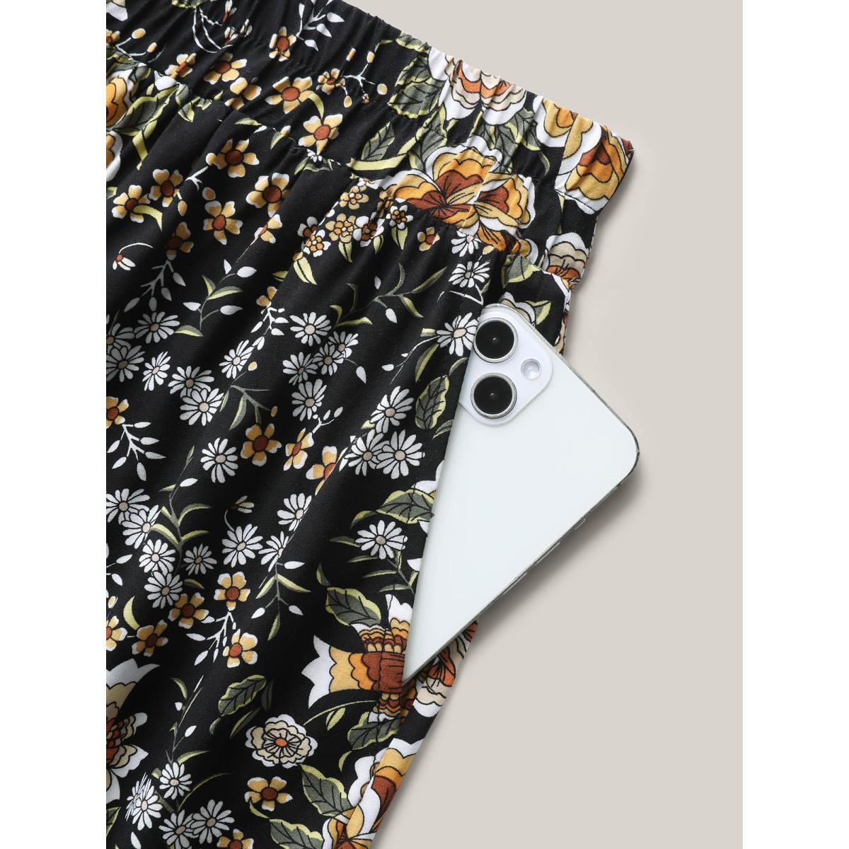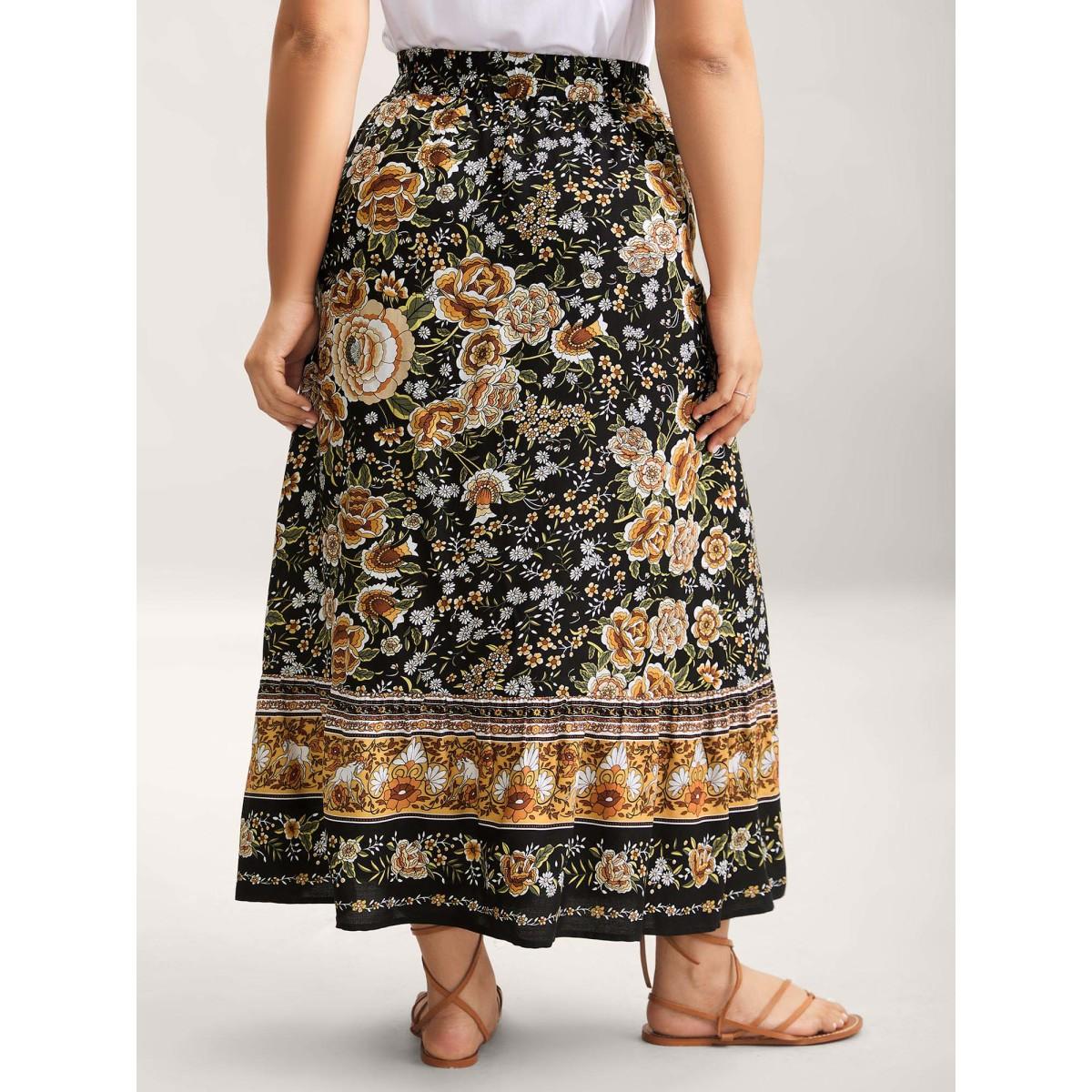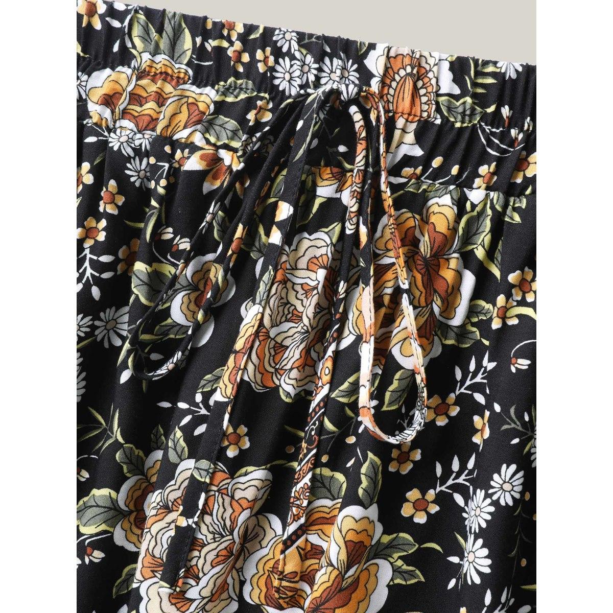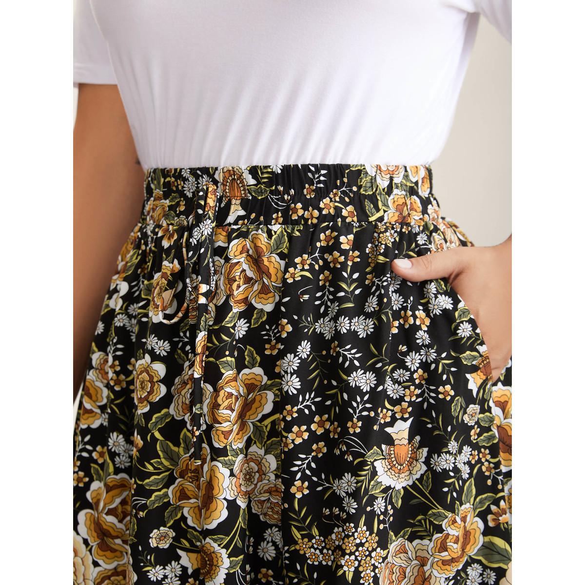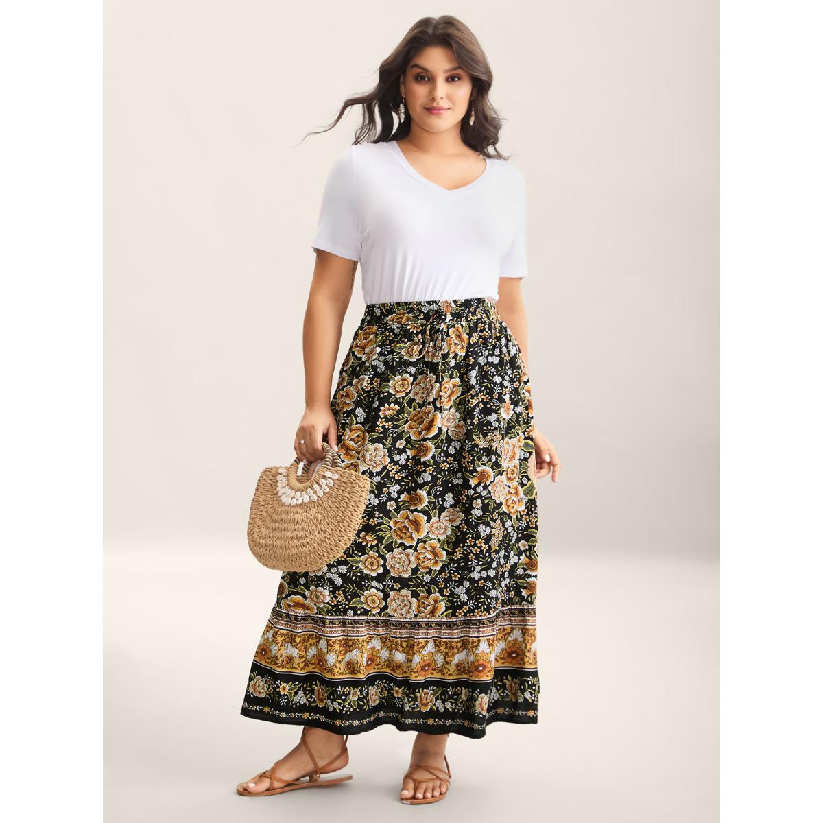 Plus Size Boho Floral Print Drawstring Maxi Dress Women BlackFlower Resort Drawstring Bodycon Low stretch Slanted pocket Vacation Skirts BloomChic 18-20/2X