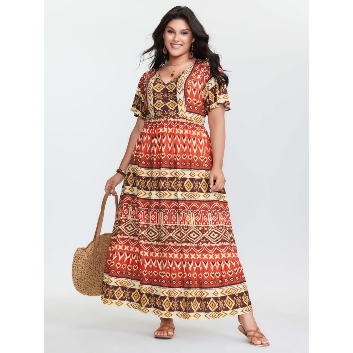 Plus Size Boho Floral Print Flared Sleeve Maxi Dress Multicolor Women Boho V-neck Short sleeve Curvy BloomChic 14-16/1X