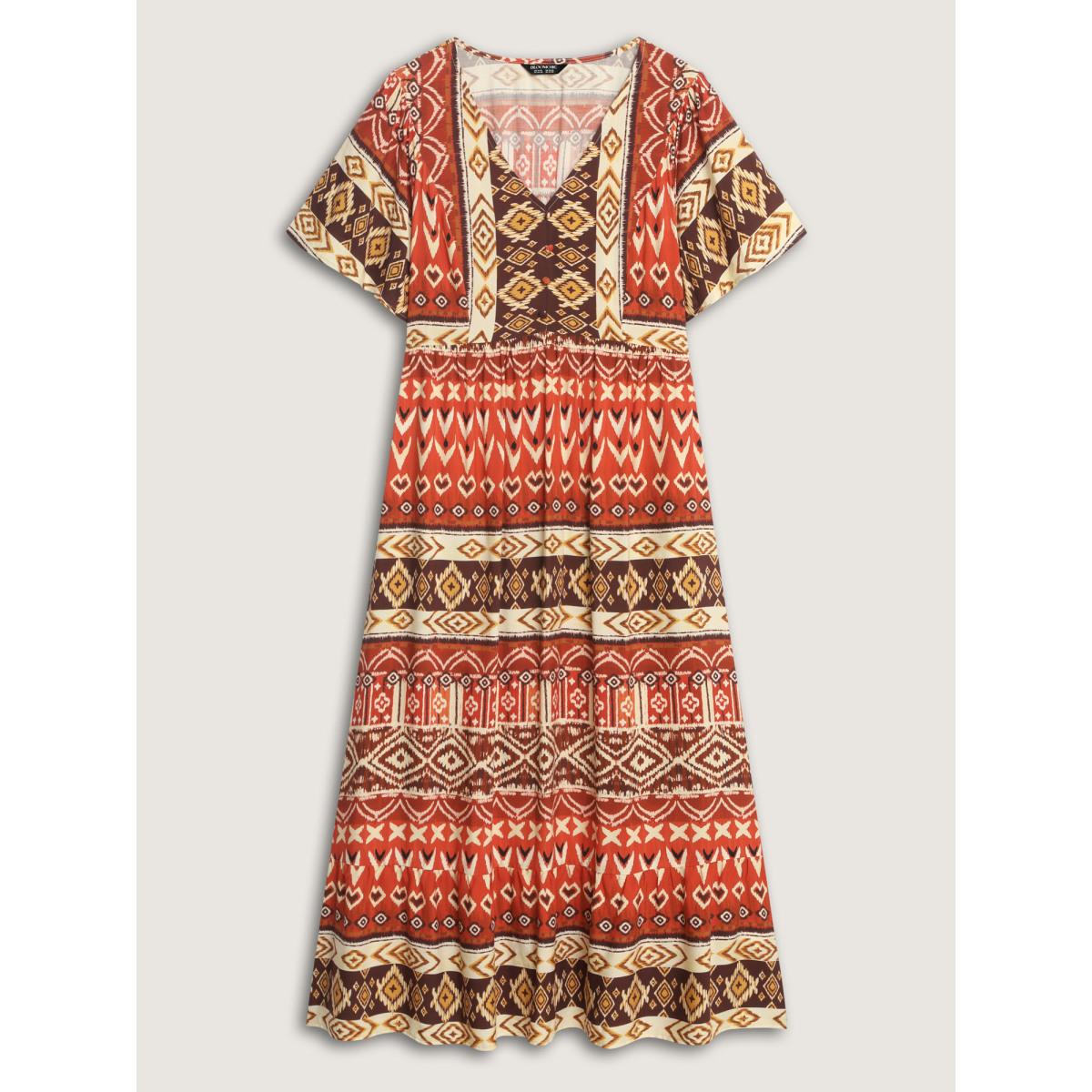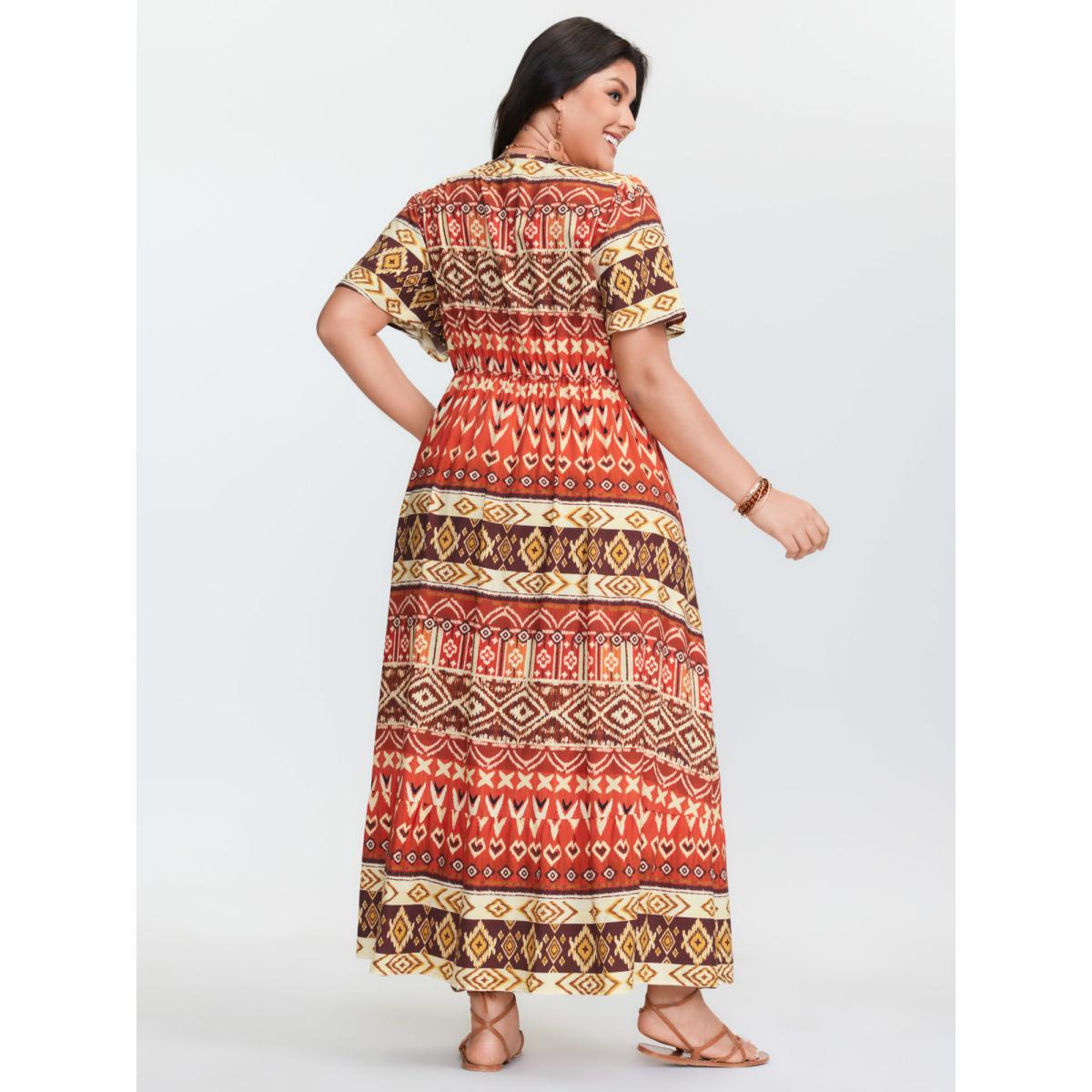Plus Size Boho Print Overlap Hem Belted Midi Dress Multicolor Women Overlapping Overlap Collar Short sleeve Curvy BloomChic 12/L